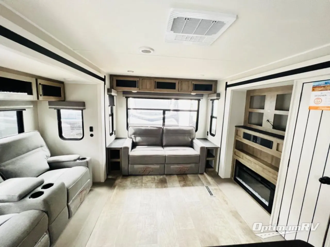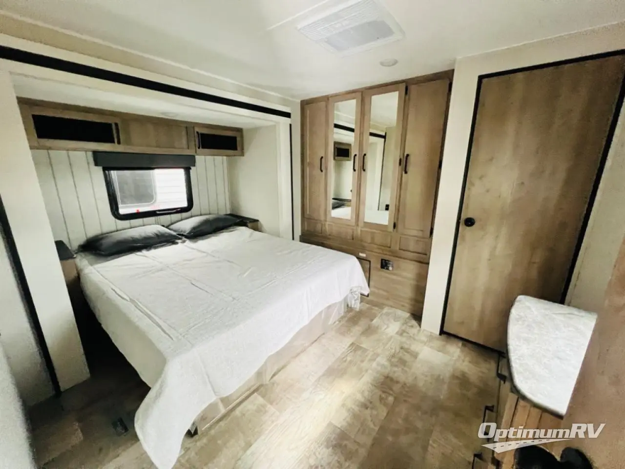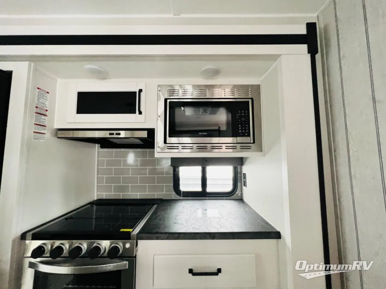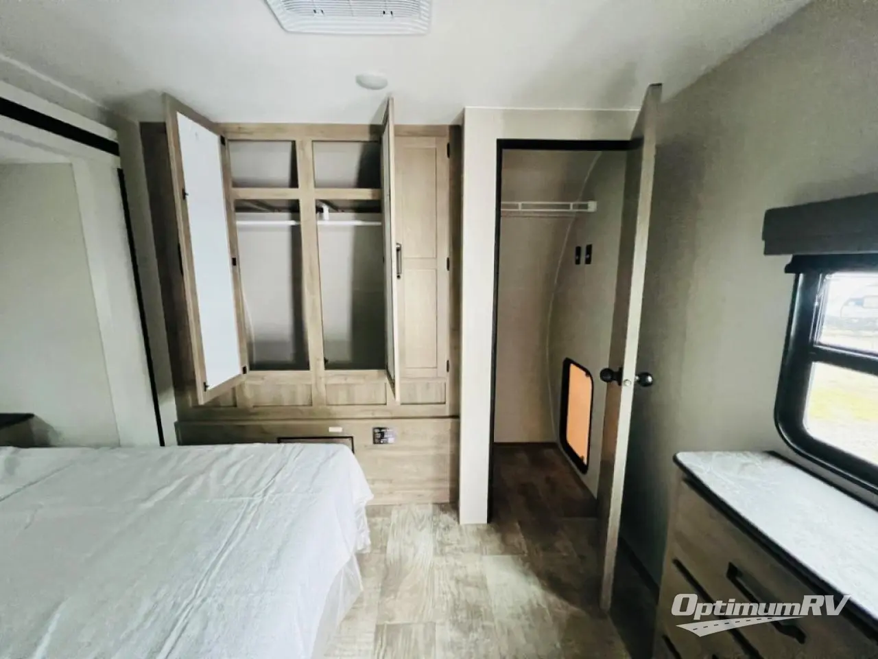 You're going to feel right at home in this travel trailer! The front private bedroom has a queen bed slide for a good night's rest, a dresser and front closet for your clothes, and another closet that is prepped to add an optional washer and dryer. Freshen up each morning in the full bathroom with the 32" x 40" shower with a seat and then head to the kitchen to fry up some eggs on the three burner cooktop. You will also appreciate having a kitchen island for easier meal prep and a walk-in pantry to easily see your canned goods and snacks. The booth dinette offers a comfortable place to dine, play, and even sleep once converted. What better way to wind down your nights than to relax on either the rear sofa or in one of the two recliners across from the entertainment center with the option to add a fireplace!