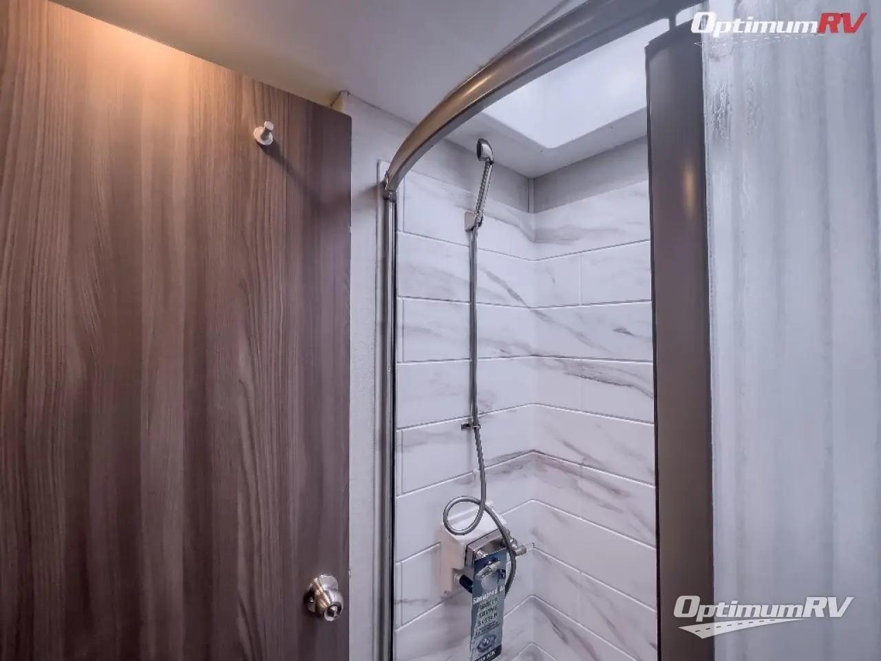 Experience a comfortable road trip in this motorhome! You will get a good night's rest on the two rear twin 31" x 76" beds that can convert into a king bed with a privacy curtain and two closets to store your clothes. After a long day of traveling, rinse the day off in the 24" x 32" shower while another uses the private toilet and sink. Fill your bellies with delicious home cooked meals with the two burner cooktop and 12V refrigerator then enjoy them at the theater seating with removable table slide. There is extra sleeping space with the 30" x 80" bunk over cab and the built-in skylight above it adds extra natural lighting!