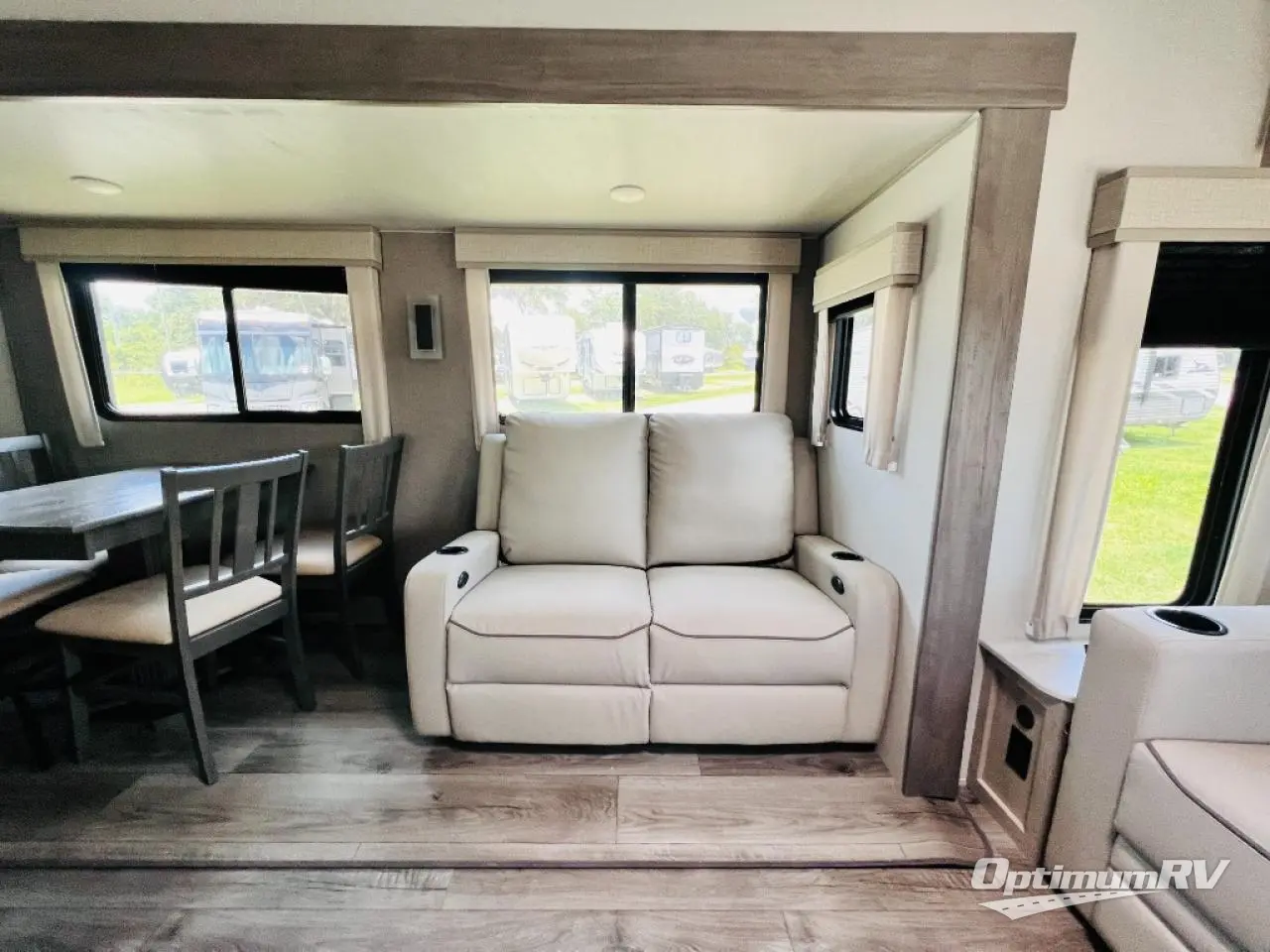 It's not hard to find comfort in this travel trailer with its triple slides, theater seating, and spacious full bath. Once your crew is settled and unpacked, head outdoors to relax under the two power awnings with multicolored LED lights, or grab the fishing poles from the exterior storage and head to the water. If you'd rather spend your day inside you'll find all the comforts of home; theater seating, a sofa and booth dinette, plus a fully equipped kitchen, complete with a kitchen island! You will love having your own space in the front bedroom that includes a queen bed slide out, a dresser, plus two closets. There is even washer and dryer prep if you plan to go full-time!