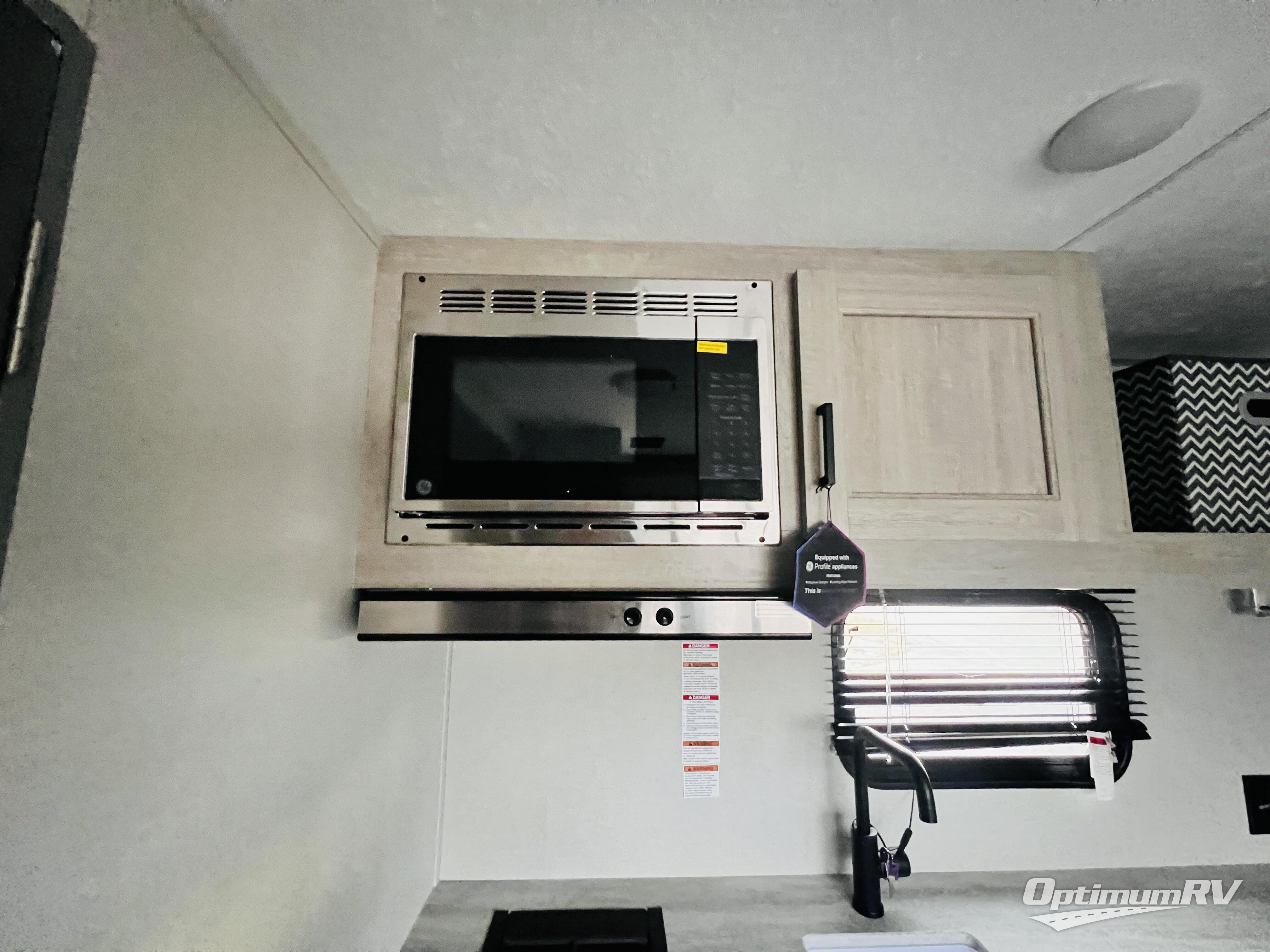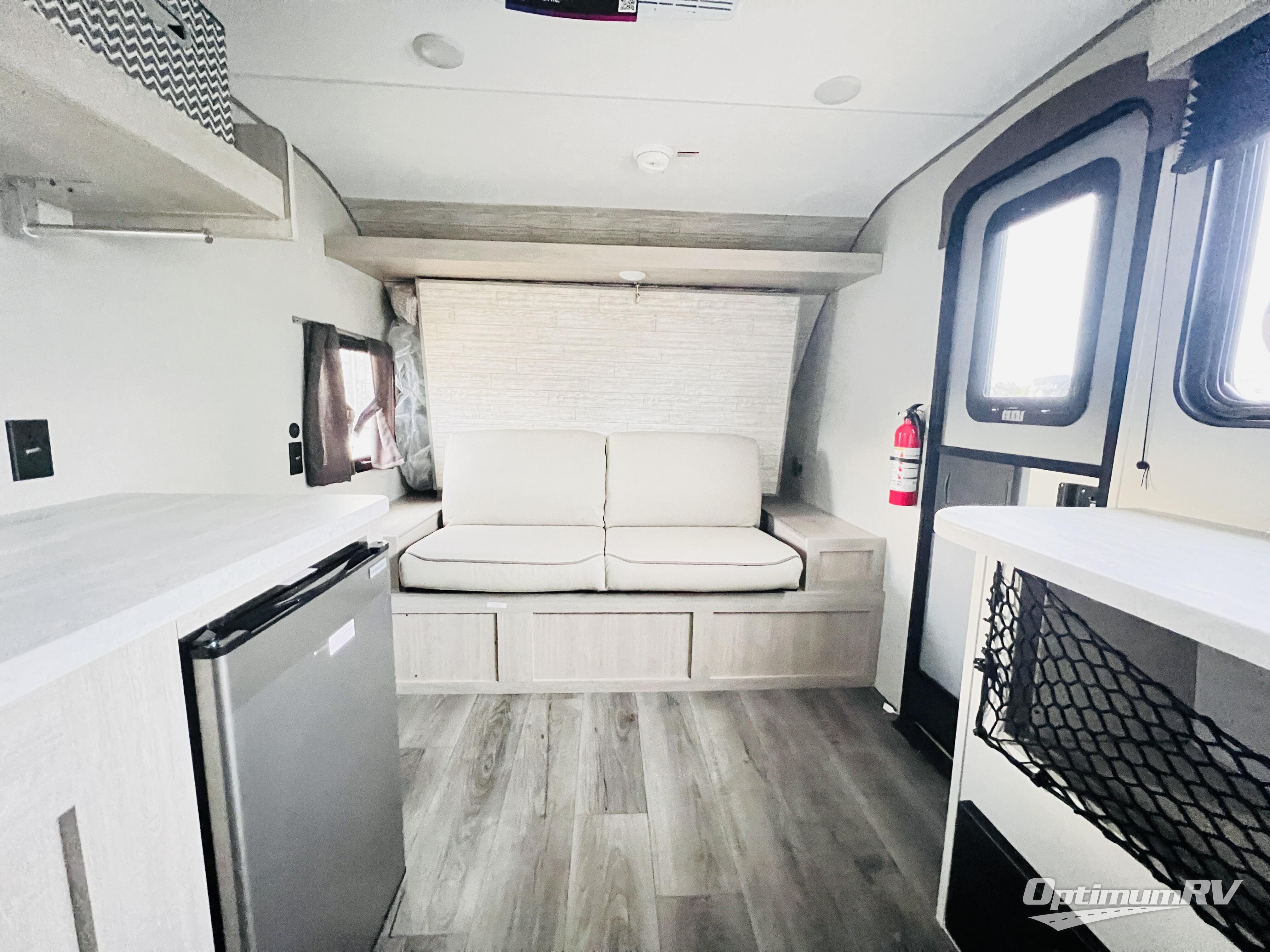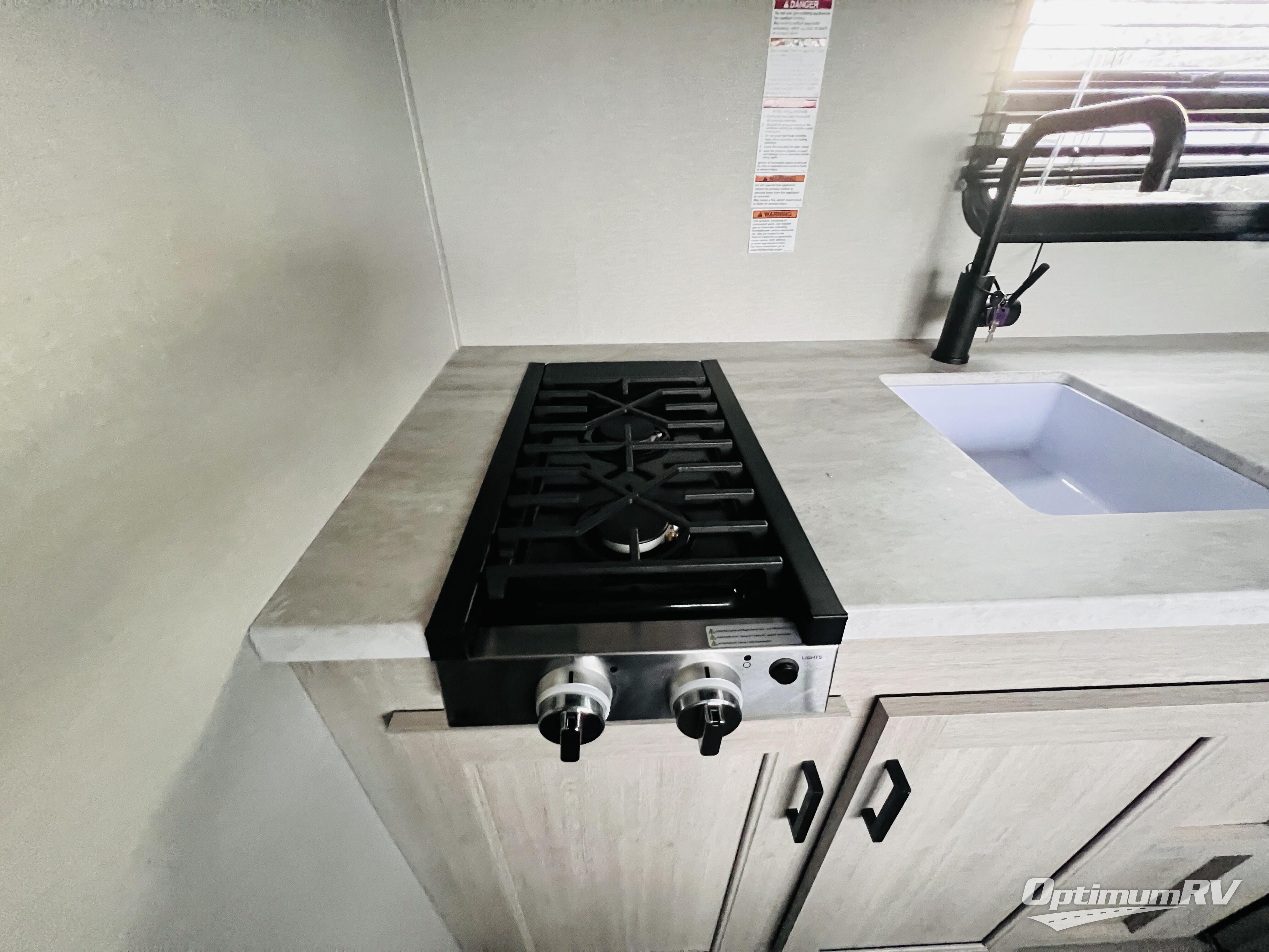 This couple's trailer will be perfect for all your outdoor adventures! There is a 60" x 74" Murphy bed up front with dual nightstands to keep your things tidy, and in the morning, you can fold up the bed to relax on the sofa. The bar top with two stools also includes storage below, plus there is a pantry and overhead storage for even more storage space. A full rear bath includes a 36" x 30" shower, a 12V 14" bath power vent fan, a marine toilet with foot flush, plus a linen closet to keep clean towels close by. This model also includes full kitchen amenities, including a GE two burner cooktop, a GE stainless microwave oven, plus a 3.3 cu. ft. 12V refrigerator to keep food fresh!