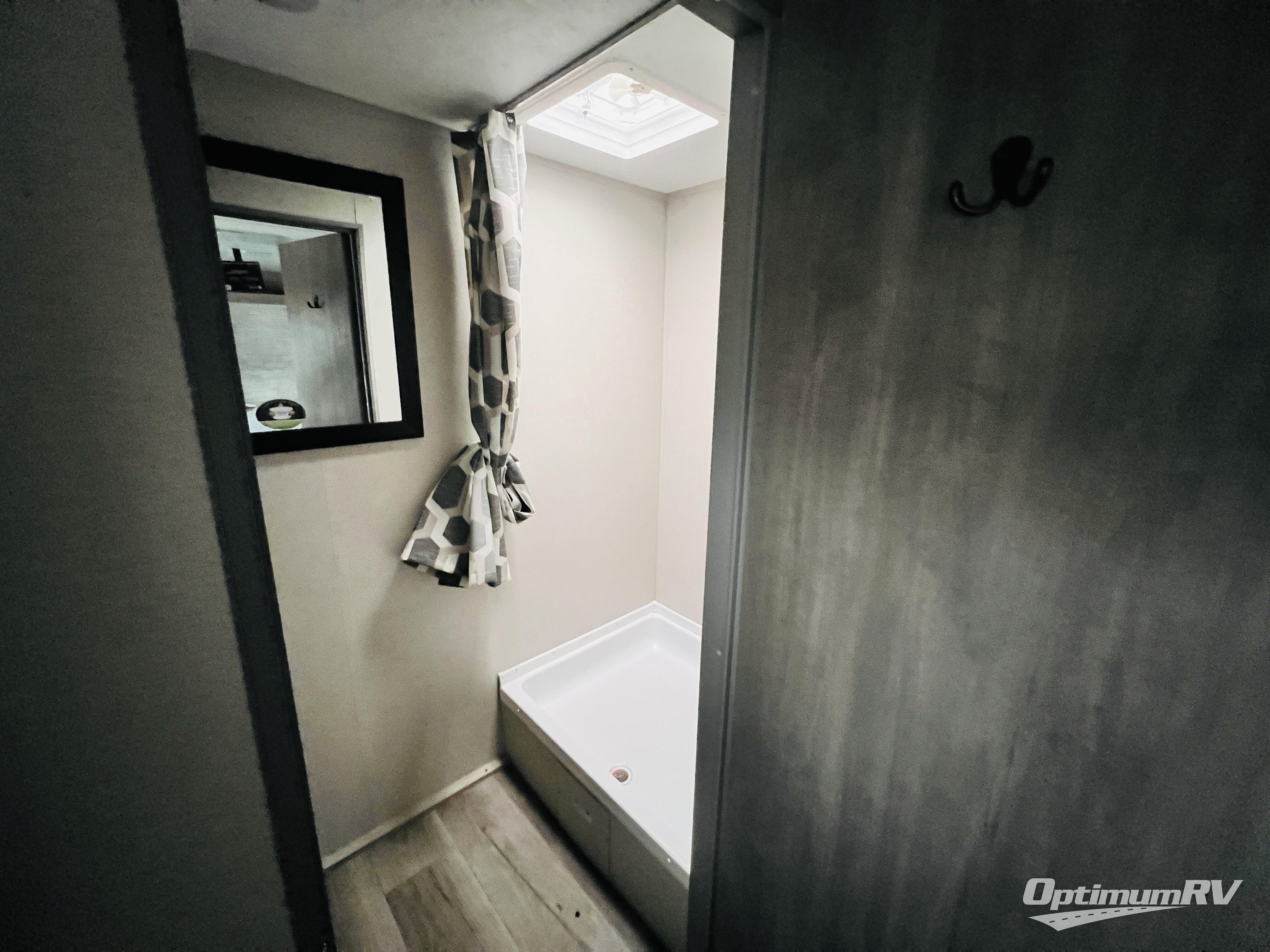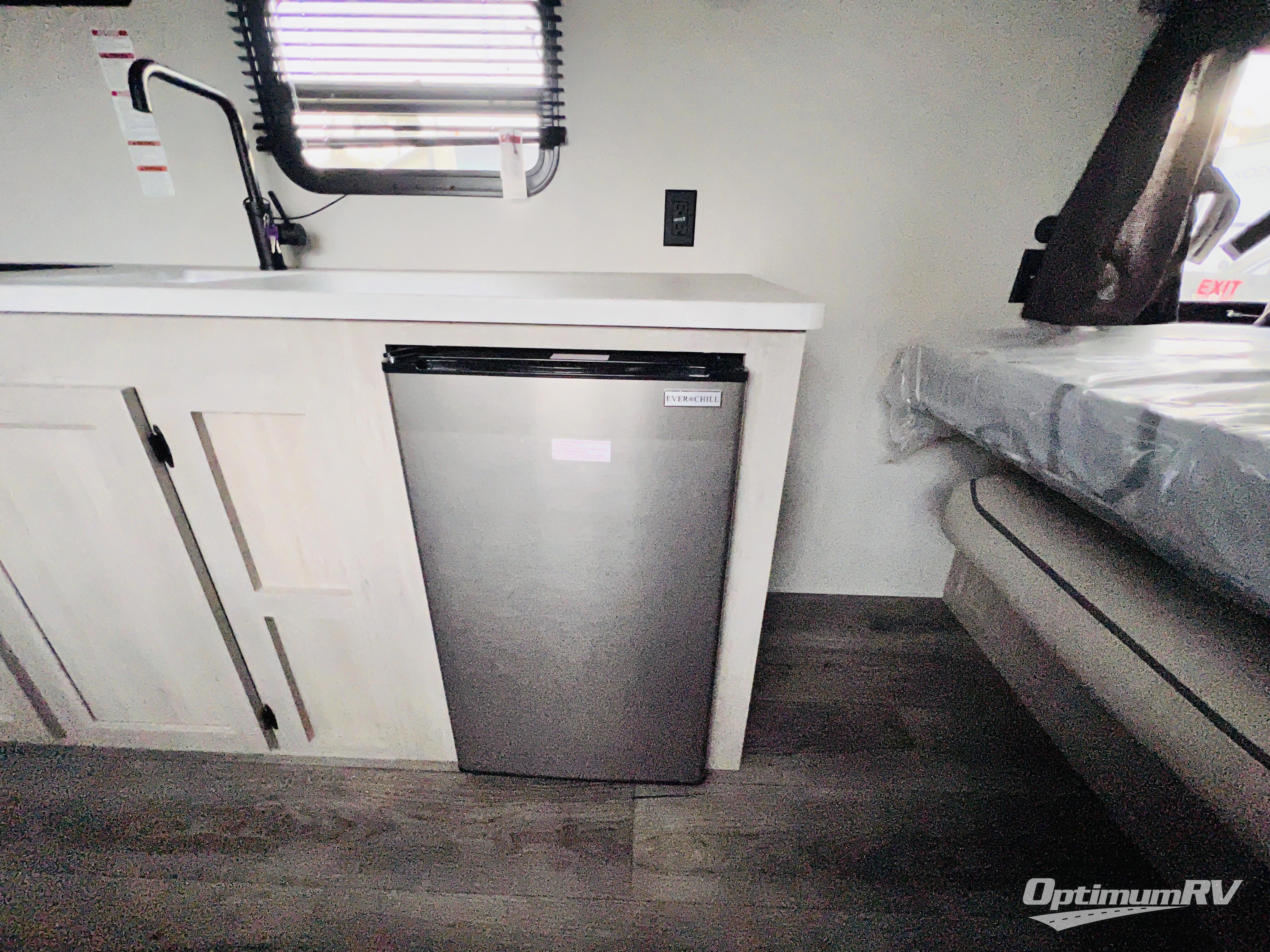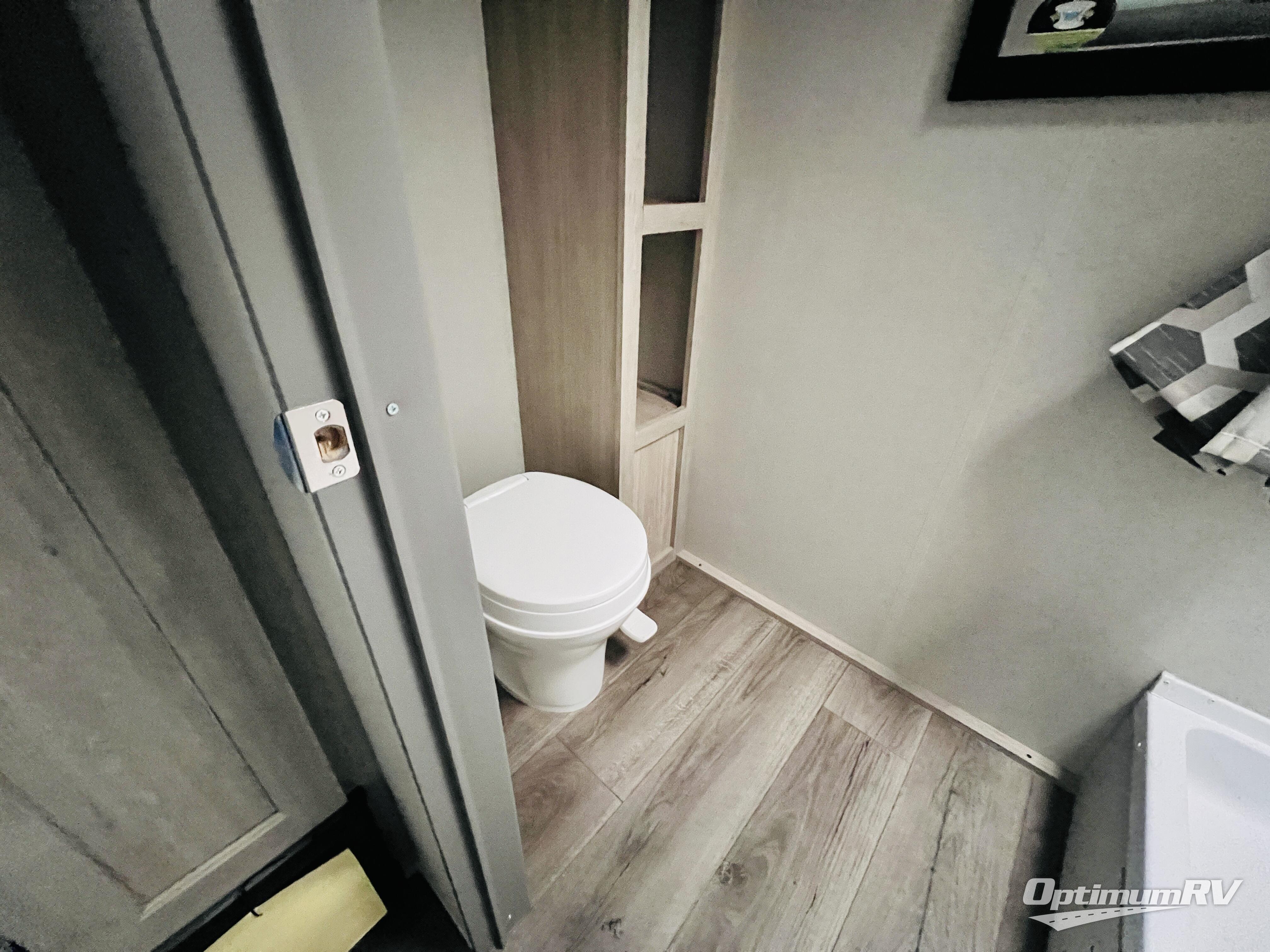 This couple's trailer will be perfect for all your outdoor adventures! There is a 60" x 74" Murphy bed up front with dual nightstands to keep your things tidy, and in the morning, you can fold up the bed to relax on the sofa. The bar top with two stools also includes storage below, plus there is a pantry and overhead storage for even more storage space. A full rear bath includes a 36" x 30" shower, a 12V 14" bath power vent fan, a marine toilet with foot flush, plus a linen closet to keep clean towels close by. This model also includes full kitchen amenities, including a GE two burner cooktop, a GE stainless microwave oven, plus a 3.3 cu. ft. 12V refrigerator to keep food fresh!