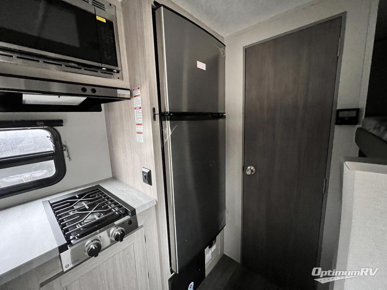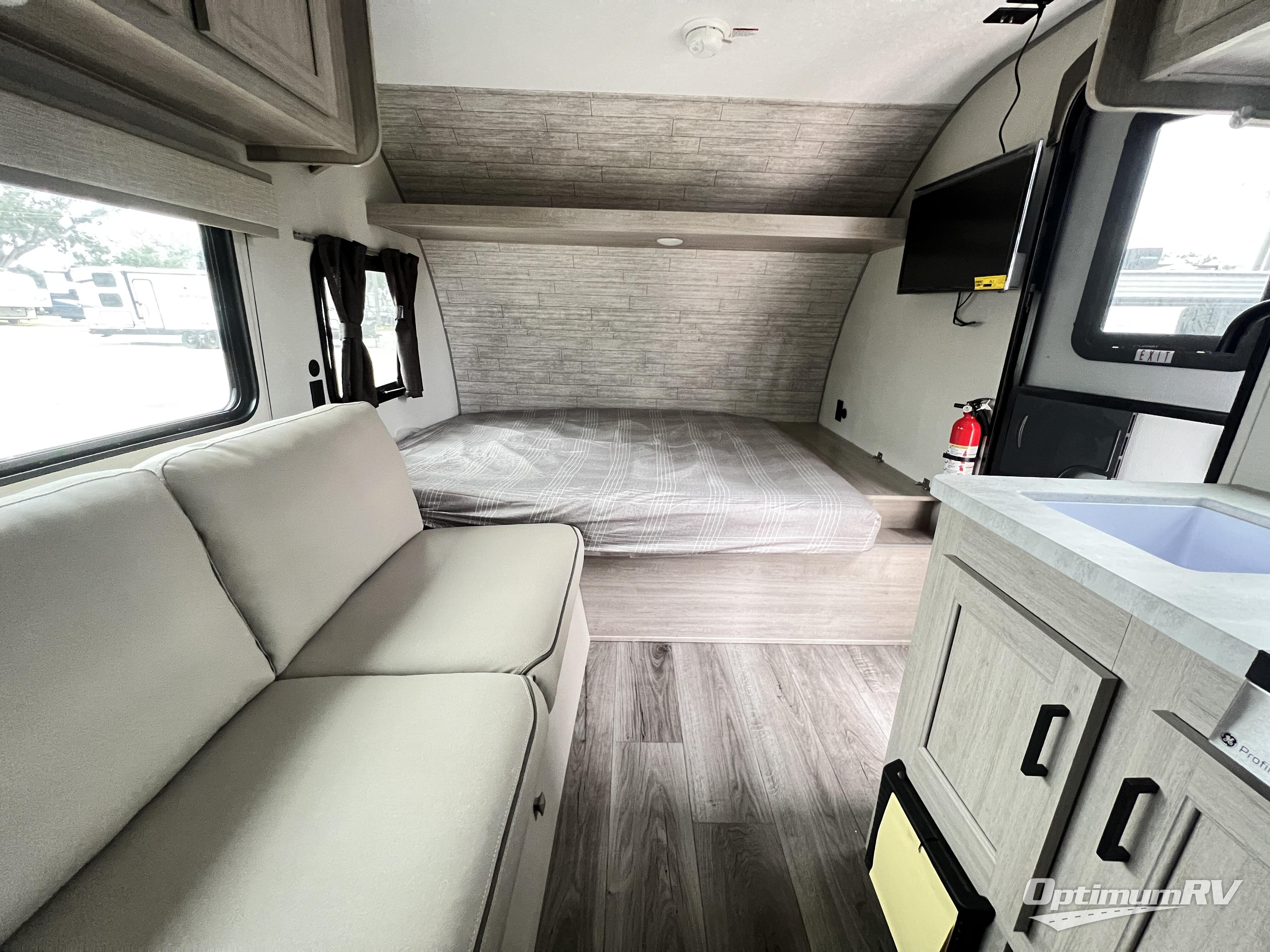 This travel trailers is perfect for a young family or smaller group. You can easily sleep four or more with the rear set of bunk beds and queen bed up front. There is also a 60" sofa for inside down-time, as well as complete kitchen and bath amenities so you can cook and stay clean while traveling. The rear corner bath features a toilet and 36" x 30" shower, and it's conveniently located next to the bunk beds which is great for little ones at night. Cooking inside will be easy with a GE stainless two-burner cooktop and single sink, plus there is also a GE microwave oven for snacks and things that you can easily warm up. If you plan to spend most of your time outdoors, you will find plenty of storage space in the front exterior storage compartment, and there is also plenty of storage inside as well.