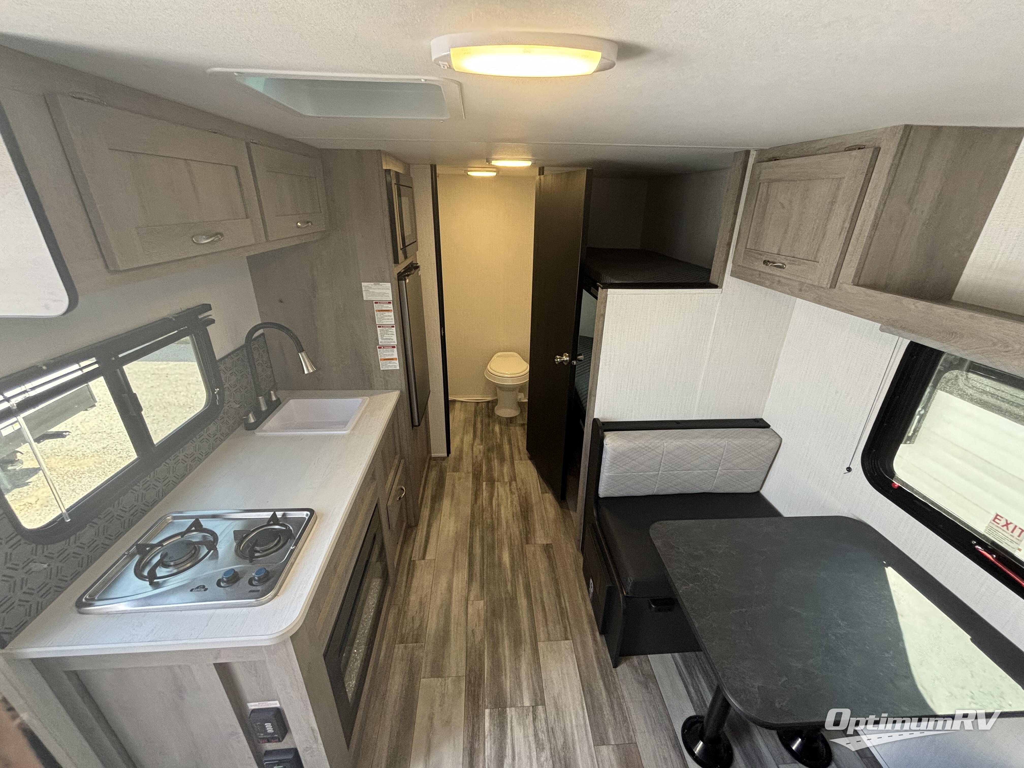 This cozy bunk model has exactly what you need for a fun camping trip to your favorite campgrounds! The rear corner bunks will be a delight for the children, and if there are more than two, you can always fold down the booth dinette for one or two more depending on size. A queen bed up front will offer comfortable sleeping for two more which means this unit can sleep four to six. The rear corner private shower and toilet will keep you from having to use the campground facilities, and the location next to the bunks is handy for little ones at night. Cooking will also be a breeze with a two burner cooktop, sink, and refrigerator for your perishables so you don't have to rely on cooking over an open fire if you don't want to. Save the fire for the s'mores! You also have a handy awning for outdoor protection, and exterior storage as well.
