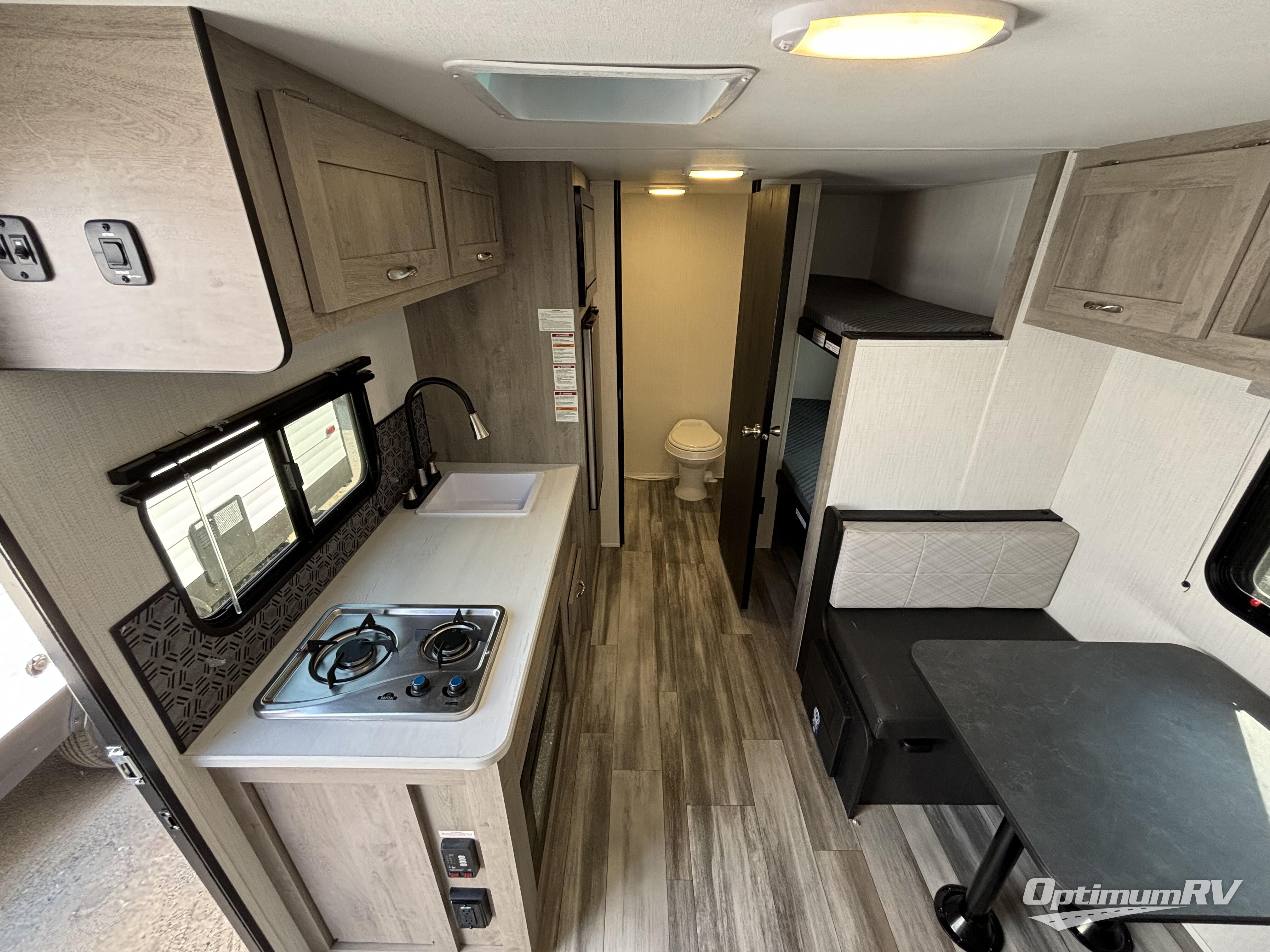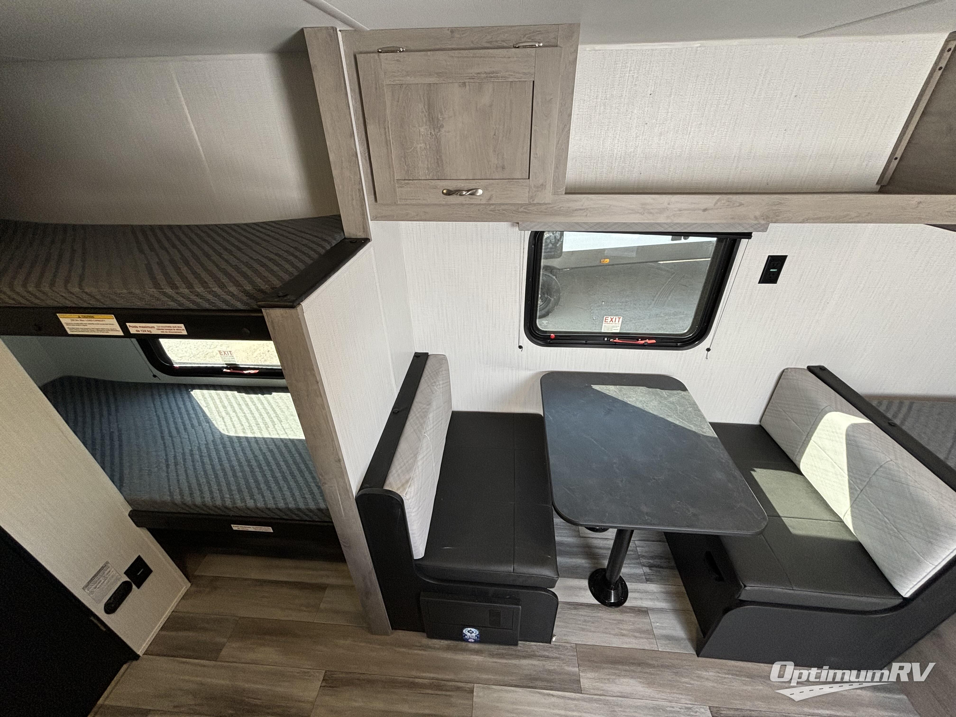 This cozy bunk model has exactly what you need for a fun camping trip to your favorite campgrounds! The rear corner bunks will be a delight for the children, and if there are more than two, you can always fold down the booth dinette for one or two more depending on size. A queen bed up front will offer comfortable sleeping for two more which means this unit can sleep four to six. The rear corner private shower and toilet will keep you from having to use the campground facilities, and the location next to the bunks is handy for little ones at night. Cooking will also be a breeze with a two burner cooktop, sink, and refrigerator for your perishables so you don't have to rely on cooking over an open fire if you don't want to. Save the fire for the s'mores! You also have a handy awning for outdoor protection, and exterior storage as well.