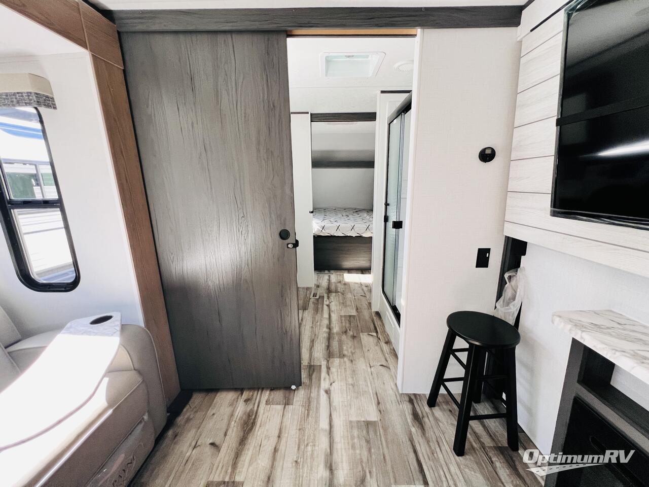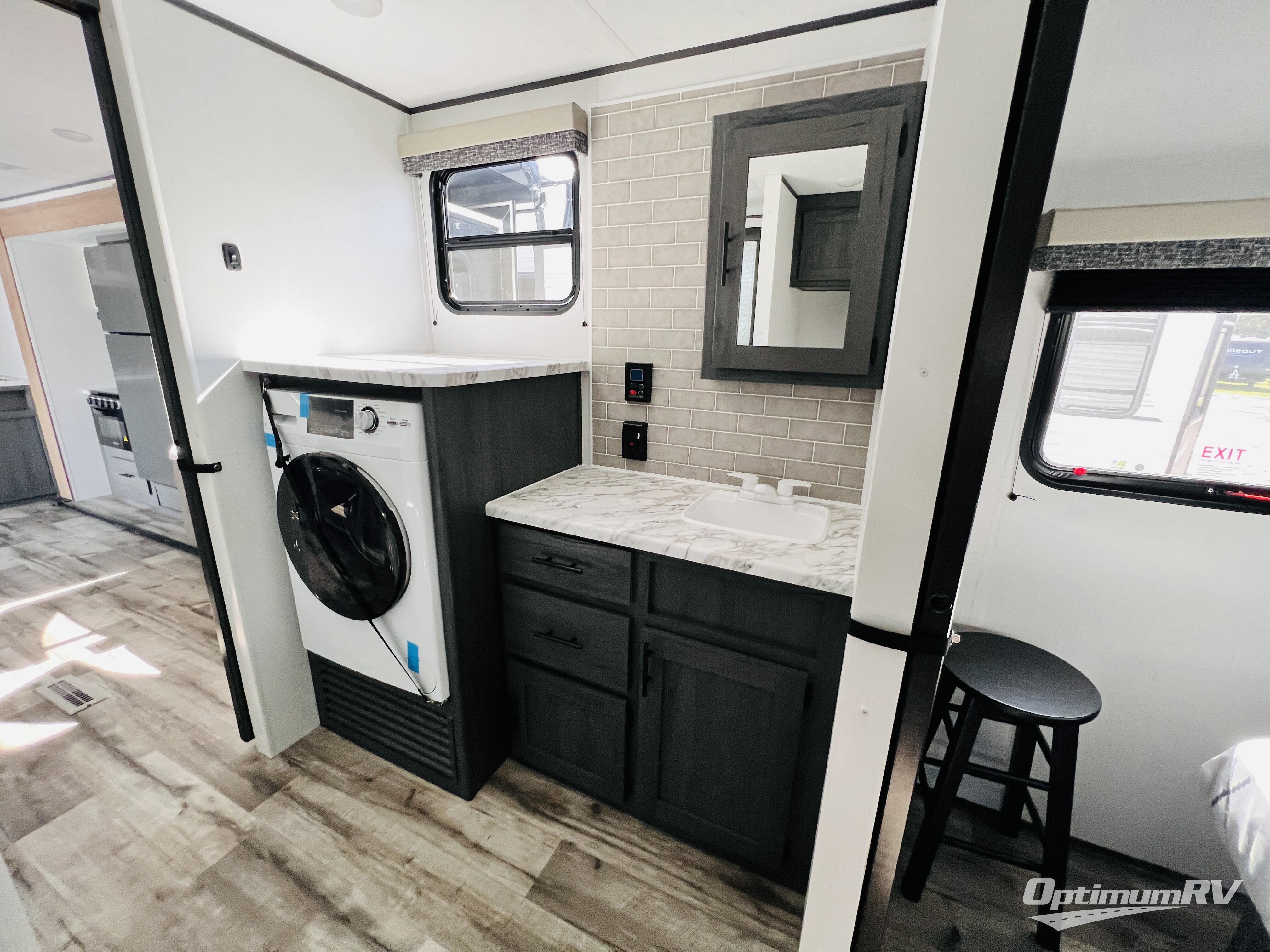 This unique travel trailer is one to remember! The rear wrap-around porch features ample space to entertain guests plus a peak-a-boo window with a fold-down bartop so those on the deck can visit with those inside. Once inside, you can relax on the theater seats with a flip top ottoman, and the fireplace will make this space more cozy. And check out the hidden Murphy bed behind the fireplace so guests can sleep over! A walk-thru bath is spacious so you can easily clean up each day, and the front master bedroom features a residential queen bed for all-around comfort.