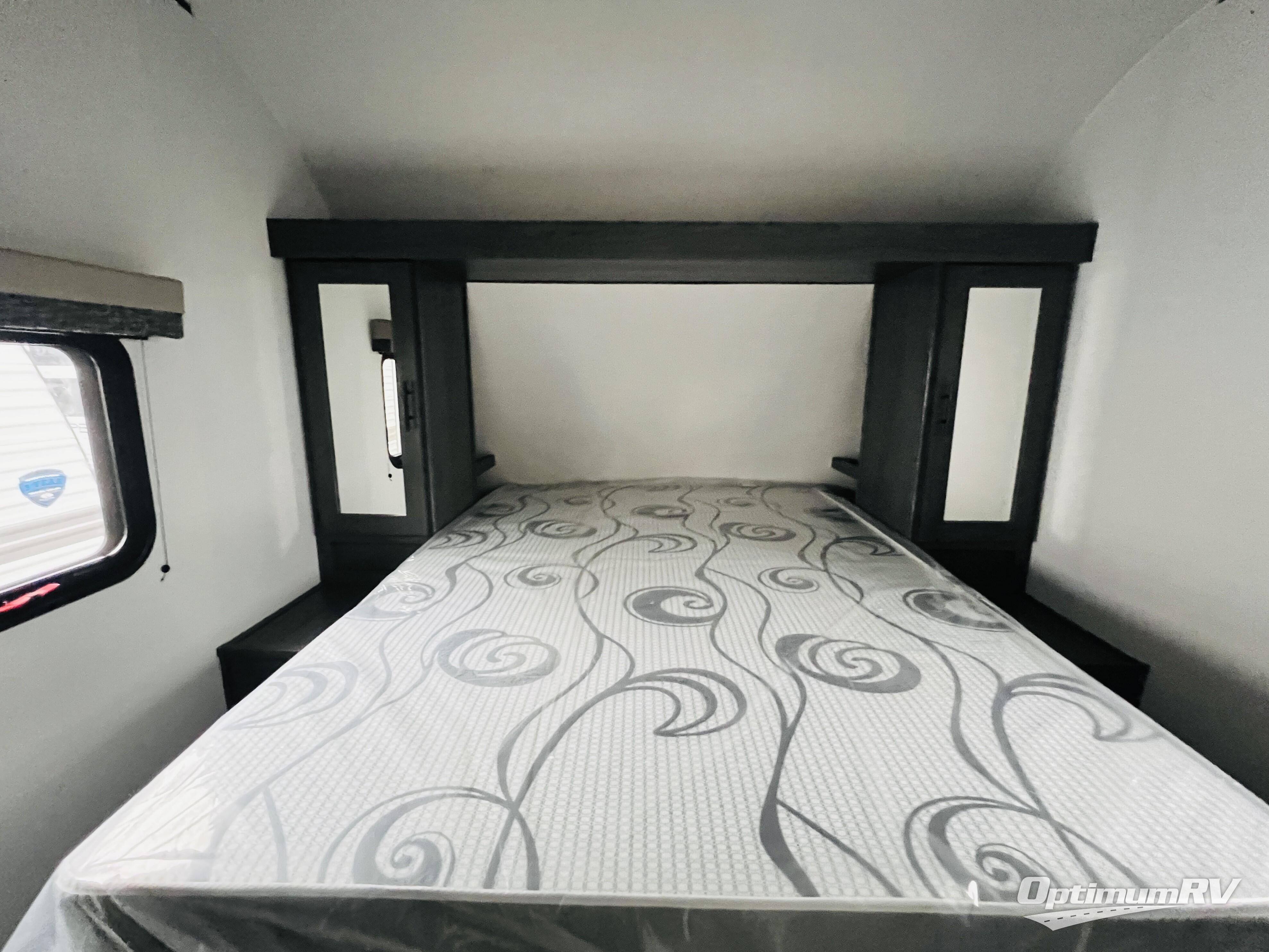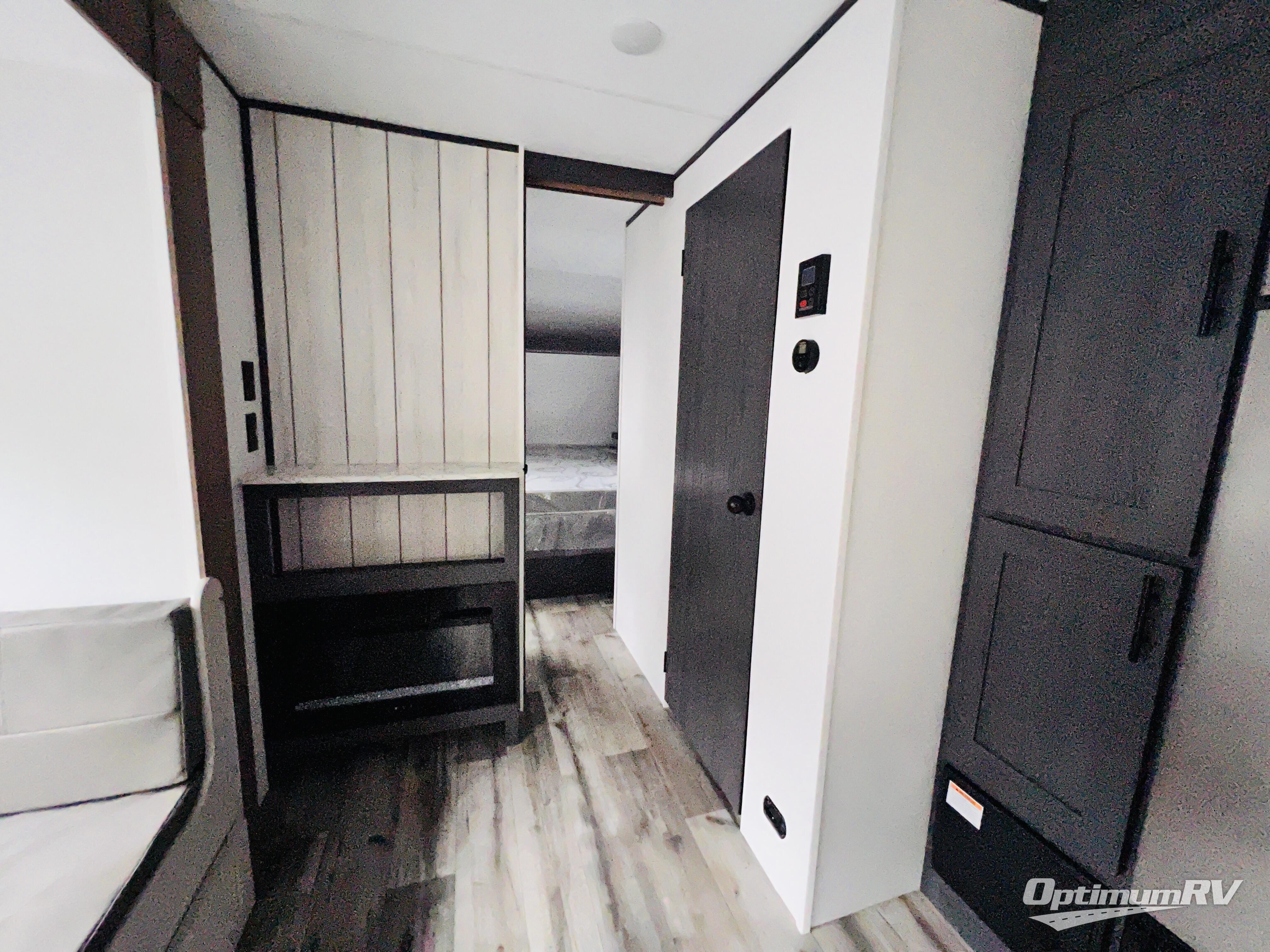 With dual entry doors, you can easily enter and exit this travel trailer! The jackknife sofa with footrest and booth dinette are next to each other near the fireplace, as well as two rear recliners allowing you to visit with other RVers or your family. The cook will have an oven and a microwave to make meals, and a 10 cu. ft. 12V refrigerator for cold items, plus a galley sink with high rise faucet to keep the dishes clean. Speaking of being clean, the full bathroom offers a shower with exhaust fan to eliminate unwanted steam as you clean yourself up after a fun day at the beach. The front private bedroom has a residential queen bed and one of the entrance/exit doors so you can slip out for an early morning fishing trip!