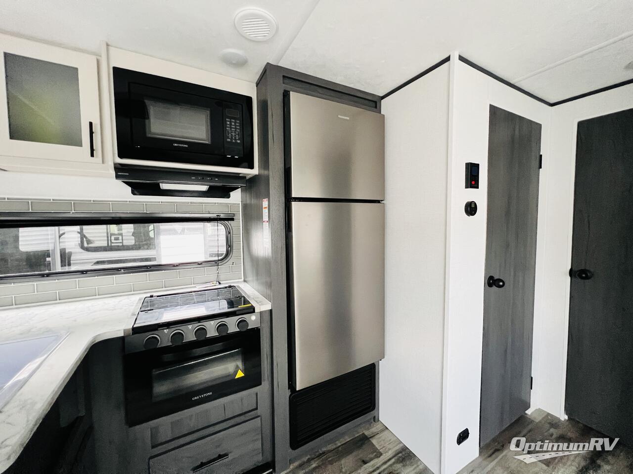 This travel trailer is one your whole crew will love! There is a rear private bunkhouse with double-size bunks for the little ones, a front private bedroom for you, and a booth dinette and jackknife sofa for even more sleeping space! The chef has their choice to cook indoors on the three burner range and microwave oven, or head outdoors to cook on the outdoor kitchen! The full bath will let everyone clean up each day, and the fireplace and large slide out will make your space feel more like home. And don't overlook the pass-through storage and 16' power awning with LED lights!