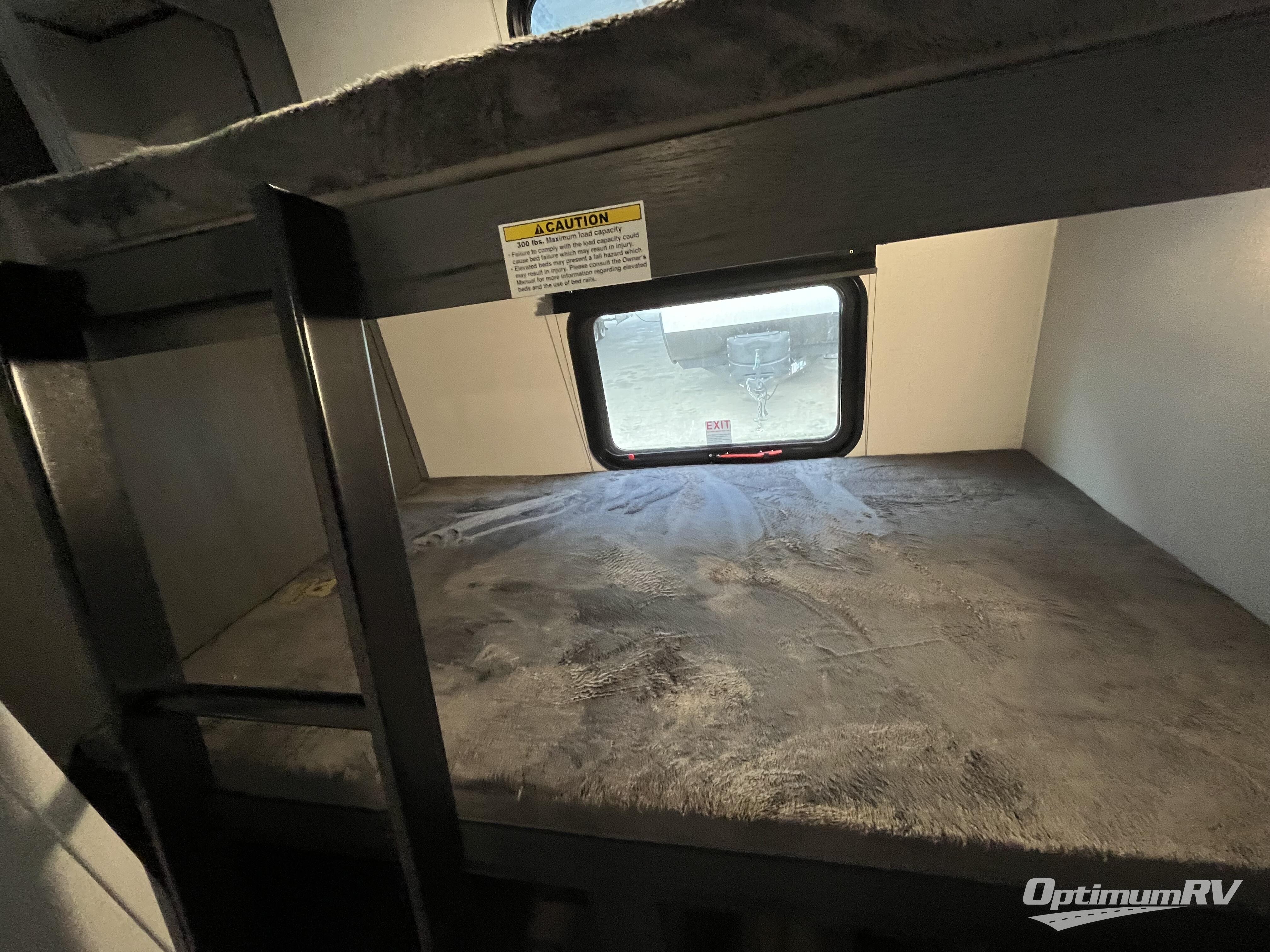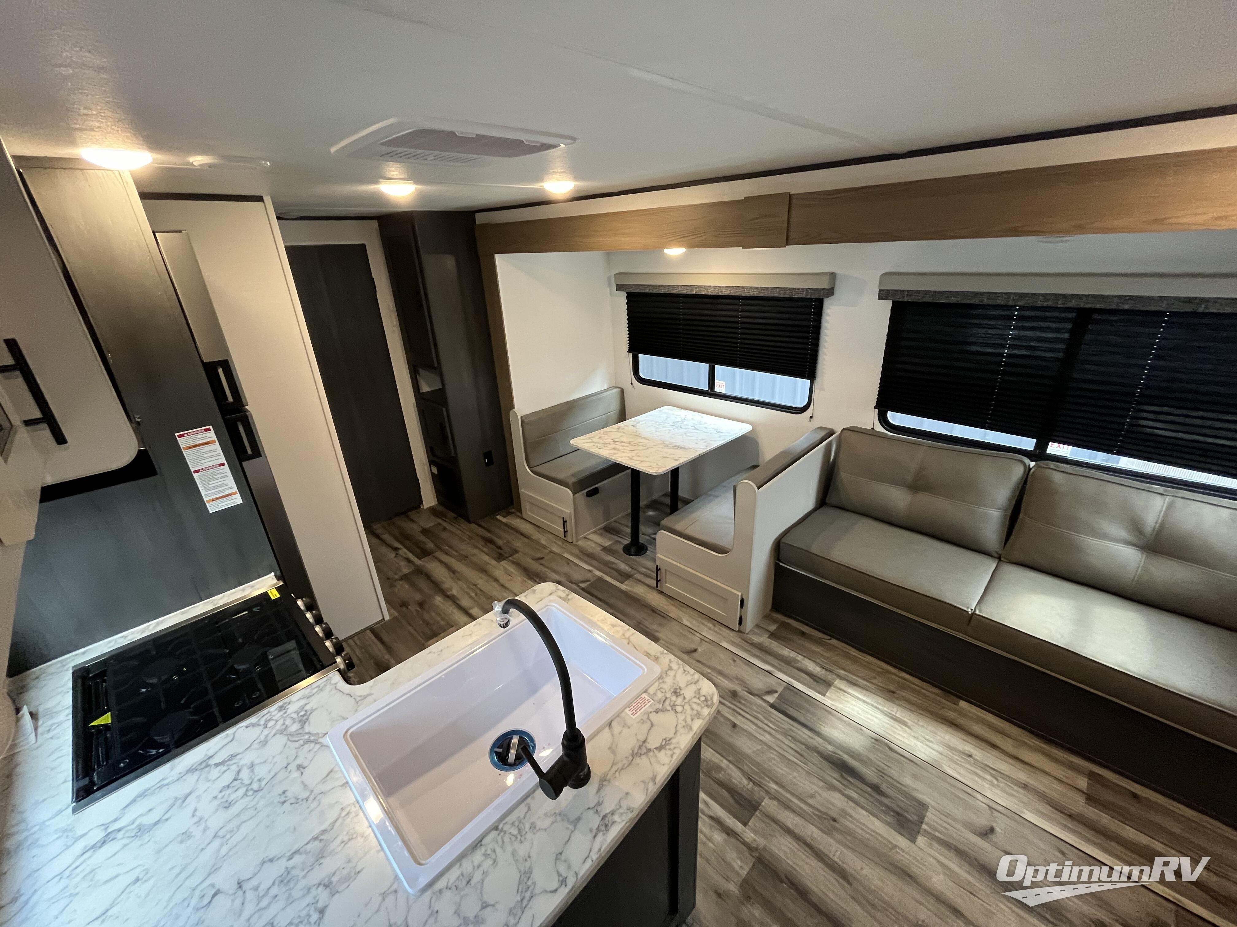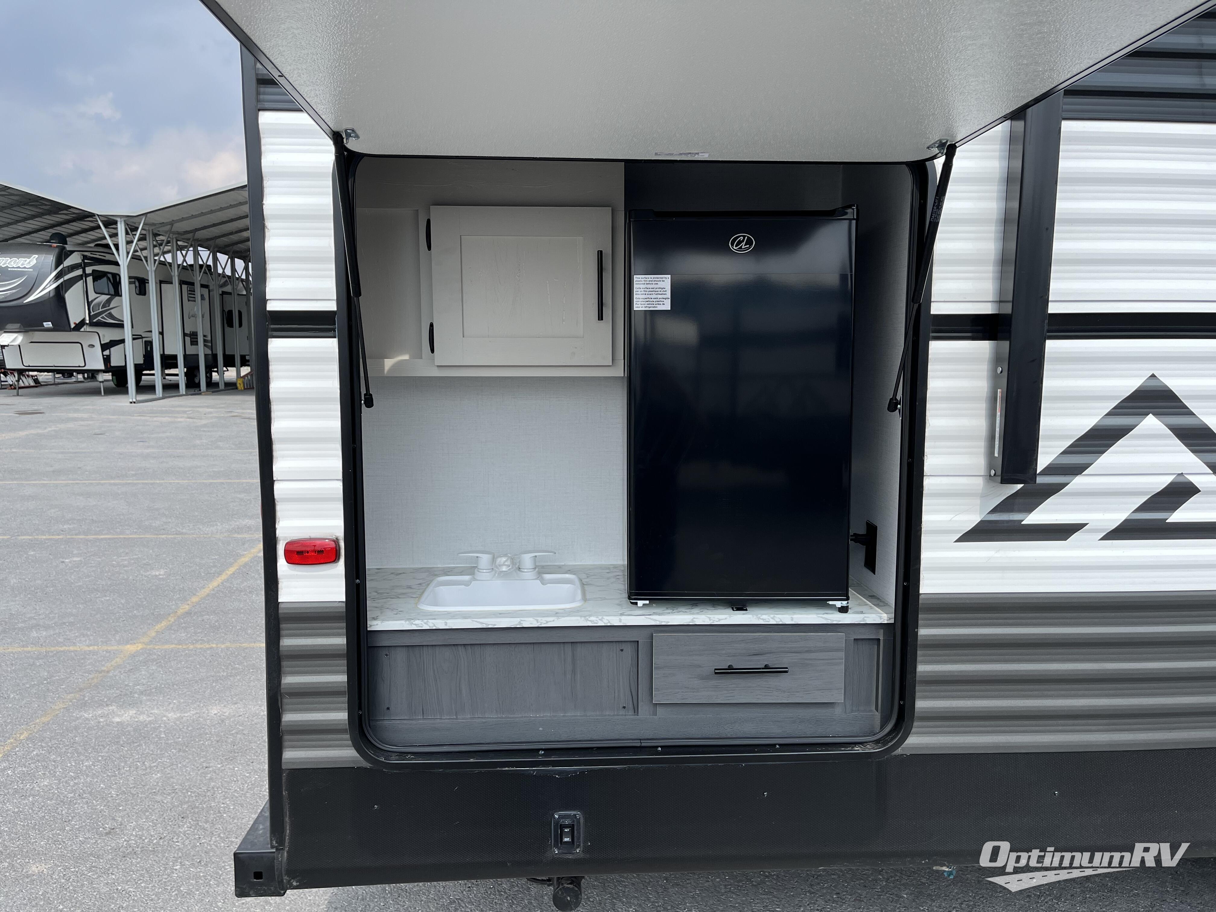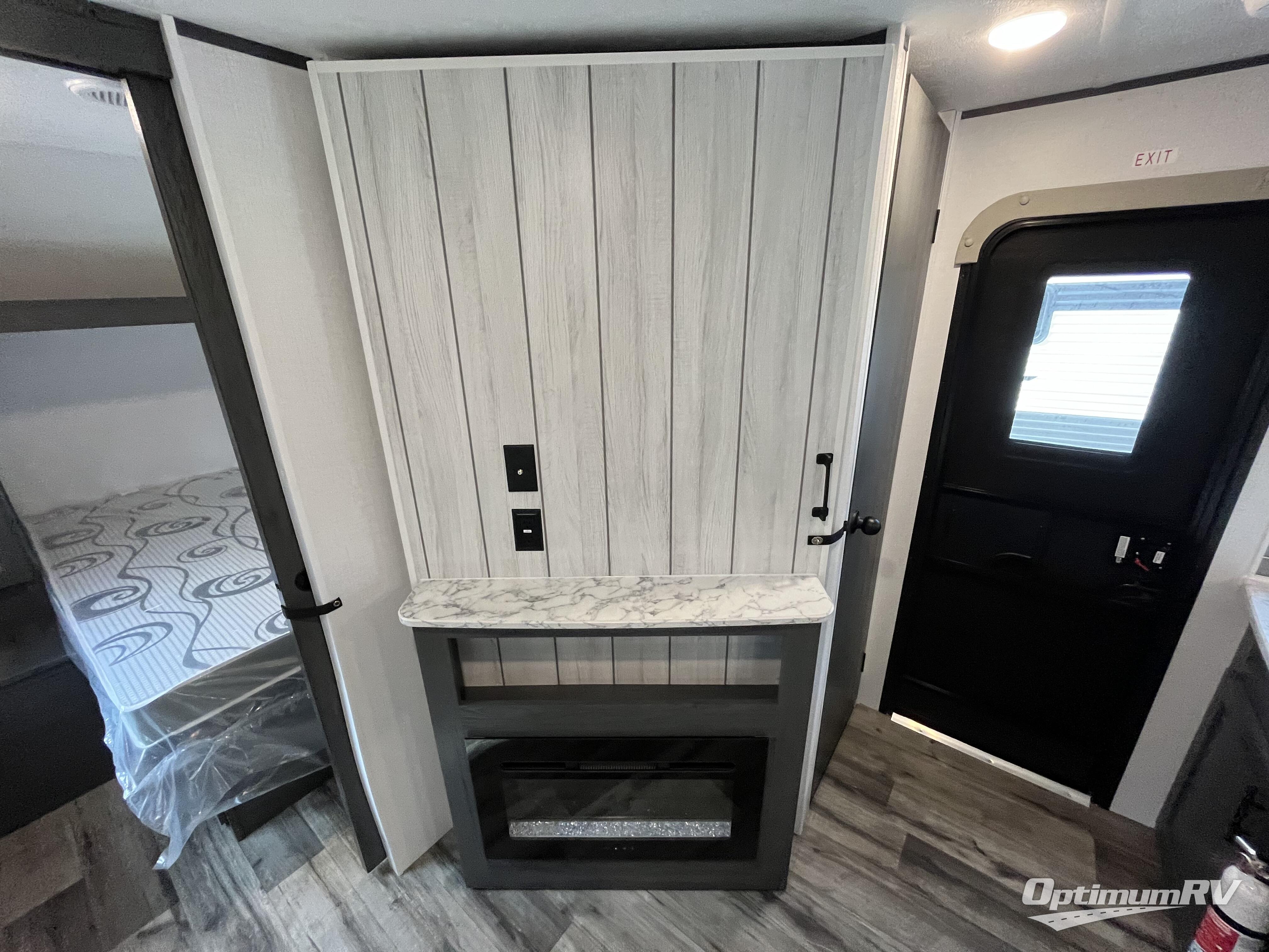 This travel trailer is one your whole crew will love! There is a rear private bunkhouse with double-size bunks for the little ones, a front private bedroom for you, and a booth dinette and jackknife sofa for even more sleeping space! The chef has their choice to cook indoors on the three burner range and microwave oven, or head outdoors to cook on the outdoor kitchen! The full bath will let everyone clean up each day, and the fireplace and large slide out will make your space feel more like home. And don't overlook the pass-through storage and 16' power awning with LED lights!