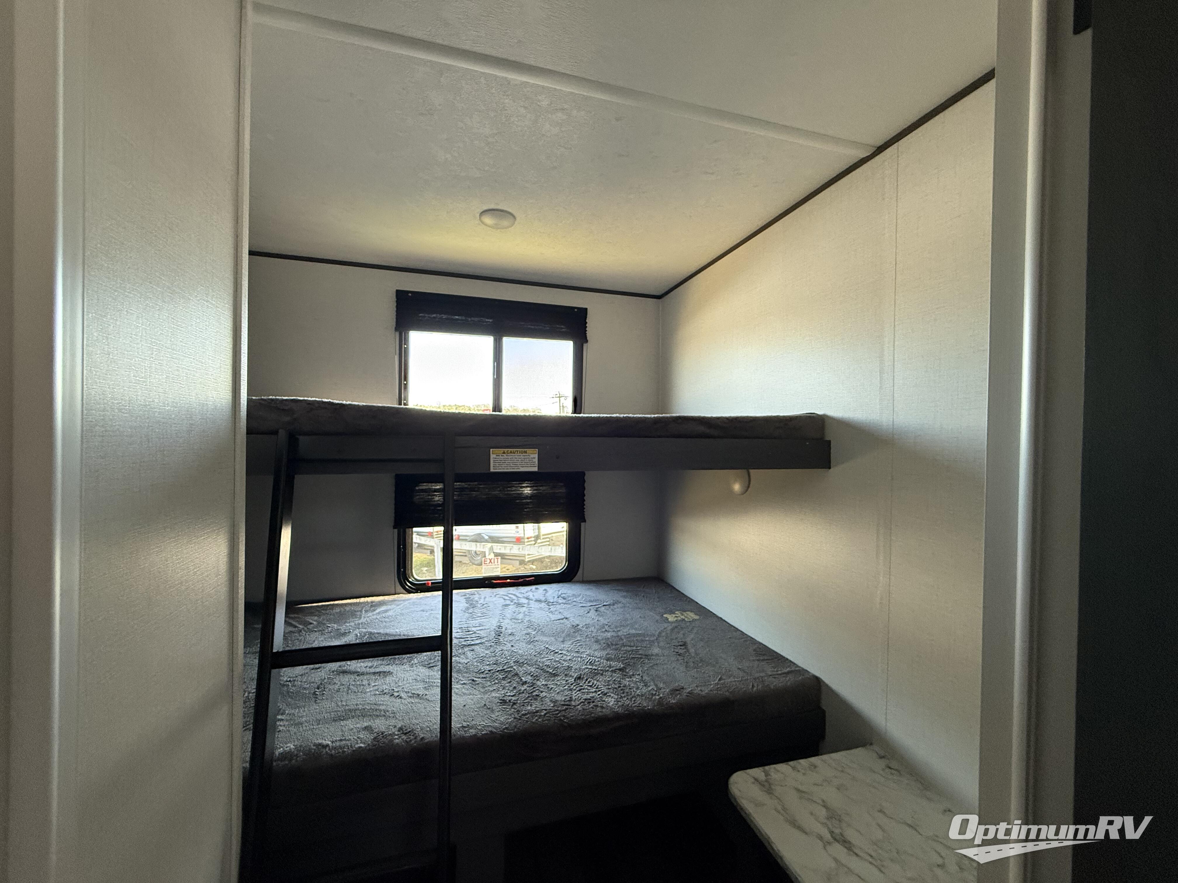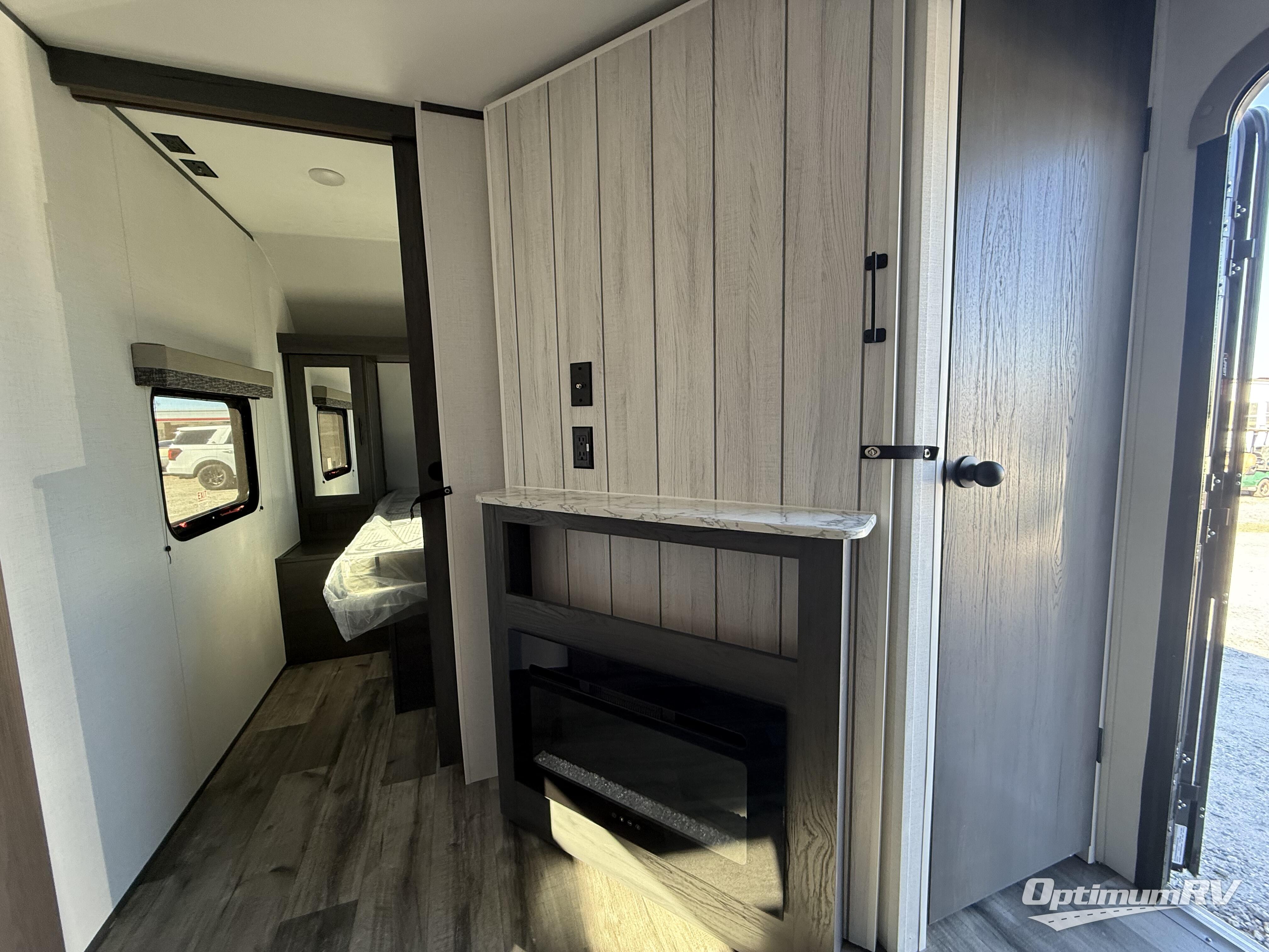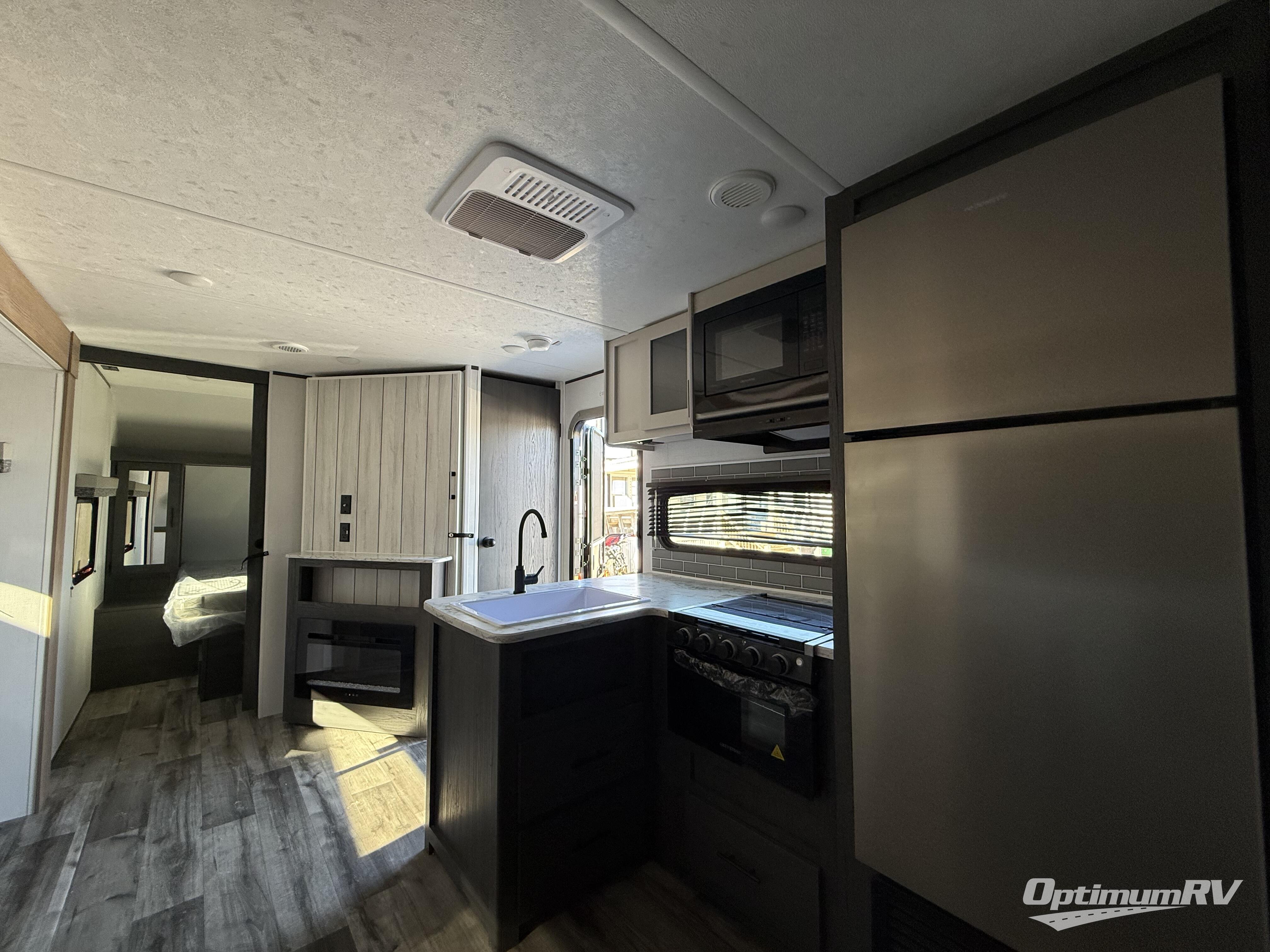 This travel trailer is one your whole crew will love! There is a rear private bunkhouse with double-size bunks for the little ones, a front private bedroom for you, and a booth dinette and jackknife sofa for even more sleeping space! The chef has their choice to cook indoors on the three burner range and microwave oven, or head outdoors to cook on the outdoor kitchen! The full bath will let everyone clean up each day, and the fireplace and large slide out will make your space feel more like home. And don't overlook the pass-through storage and 16' power awning with LED lights!
