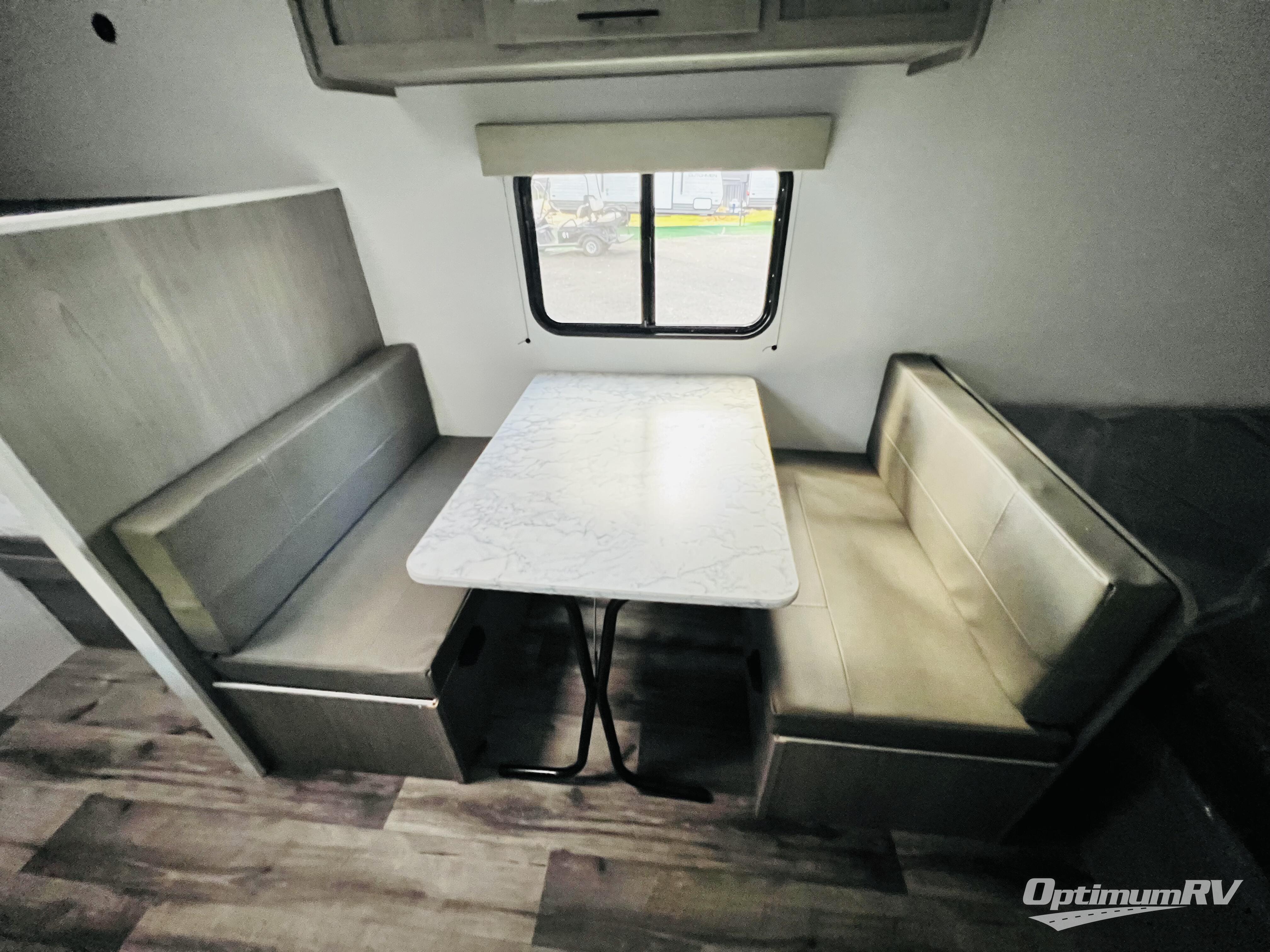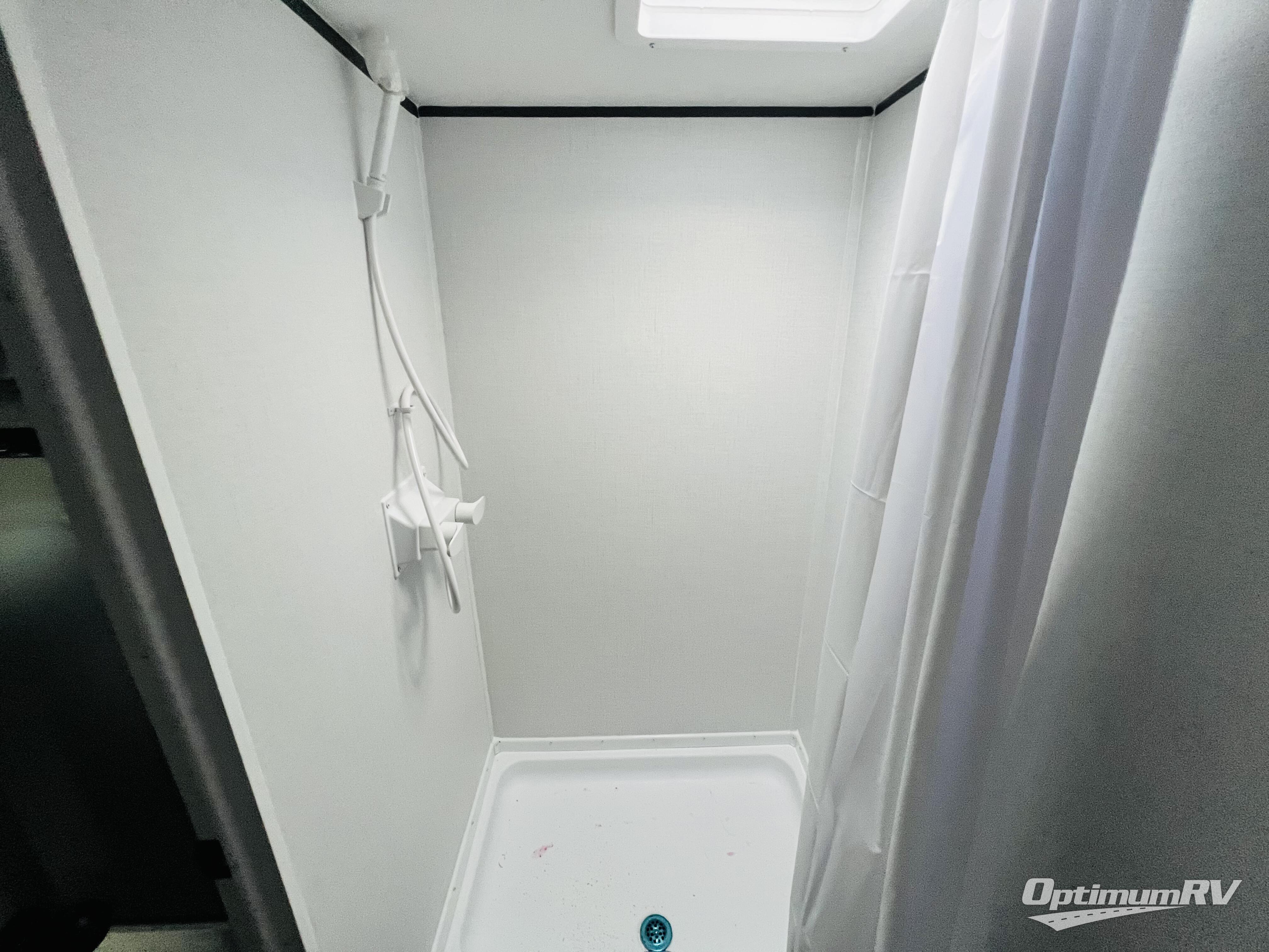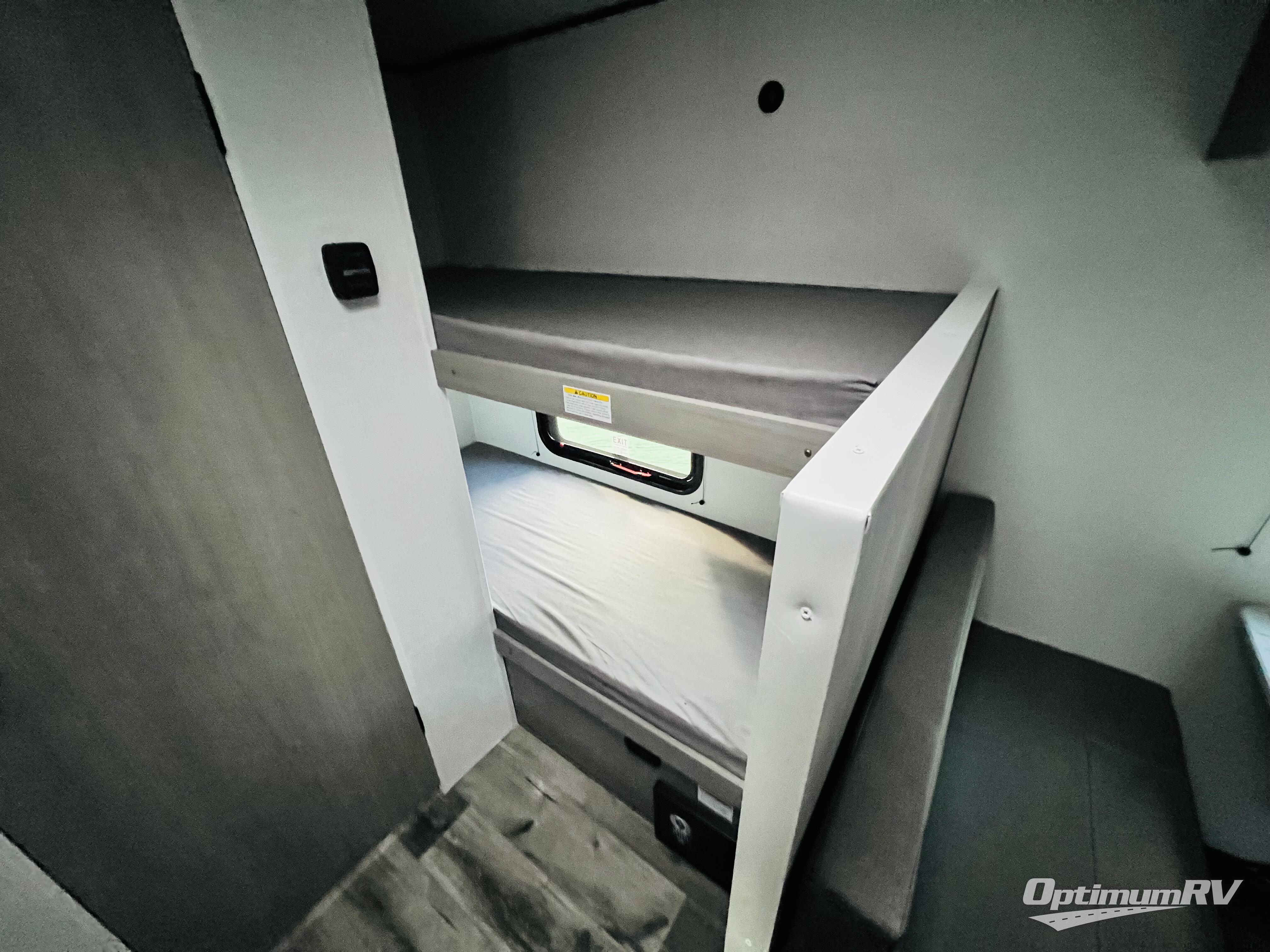 A perfect trailer for your family of three to five featuring a set of bunk beds for the kids, a queen bed up front for you, and the booth dinette that can be converted to sleep one or two more depending on size. For meals, there is a two burner cooktop and sink, plus a 3.3 cu. ft. refrigerator for your perishables. Overhead cabinetry can be found along both sides for your dishes and things. You will all appreciate the convenience of having your own private shower and toilet so that you don't need to use the campground facilities at night. If you enjoy spending time outside, an awning is available to provide even more living space outdoors!