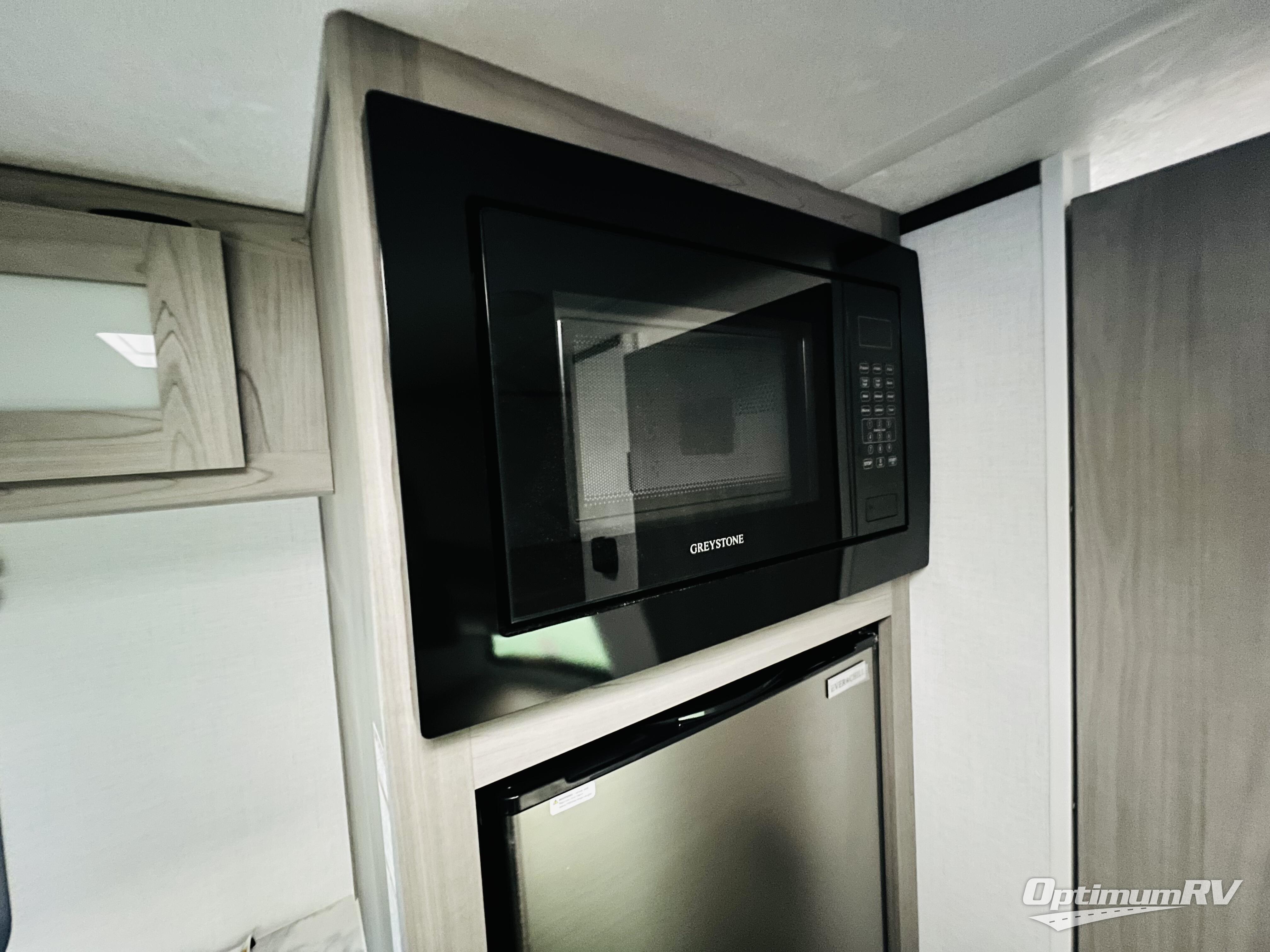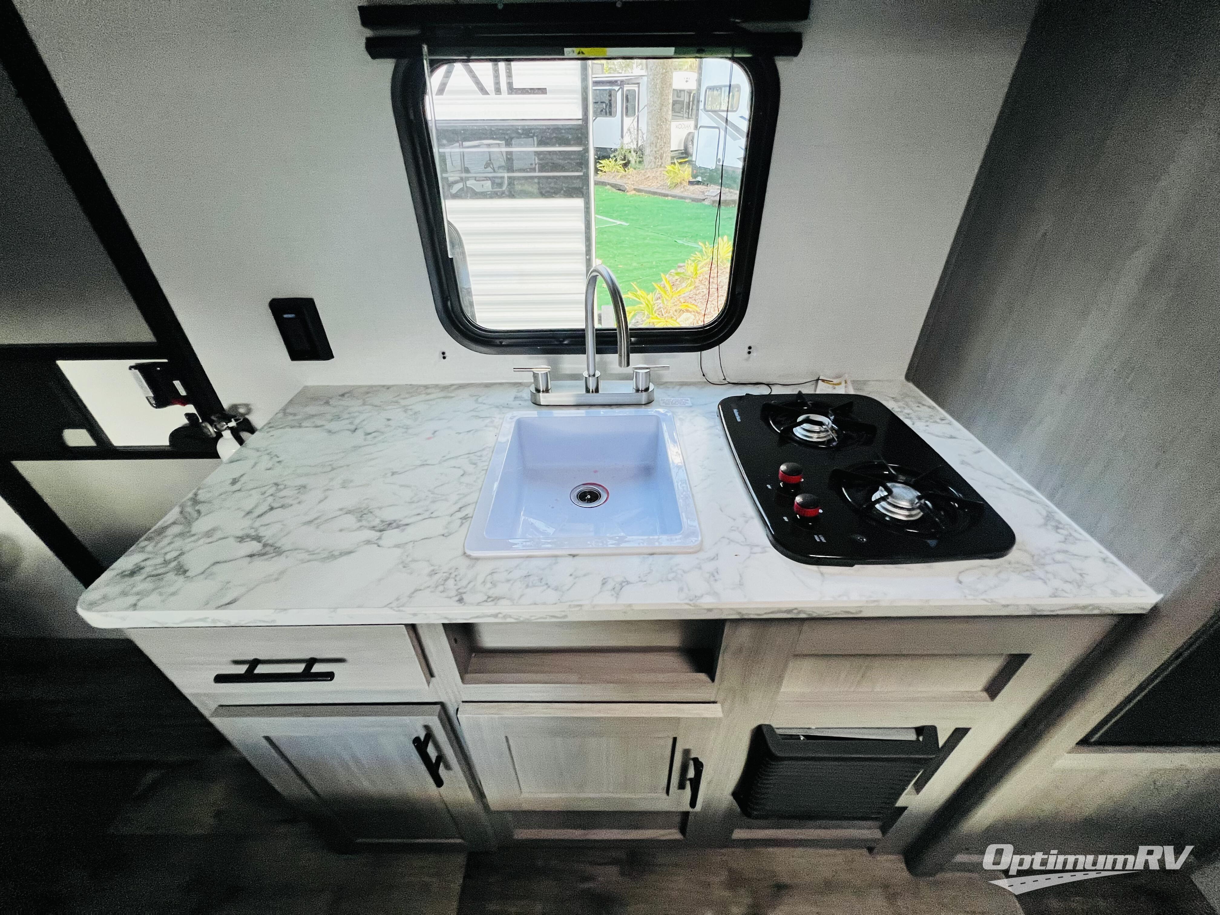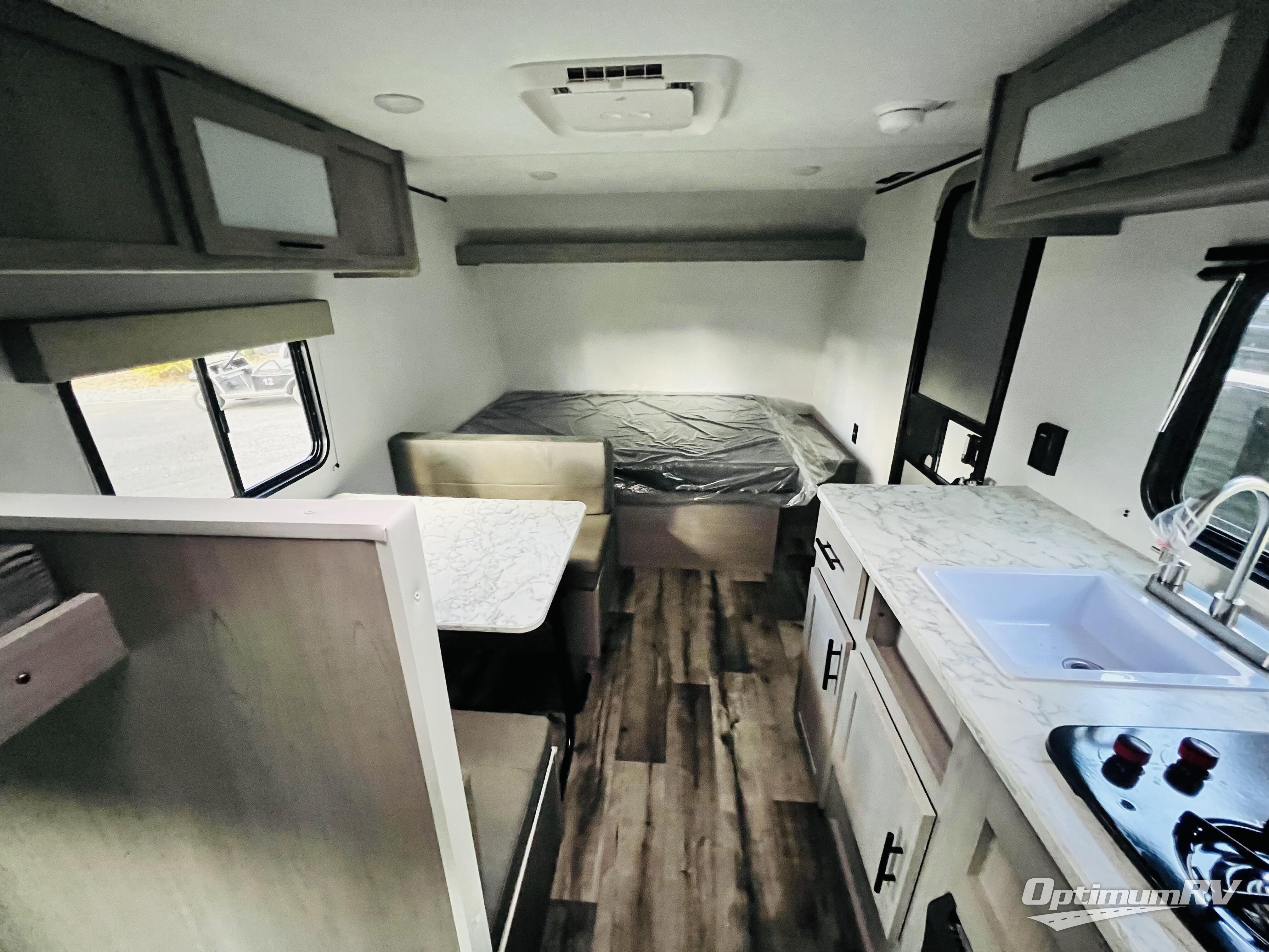 A perfect trailer for your family of three to five featuring a set of bunk beds for the kids, a queen bed up front for you, and the booth dinette that can be converted to sleep one or two more depending on size. For meals, there is a two burner cooktop and sink, plus a 3.3 cu. ft. refrigerator for your perishables. Overhead cabinetry can be found along both sides for your dishes and things. You will all appreciate the convenience of having your own private shower and toilet so that you don't need to use the campground facilities at night. If you enjoy spending time outside, an awning is available to provide even more living space outdoors!