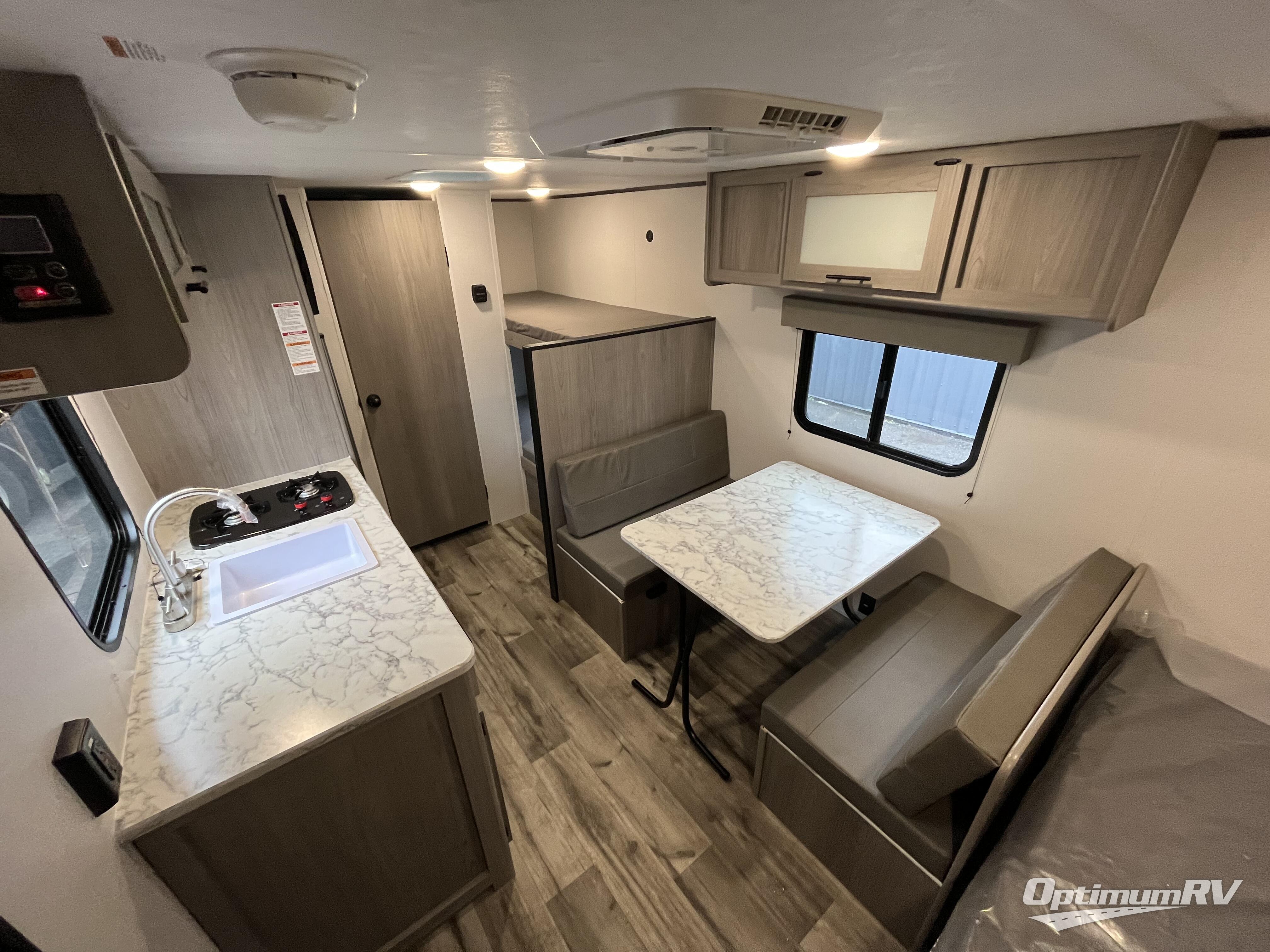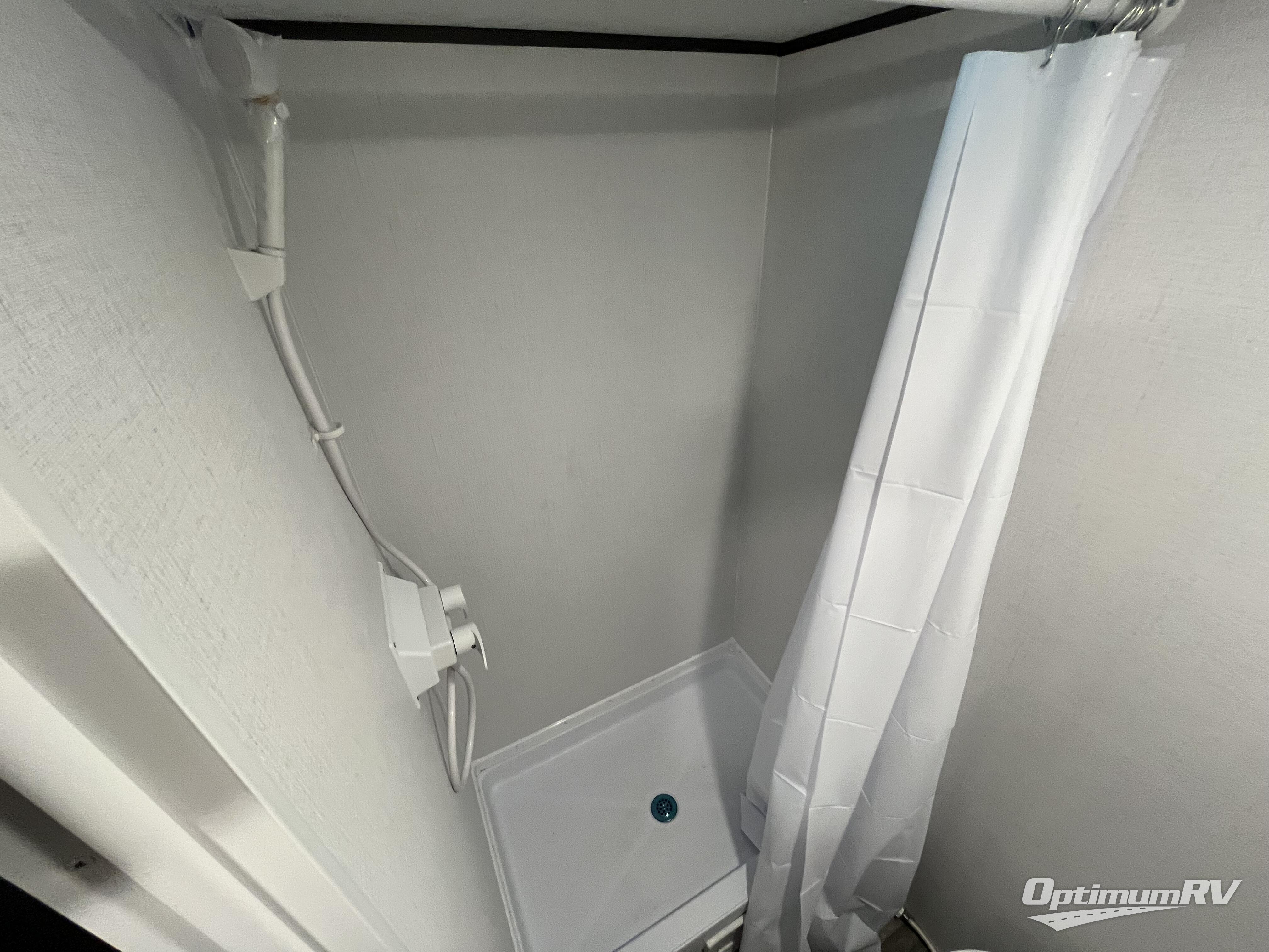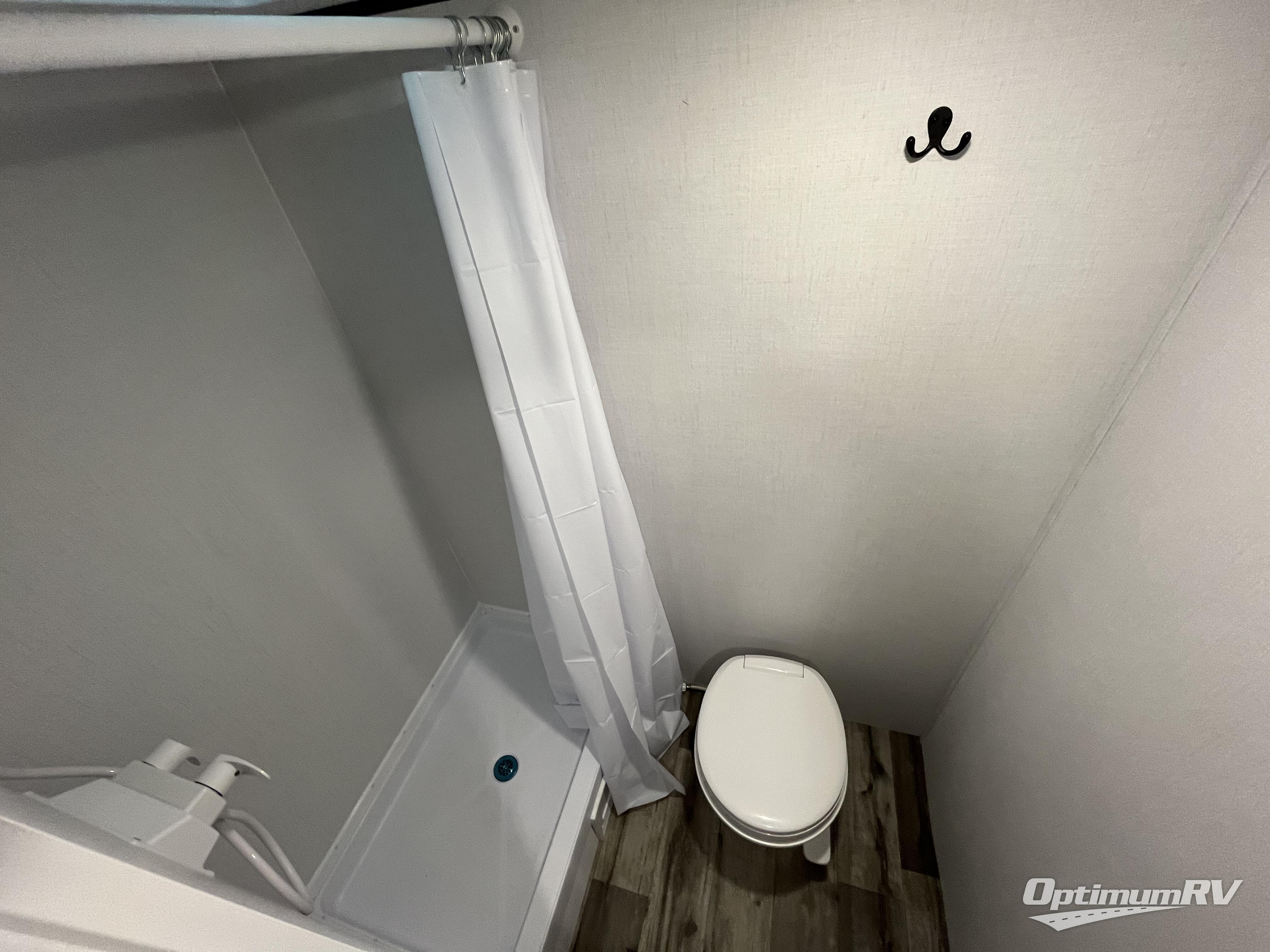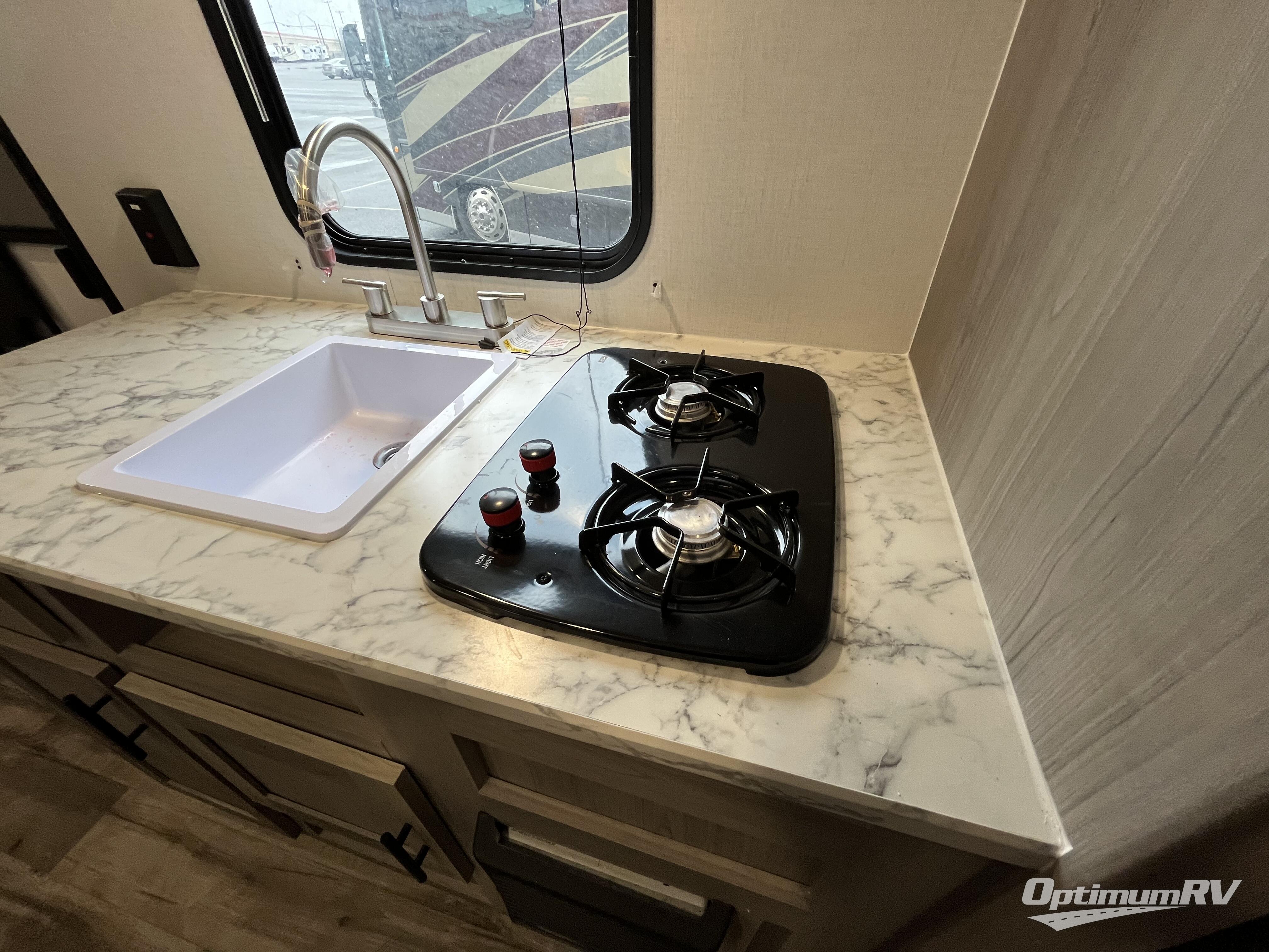A perfect trailer for your family of three to five featuring a set of bunk beds for the kids, a queen bed up front for you, and the booth dinette that can be converted to sleep one or two more depending on size. For meals, there is a two burner cooktop and sink, plus a 3.3 cu. ft. refrigerator for your perishables. Overhead cabinetry can be found along both sides for your dishes and things. You will all appreciate the convenience of having your own private shower and toilet so that you don't need to use the campground facilities at night. If you enjoy spending time outside, an awning is available to provide even more living space outdoors!