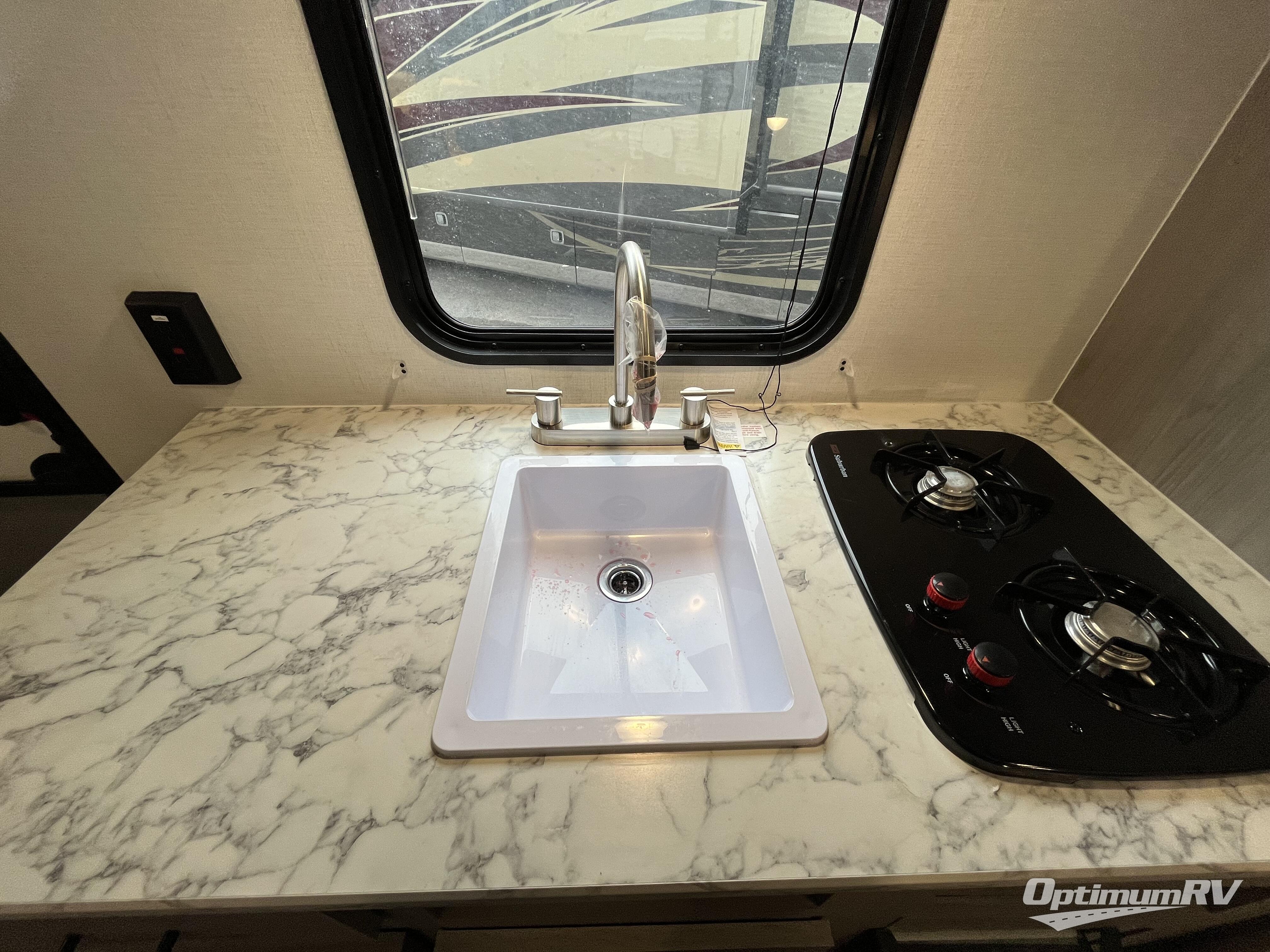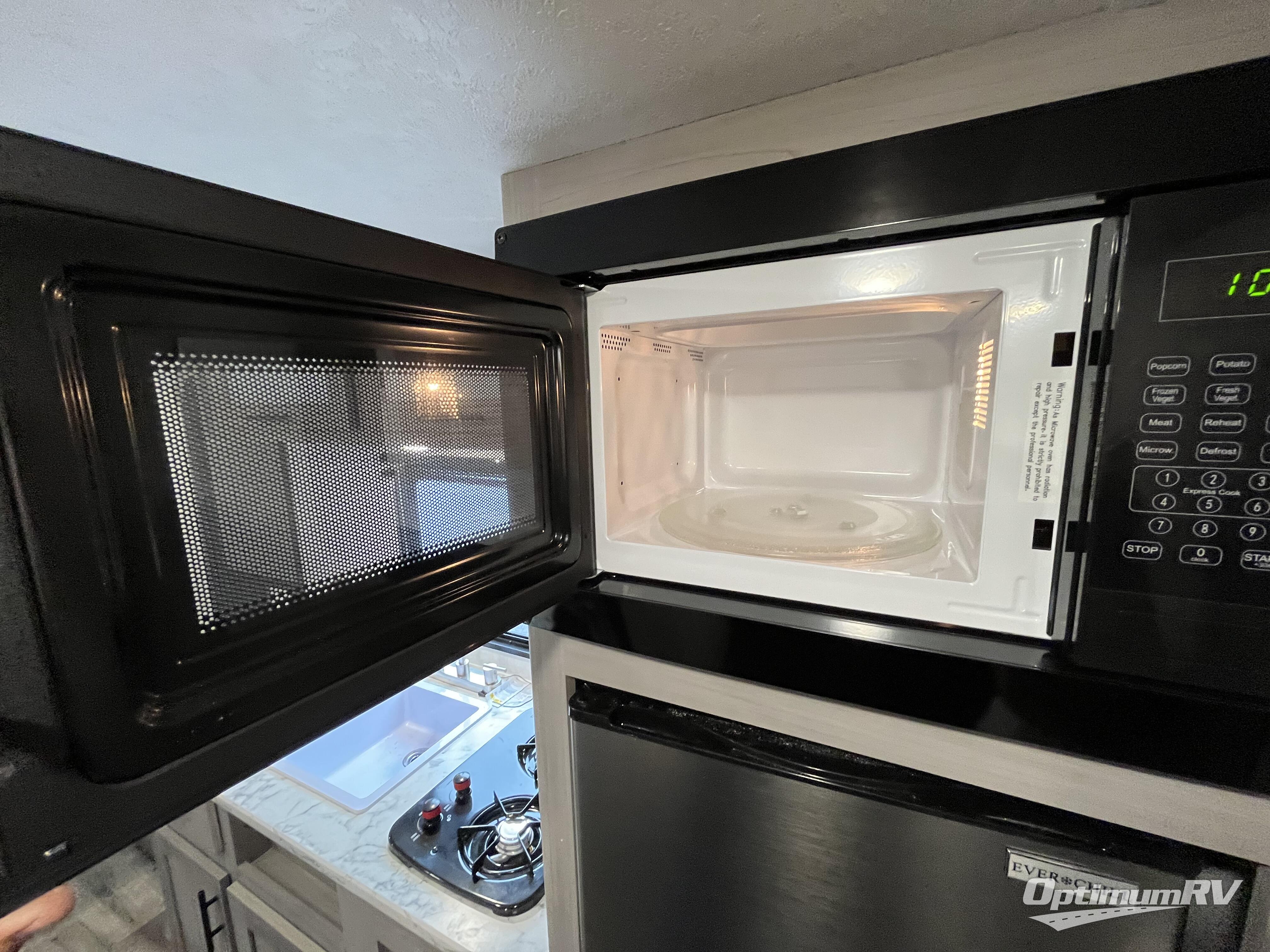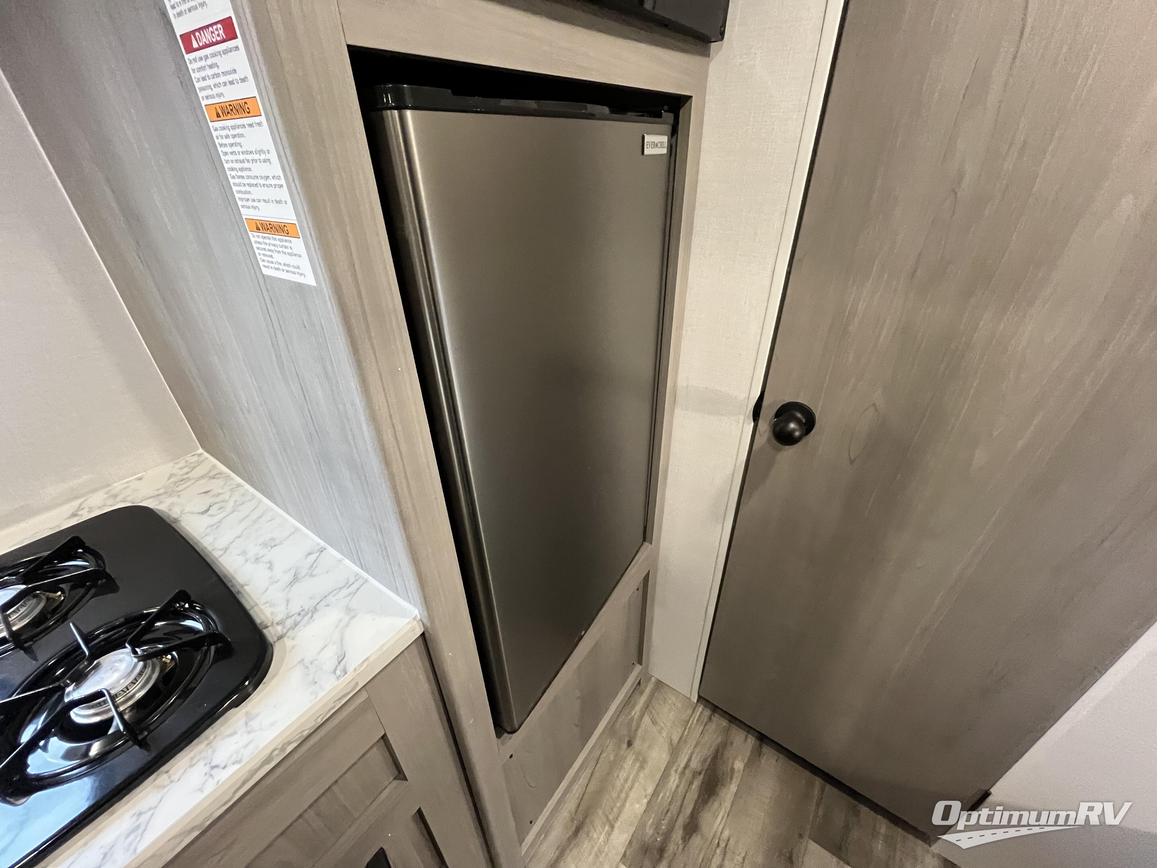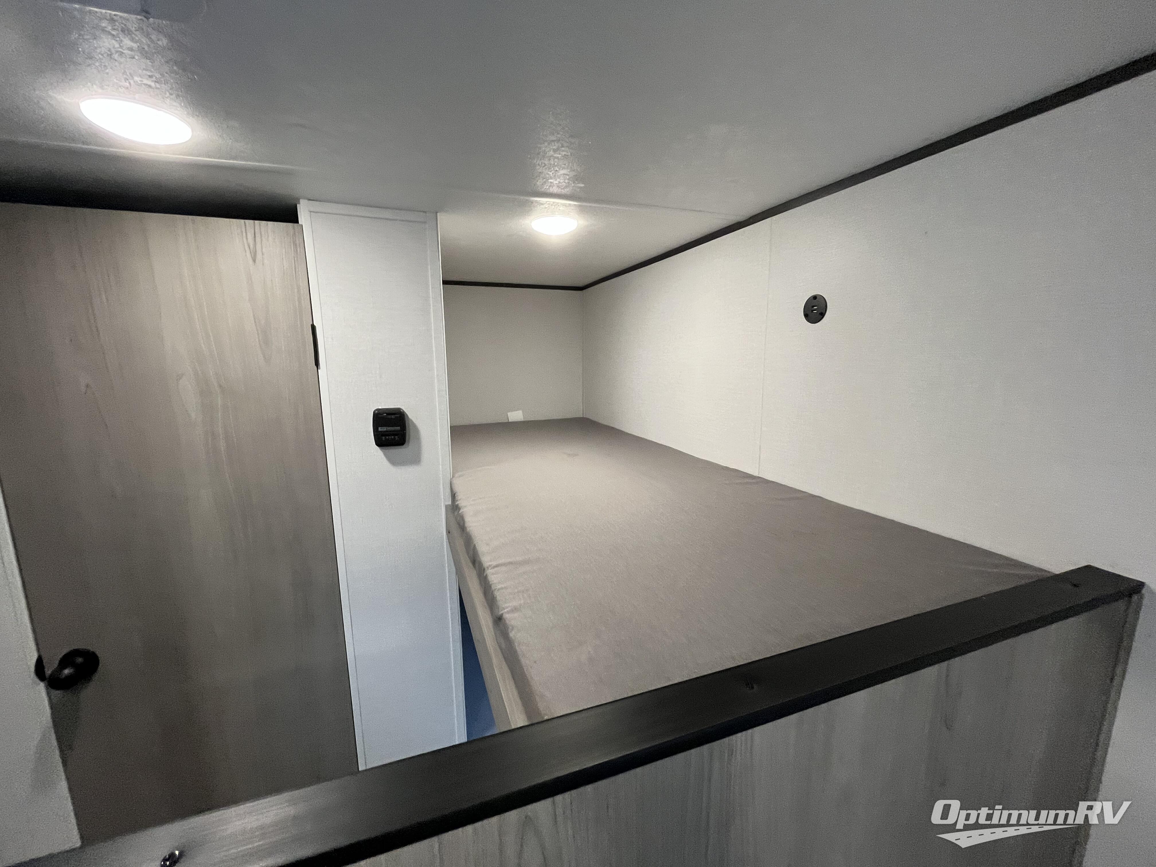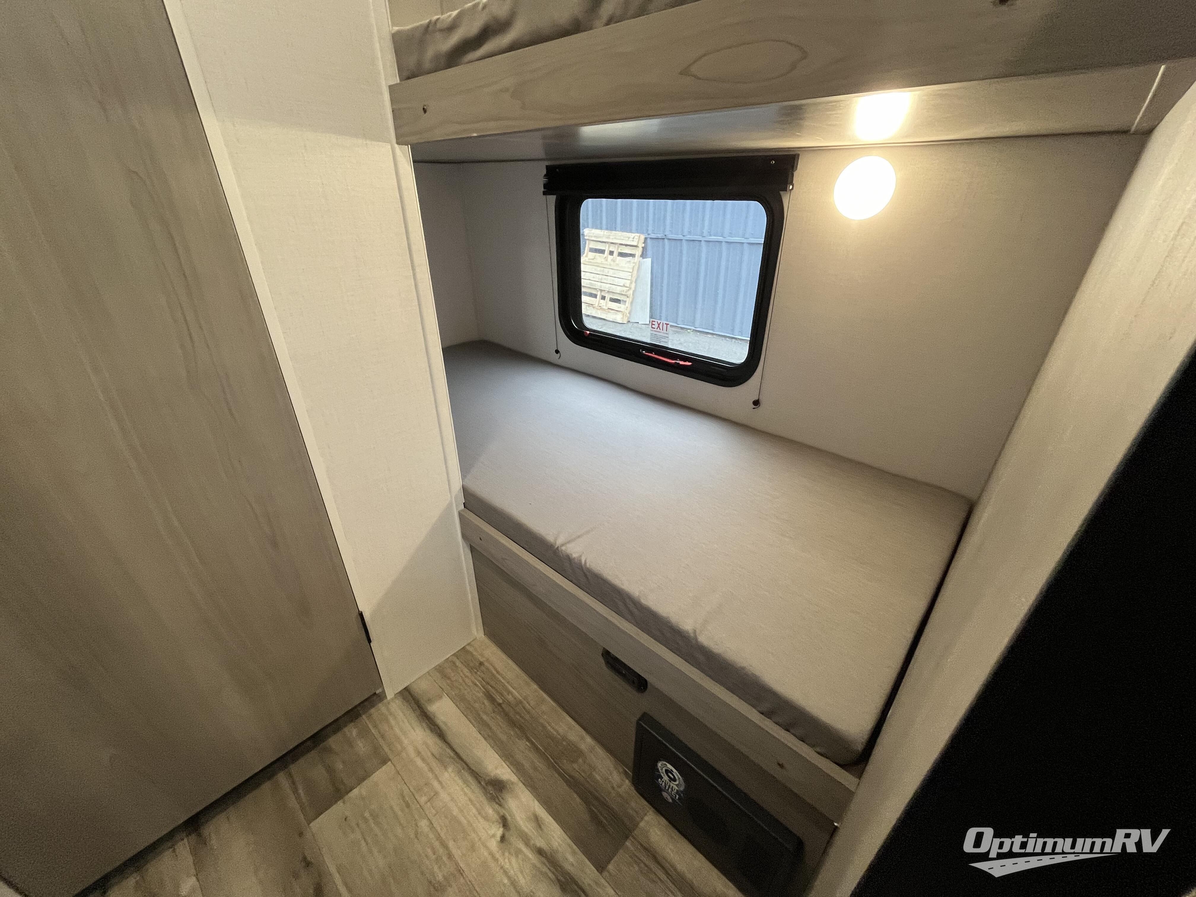 A perfect trailer for your family of three to five featuring a set of bunk beds for the kids, a queen bed up front for you, and the booth dinette that can be converted to sleep one or two more depending on size. For meals, there is a two burner cooktop and sink, plus a 3.3 cu. ft. refrigerator for your perishables. Overhead cabinetry can be found along both sides for your dishes and things. You will all appreciate the convenience of having your own private shower and toilet so that you don't need to use the campground facilities at night. If you enjoy spending time outside, an awning is available to provide even more living space outdoors!