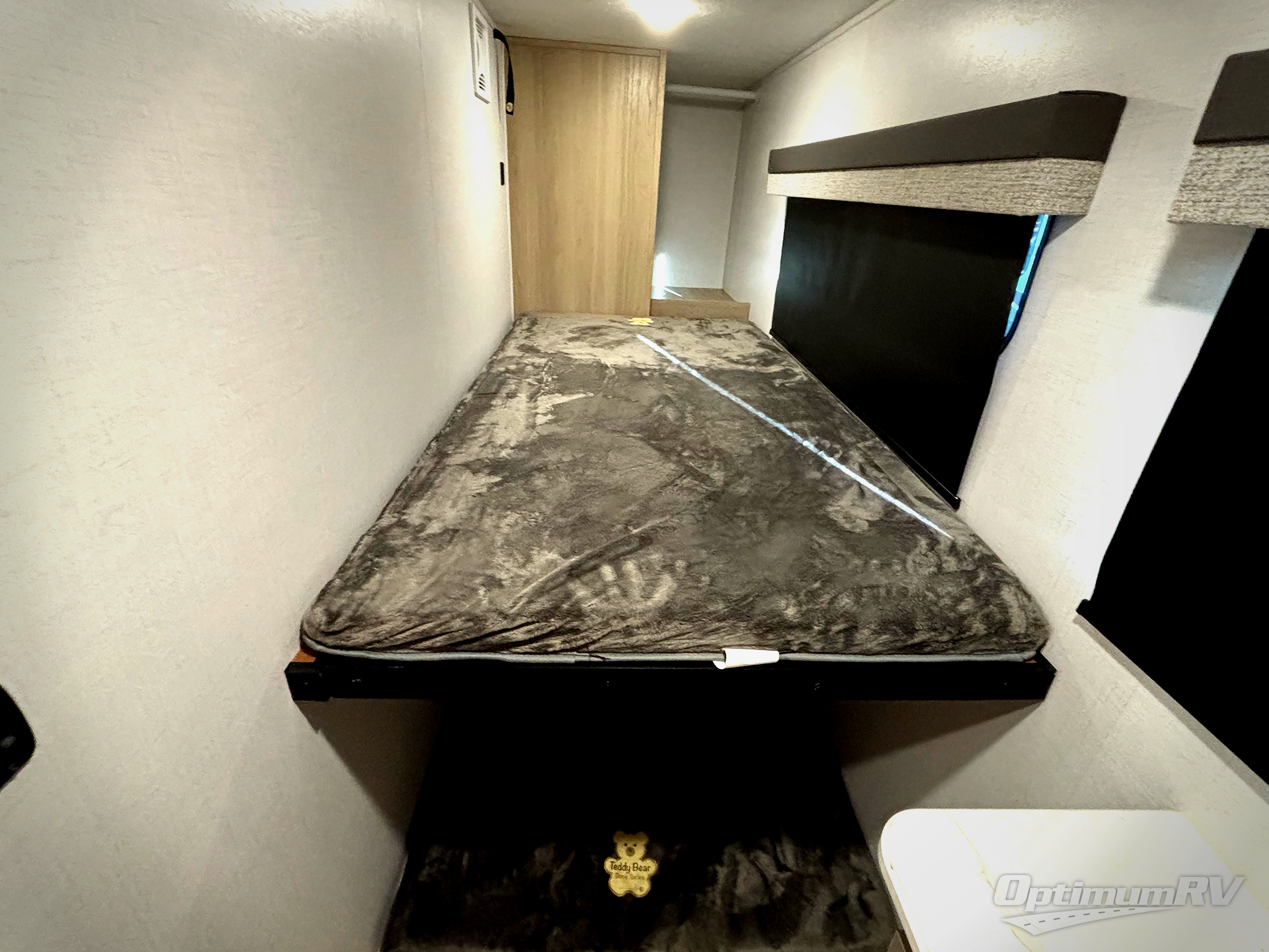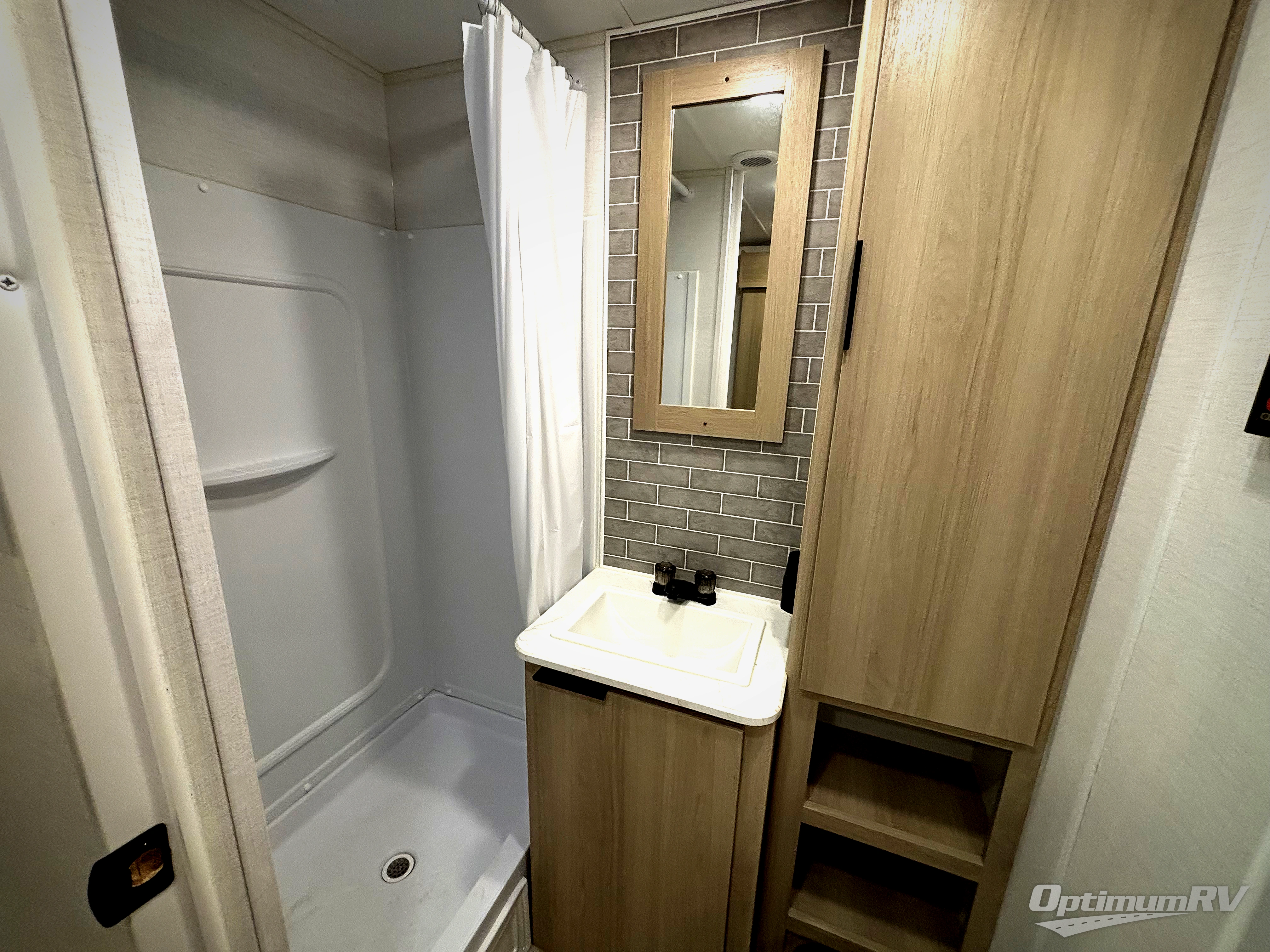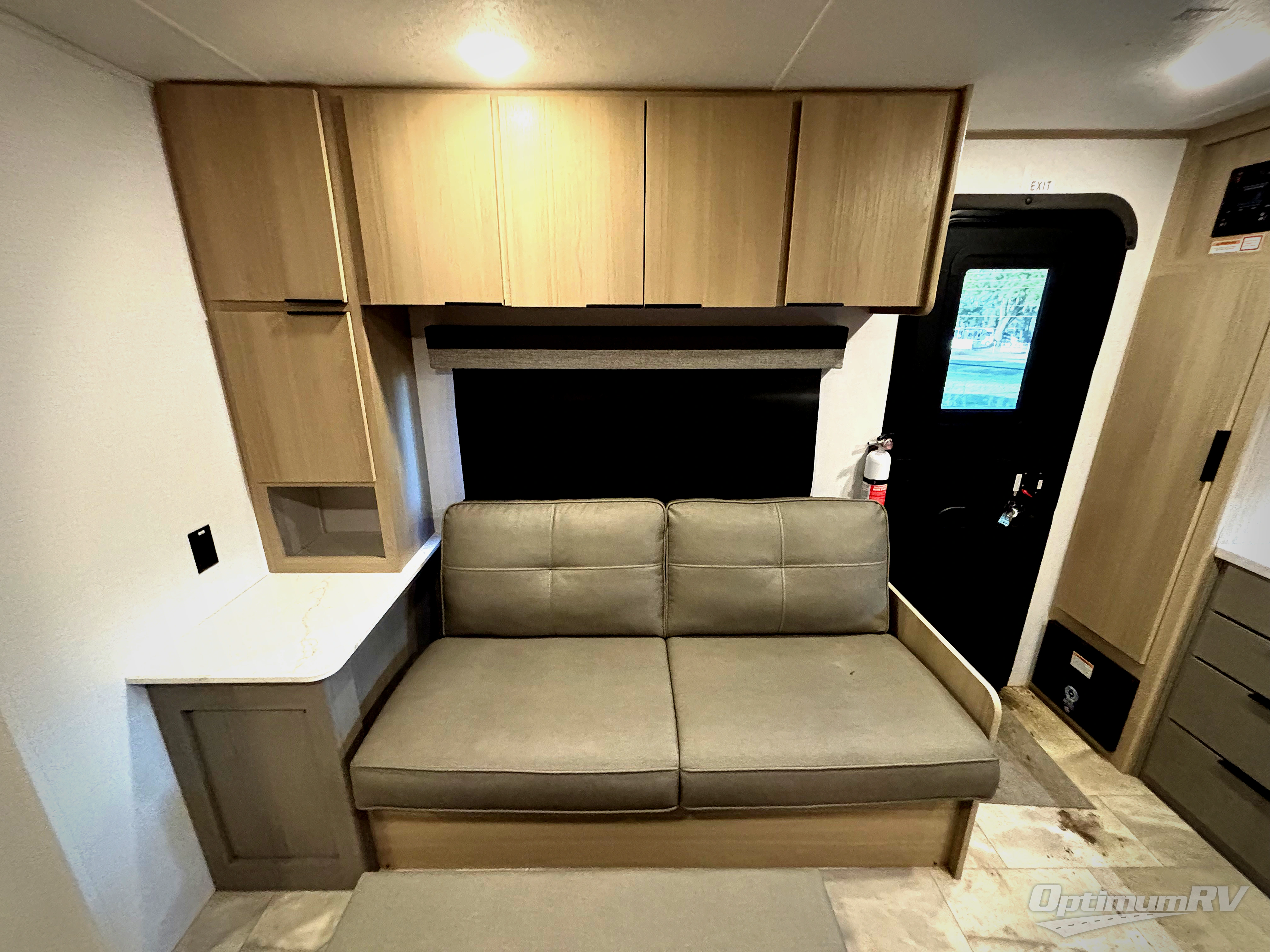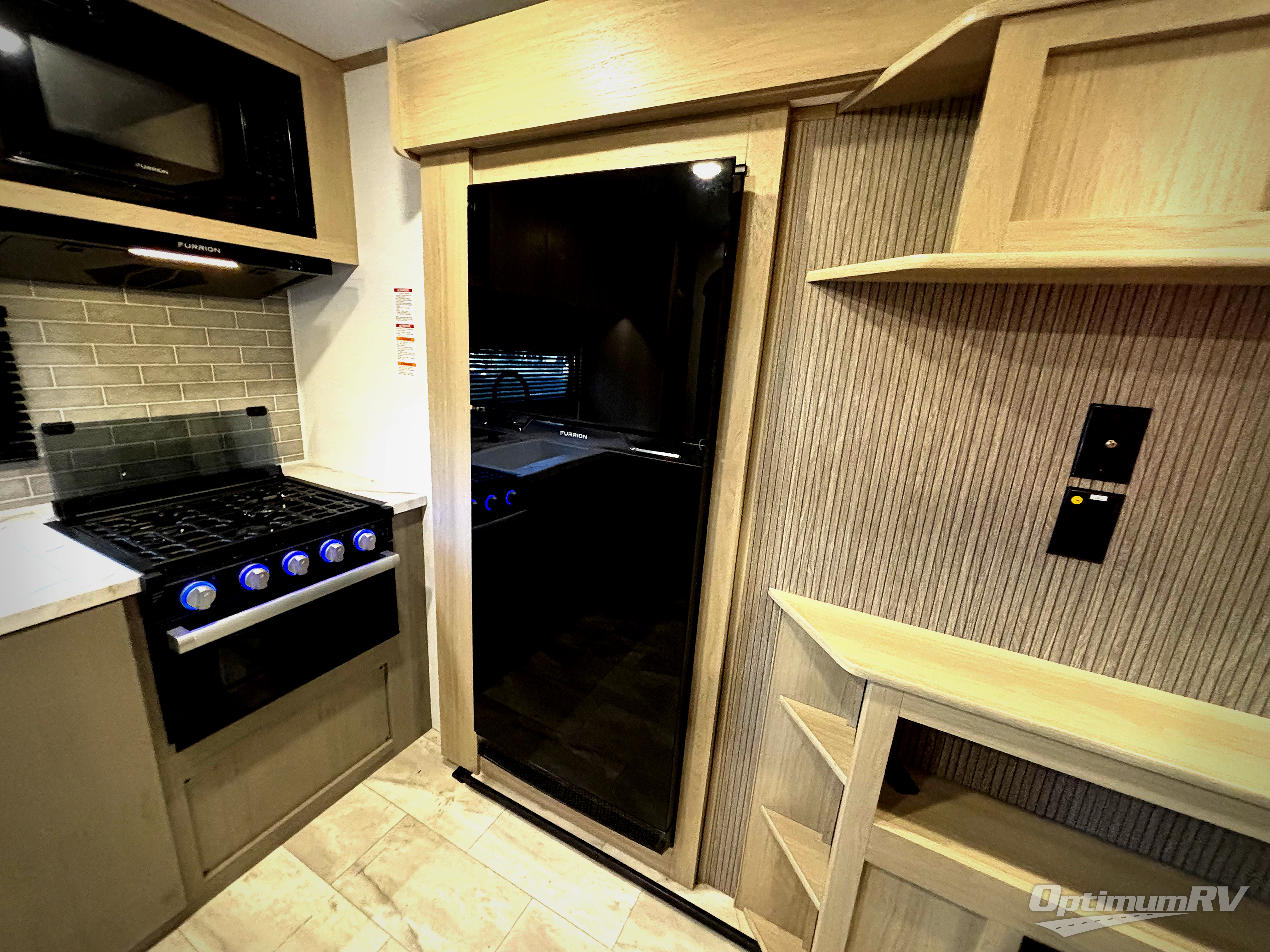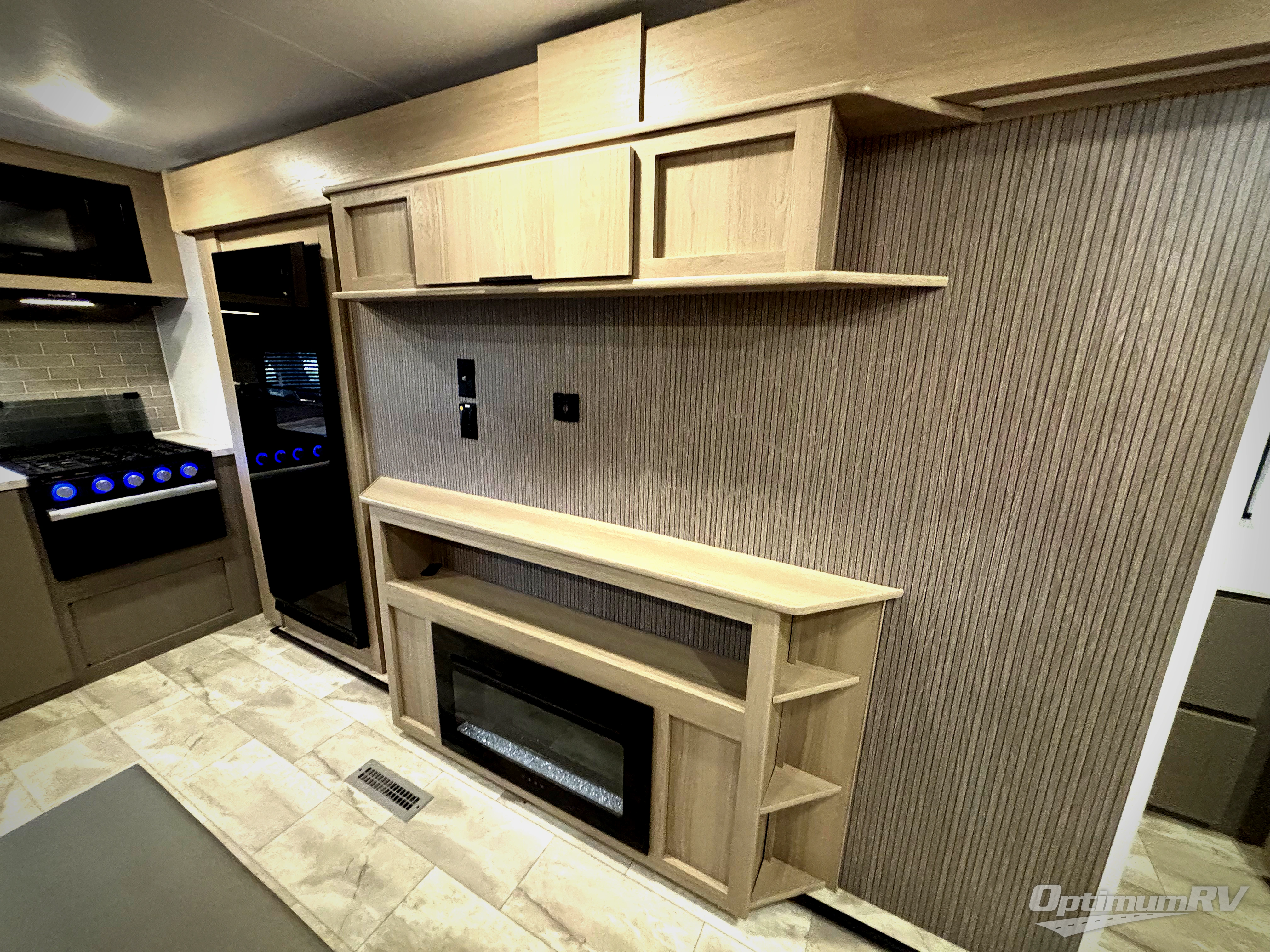 You'll love every minute spent in this spacious travel trailer. There is a front private bedroom with a queen bed and dual bedside closets to keep your things organized. The jack knife sofa sits across from the fireplace so you can enjoy your evenings indoors, and the hidden convertible bunk is behind the entertainment center for a smart usage of space! The rear kitchen includes a cooktop with an oven, a microwave, plus a 12V refrigerator and pantry for food storage. And don't overlook the mid-coach full bath for quick and easy showers!