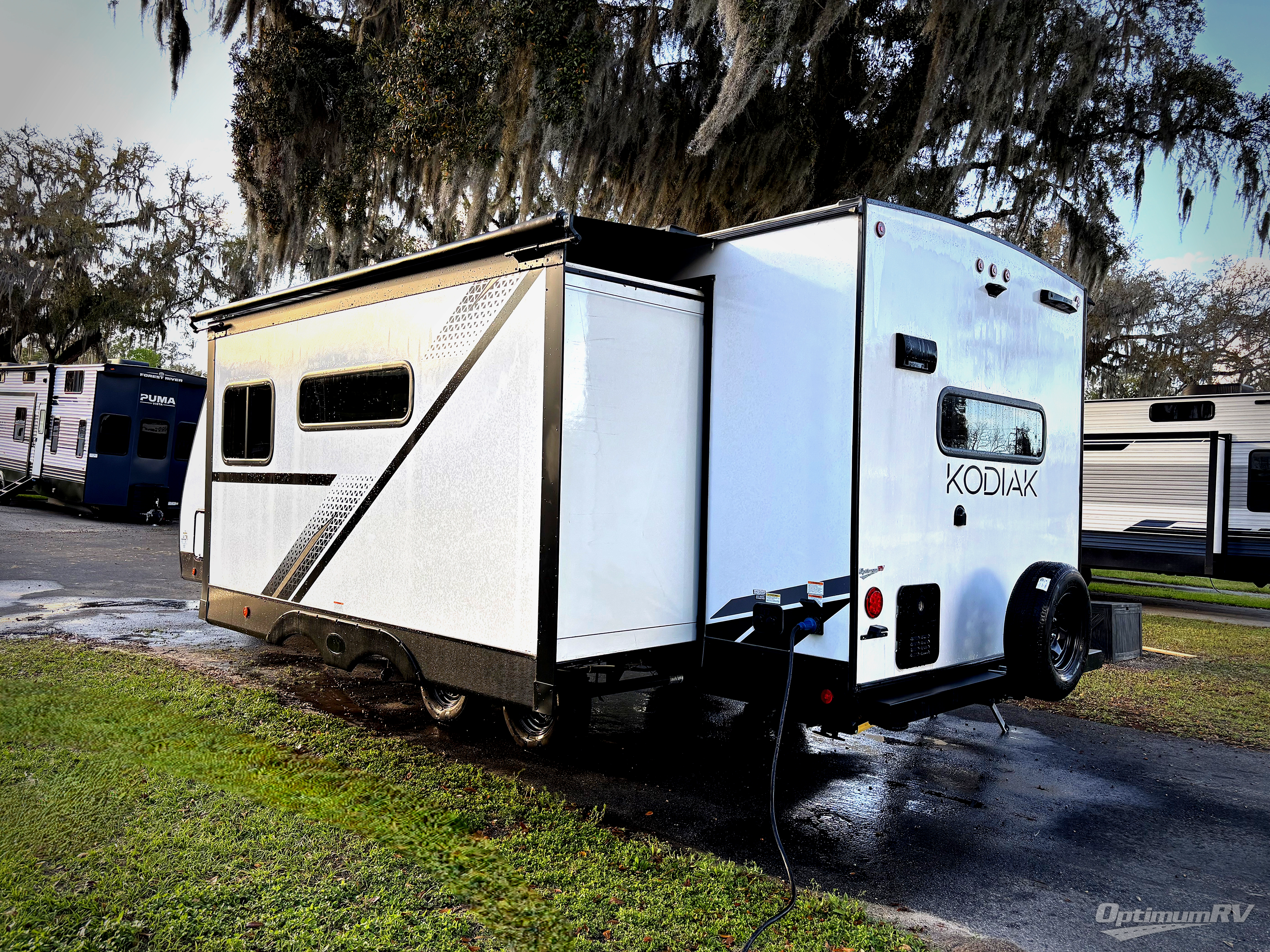Each Kodiak travel trailer by Dutchmen includes a diamond front plate, easy lube axles, and a power tongue jack for hassle-free towing. The bear cave storage will allow you to bring along all the camp gear, and the power awning with an LED light will create an inviting outdoor space. Head inside to enjoy the designer valances, blackout roller shades, and seamless countertops. There is also HyperDeck flooring that will withstand your many adventures plus a 6' 8" interior height for more head room. A high output furnace and 13.5k BTU A/C will keep you comfortable, and the on-demand tankless water heater will provide instant hot water when you need it!