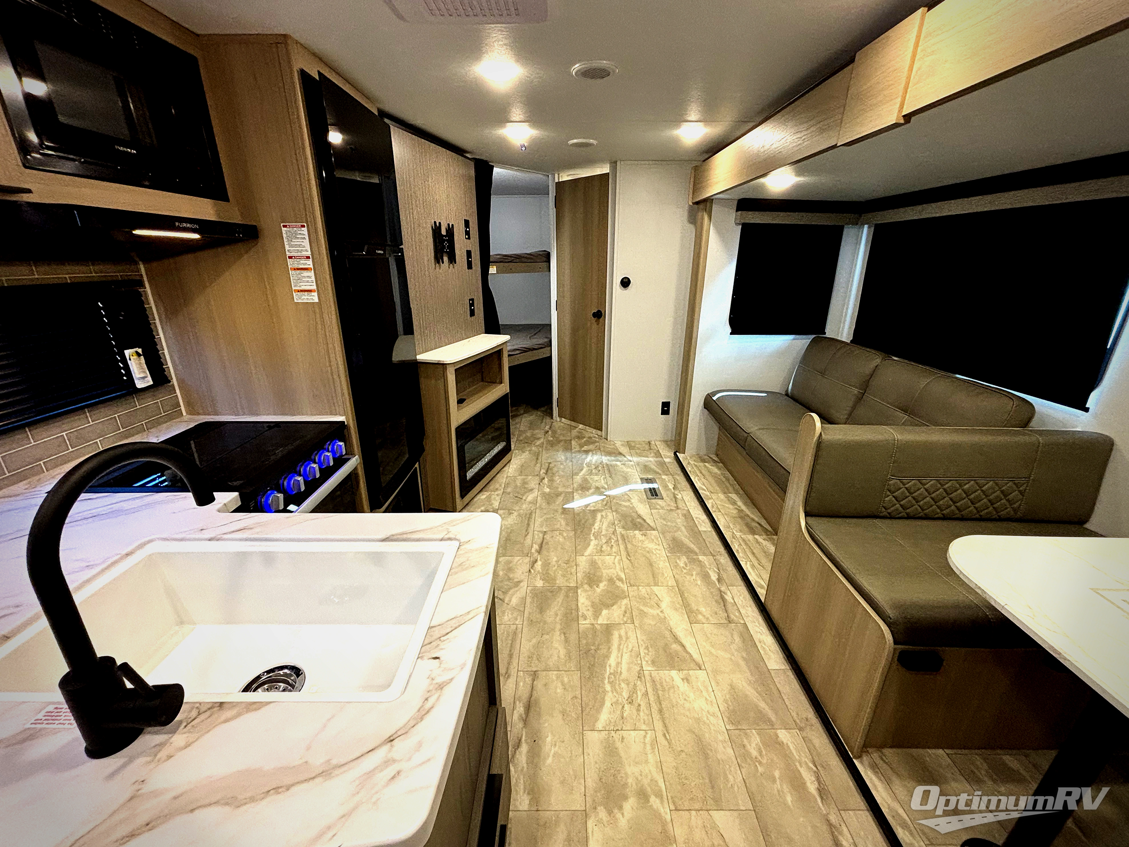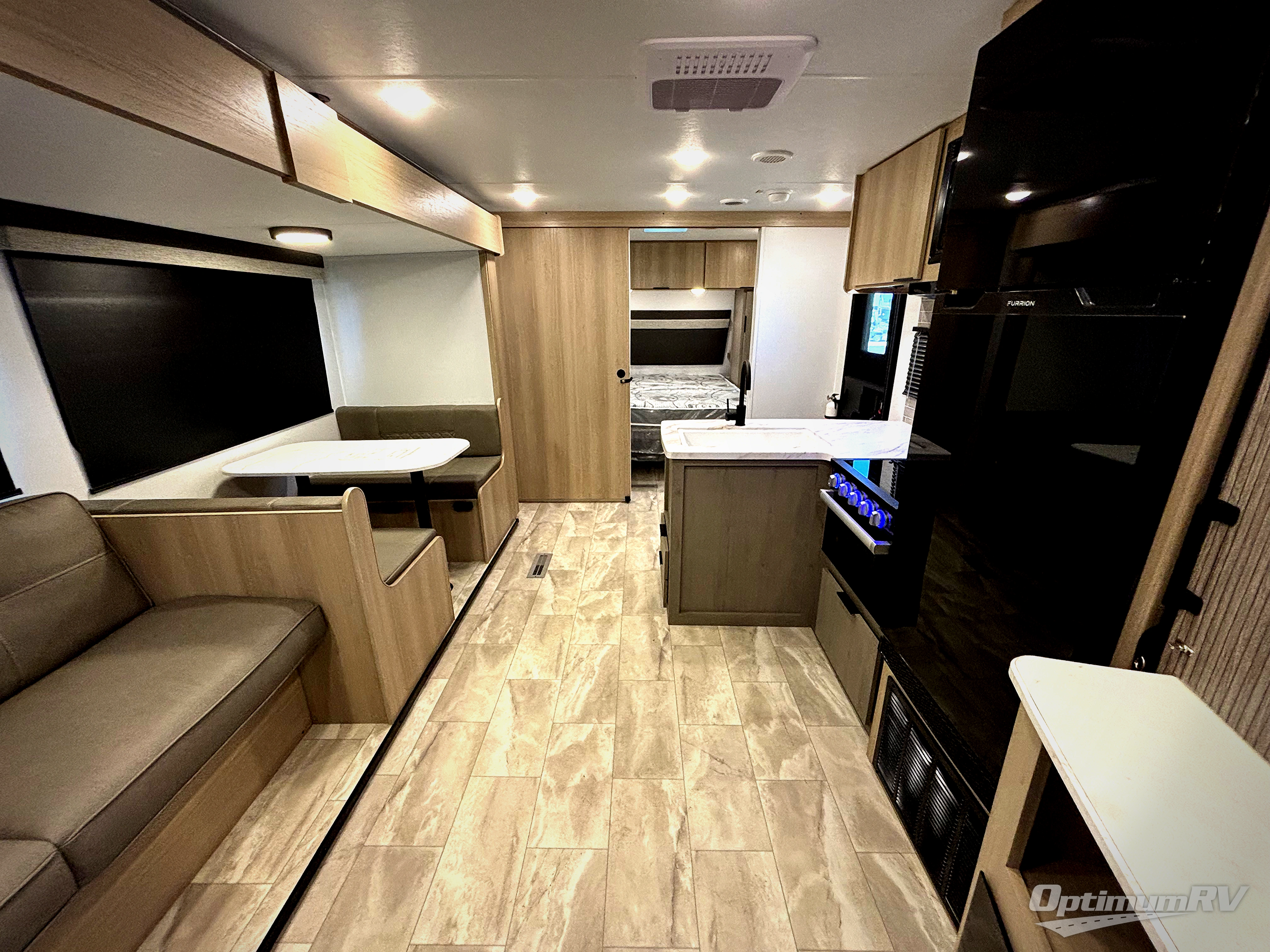 This bunkhouse model is perfect for weekend excursions or extended getaways at your favorite state park. You will have your own queen bed up front with storage space for your things, and the double-size bunks in the back will be perfect for guests. Prepare your meals on the cooktop or in the microwave oven, and you can dine together at the booth dinette. The dinette can also be used as additional sleeping space for one guest or two kids. Outside, a 14' power awning will provide some shade, and an outdoor refrigerator will keep cold drinks close by!