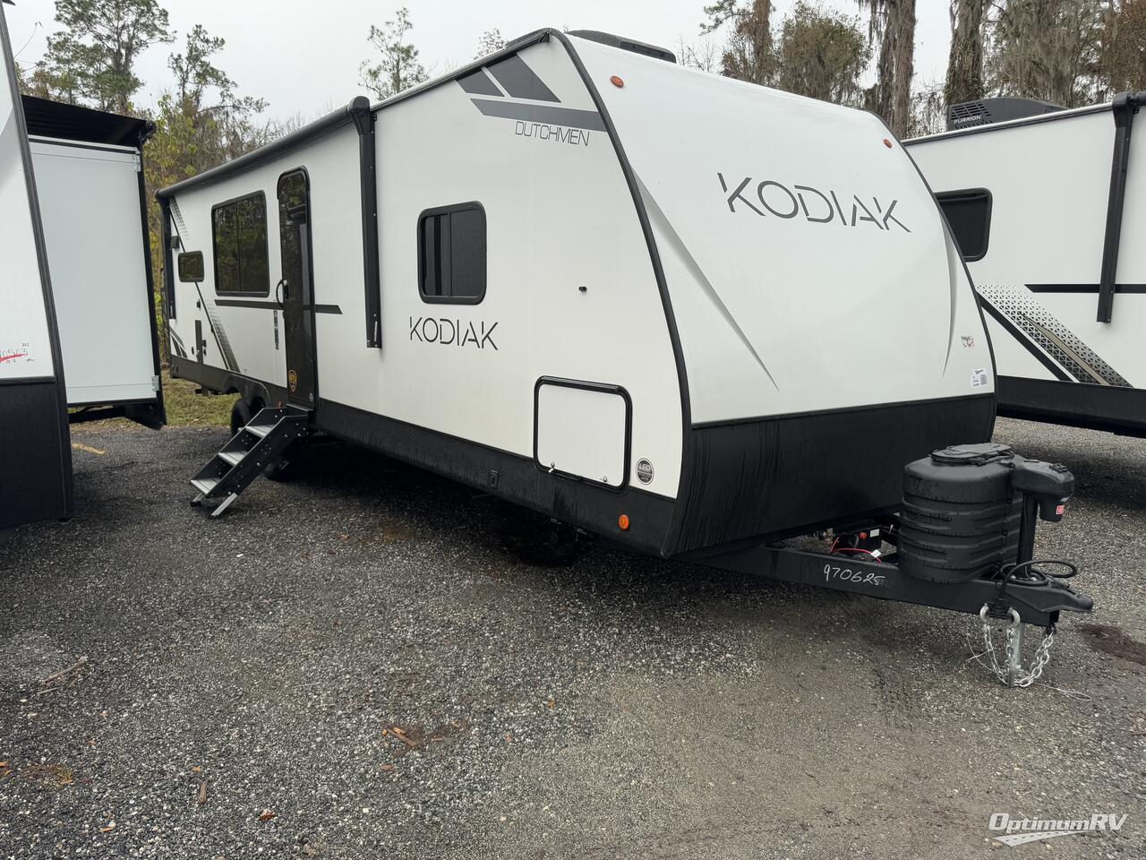 Each Kodiak travel trailer by Dutchmen includes a diamond front plate, easy lube axles, and a power tongue jack for hassle-free towing. The bear cave storage will allow you to bring along all the camp gear, and the power awning with an LED light will create an inviting outdoor space. Head inside to enjoy the designer valances, blackout roller shades, and seamless countertops. There is also HyperDeck flooring that will withstand your many adventures plus a 6' 8" interior height for more head room. A high output furnace and 13.5k BTU A/C will keep you comfortable, and the on-demand tankless water heater will provide instant hot water when you need it!