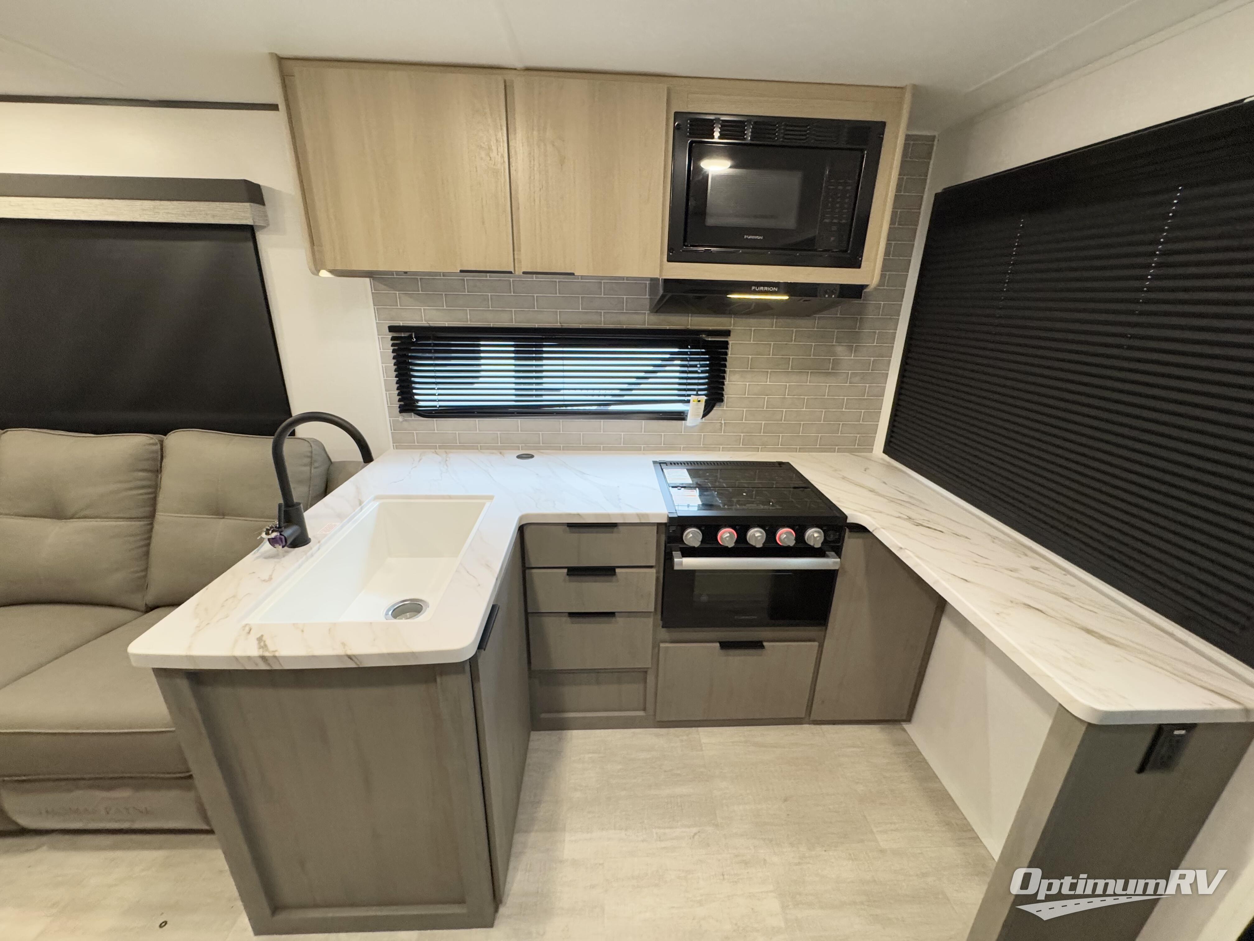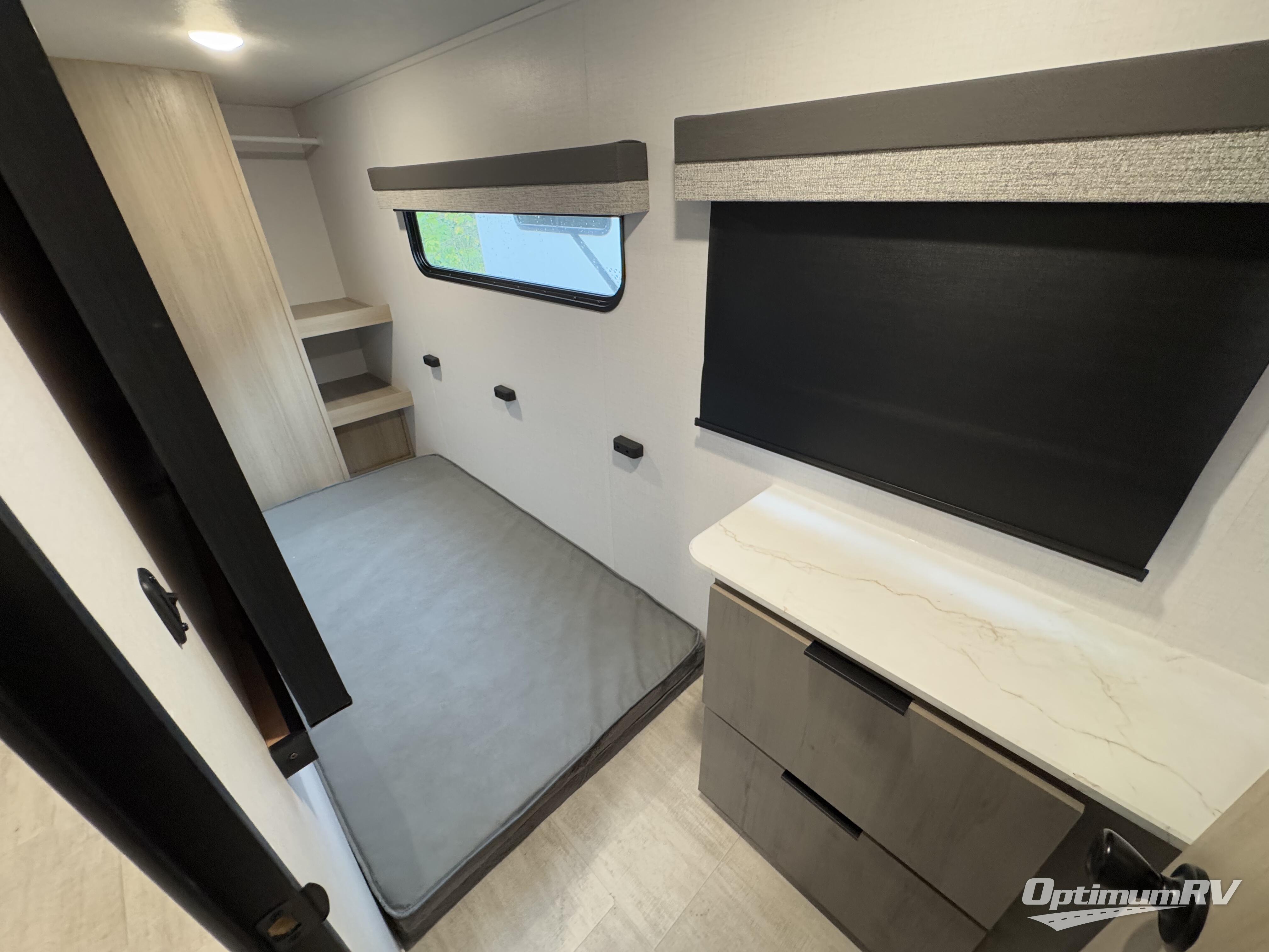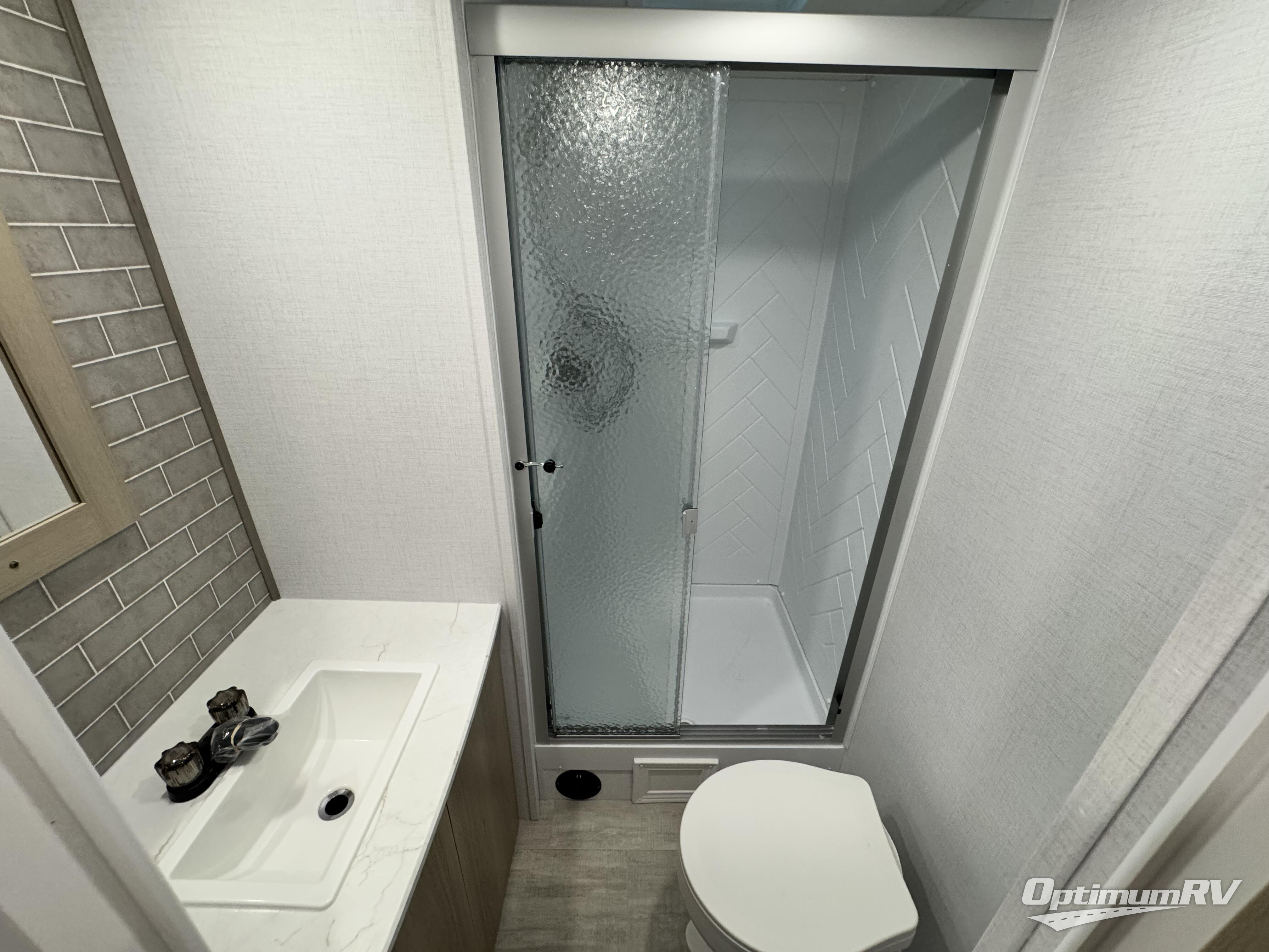 You'll love every minute spent in this spacious travel trailer. There is a front private bedroom with a king bed and dual bedside closets to keep your things organized. The jack knife sofa sits across from the fireplace so you can enjoy your evenings indoors, and the hidden convertible bunk is behind the entertainment center for a smart usage of space! The full kitchen features ample counter space, along with a concession style window, so while the chef is cooking, they can visit with those on the rear fold-down porch.