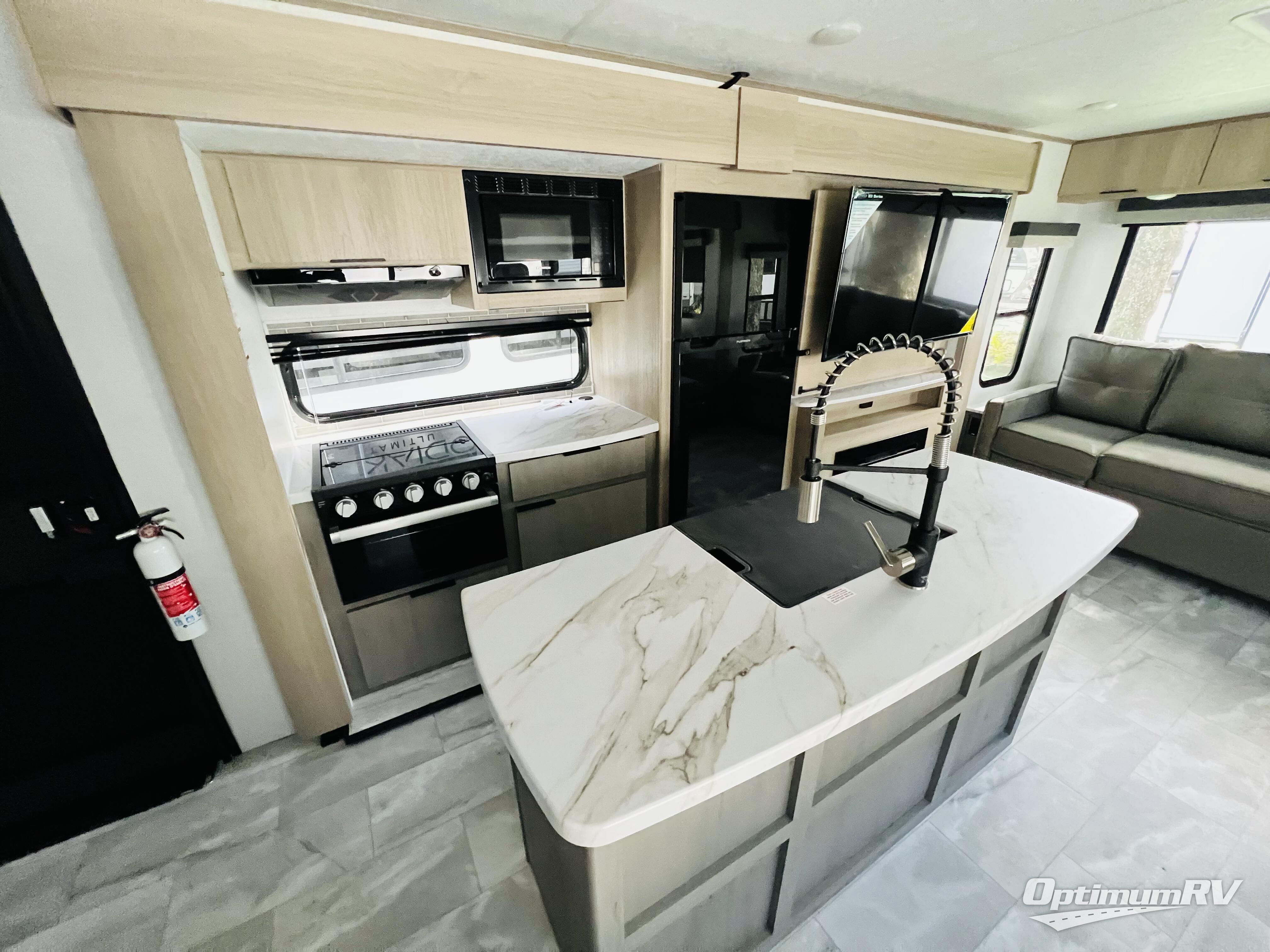 You will feel right at home in this spacious travel trailer that can sleep five people each night. The kitchen island includes a stainless kitchen sink, a three burner cooktop, plus a 10 cu. ft. 12V refrigerator for perishables. There is also an outside kitchen, which will make the outdoor cook very happy! The pass-through storage will be perfect for bringing along fishing poles or hiking gear, and there is a 20' power awning with LED lights if you enjoy relaxing outdoors in the evenings. Get cleaned up in the walk-through bath before heading off to the front master bedroom each night. You'll love the slide out king bed, the bedroom fireplace, and the front bench seat to read a book or two!