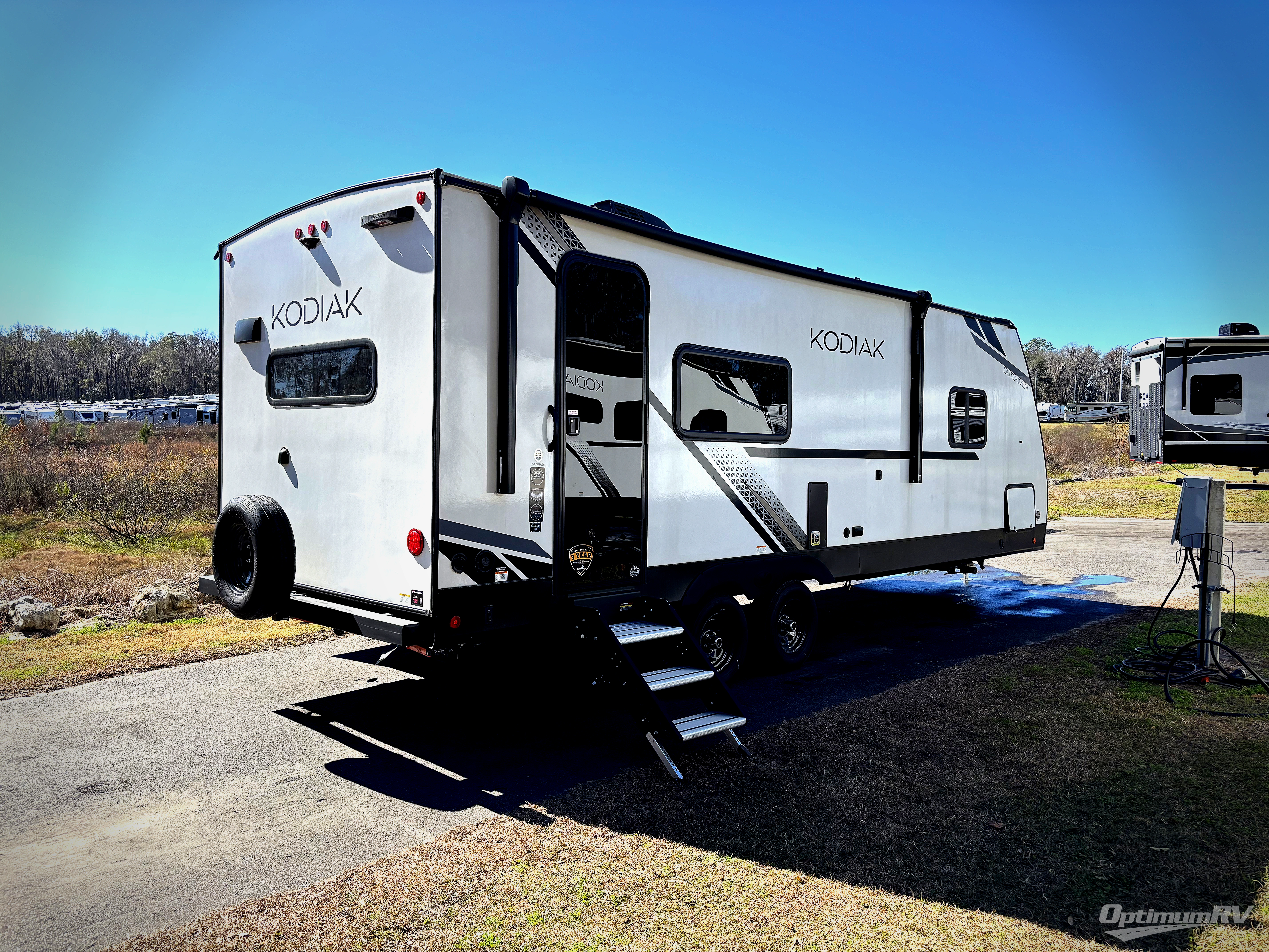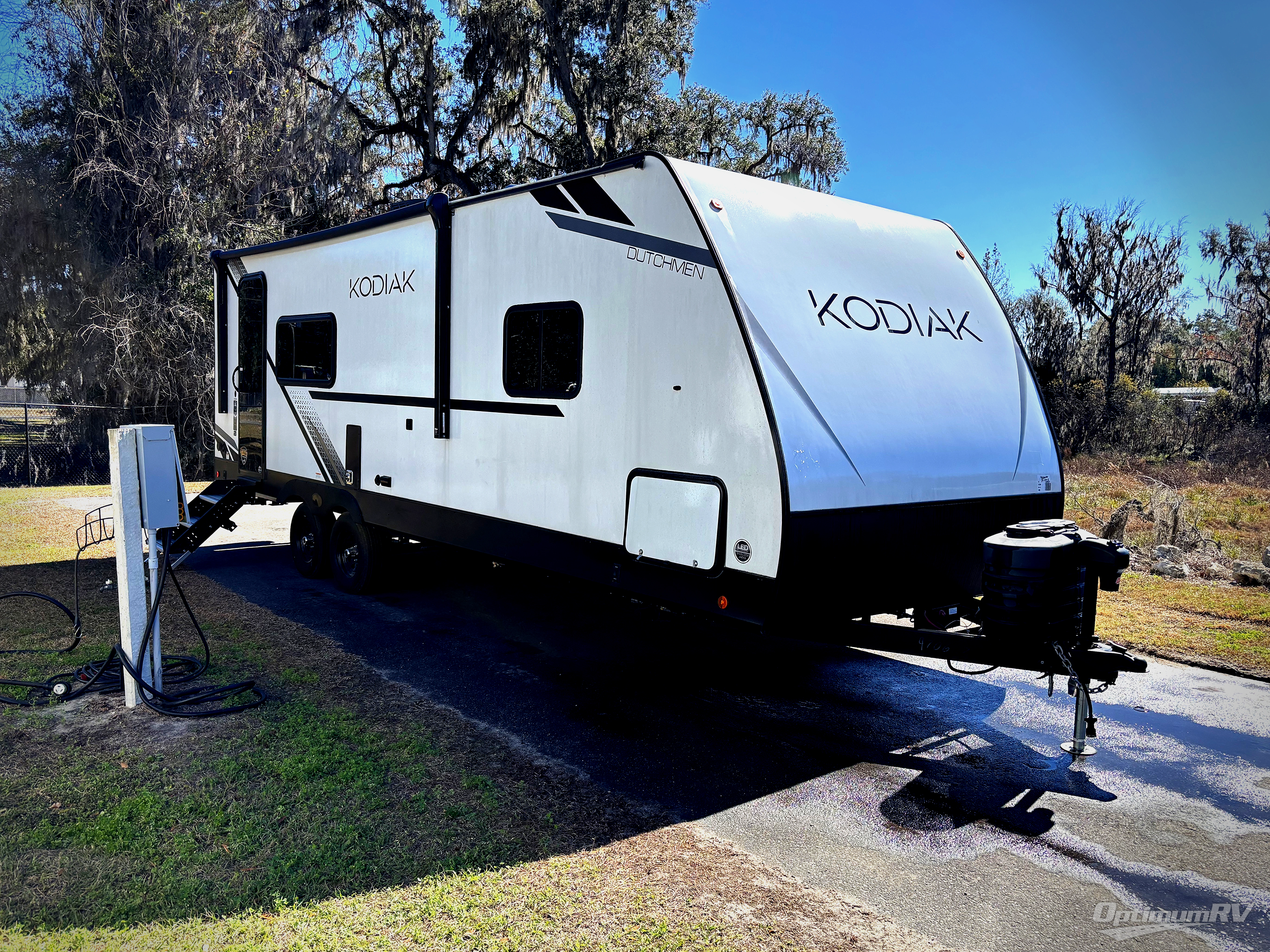 Each Kodiak Ultra-Lite travel trailer by Dutchmen includes a diamond front plate, easy lube axles, and a power tongue jack for hassle-free towing. The bear cave storage will allow you to bring along all the camp gear, and the power awning with an LED light will create an inviting outdoor space. Head inside to enjoy the designer valances, blackout roller shades, and seamless countertops. There is also HyperDeck flooring that will withstand your many adventures plus a 6' 8" interior height for more head room. A high output furnace and 13.5k BTU A/C will keep you comfortable, and the on-demand tankless water heater will provide instant hot water when you need it!