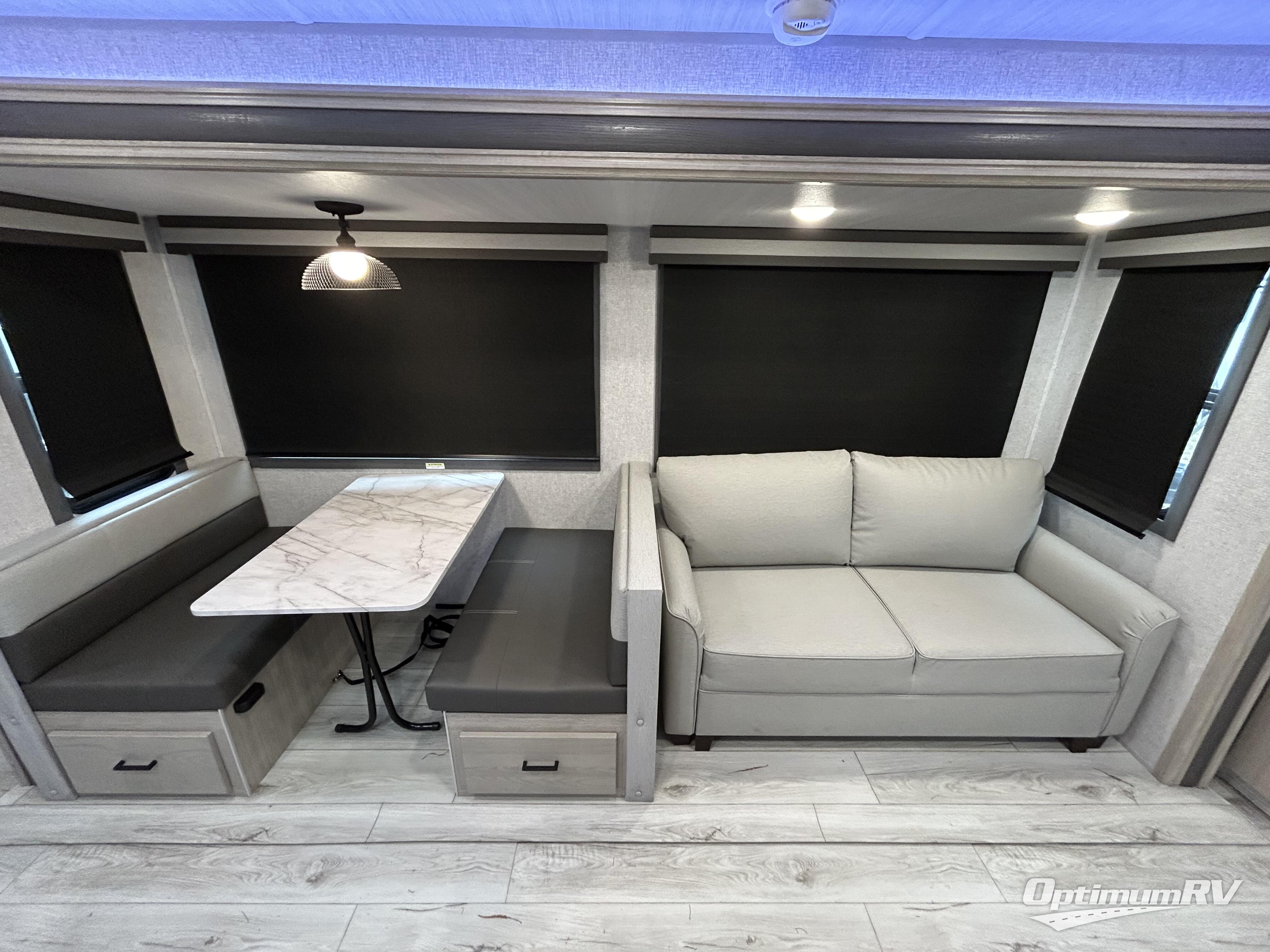If you're looking for a travel trailer to take tailgating, this Alta model is the one! After you've unloaded the pass-through storage and set up the 21' power awning, start lunch on the outside kitchen! Since there are dual entry doors you can enter in through the main living area, or the full bath for convenience. The little ones are sure to spend most of their time in the rear bunkhouse that includes a flip-up bunk under the sofa, plus a second bunk across the room. The adults can visit at the booth dinette or on the tri-fold sofa, and check out the front private bedroom with sliding doors and a king bed for all-around comfort!