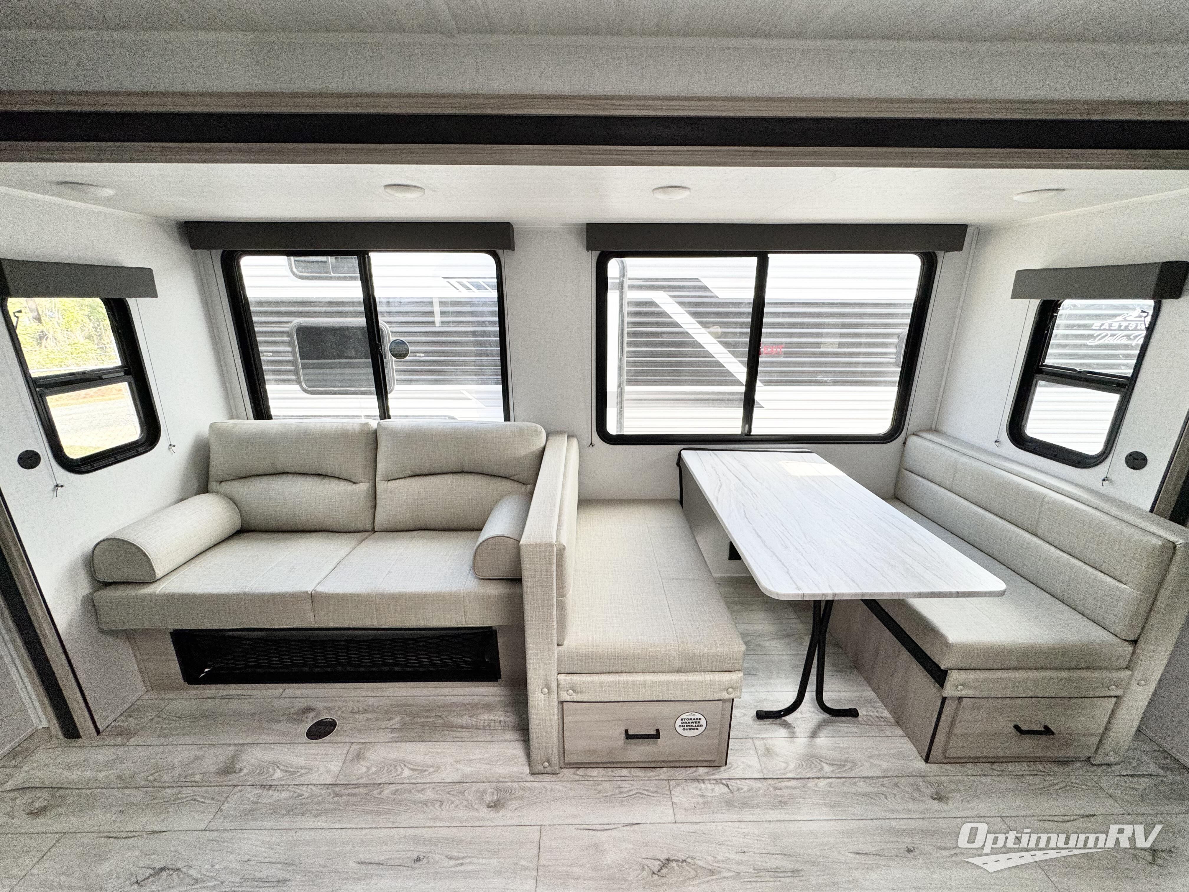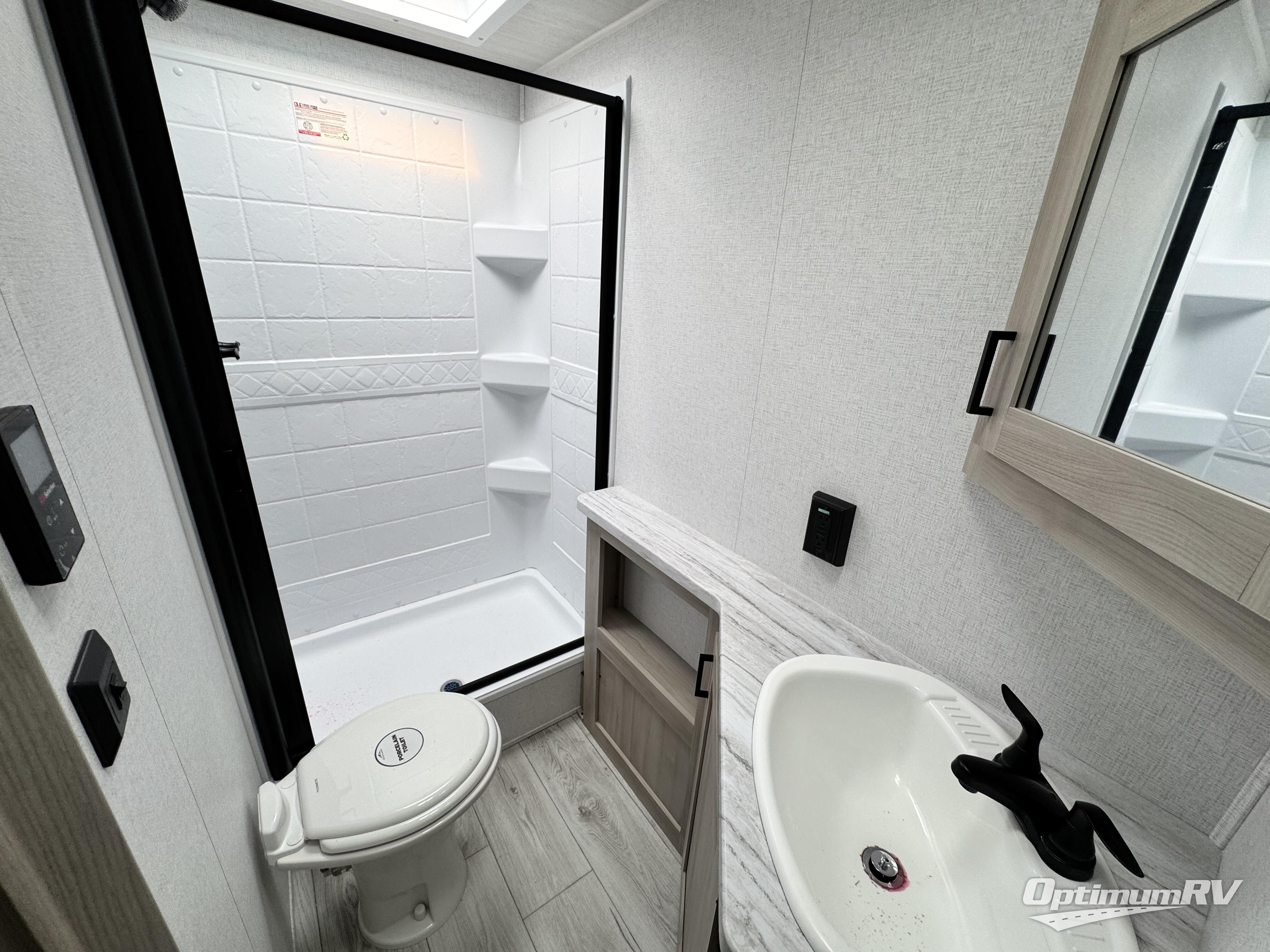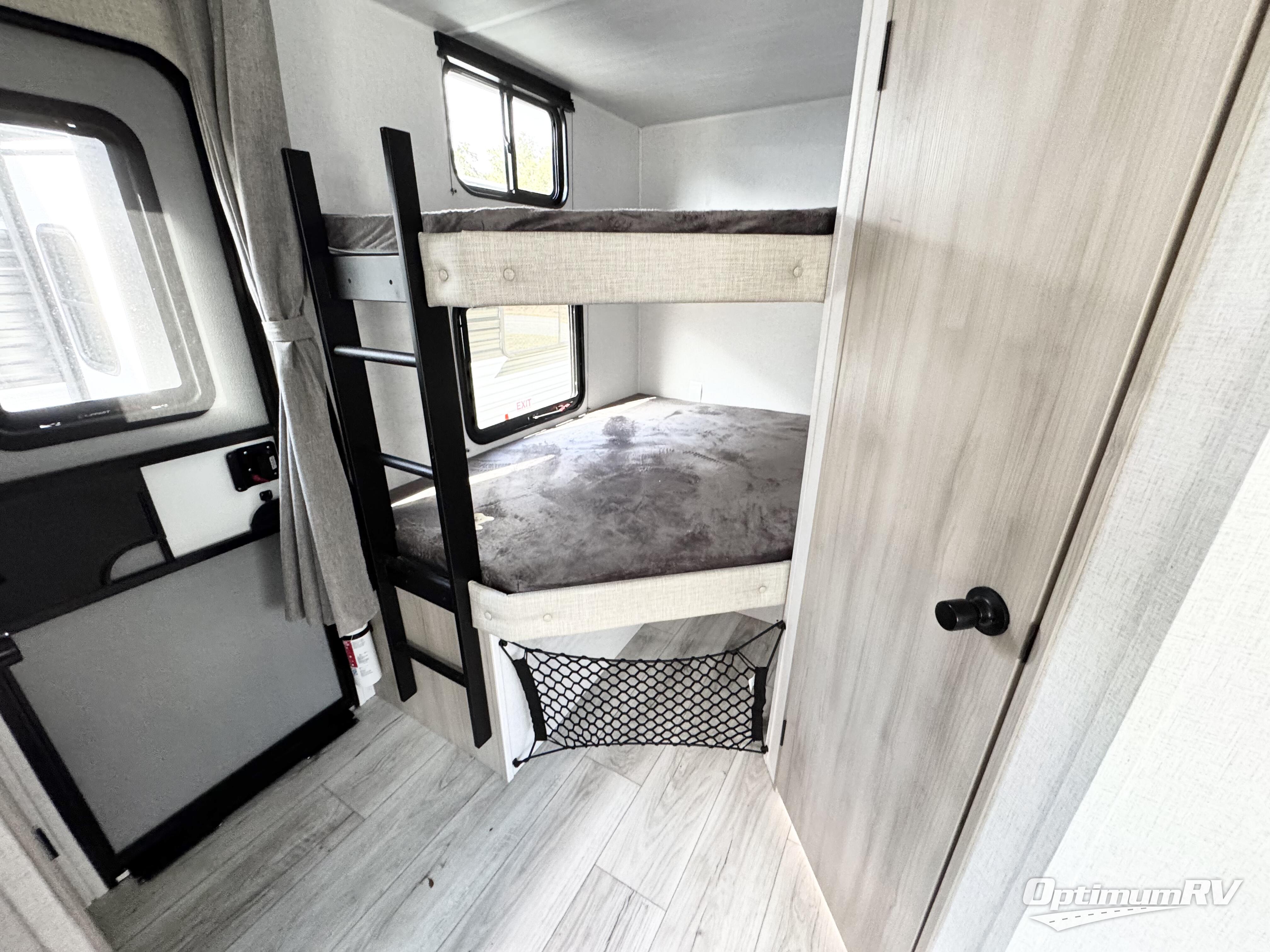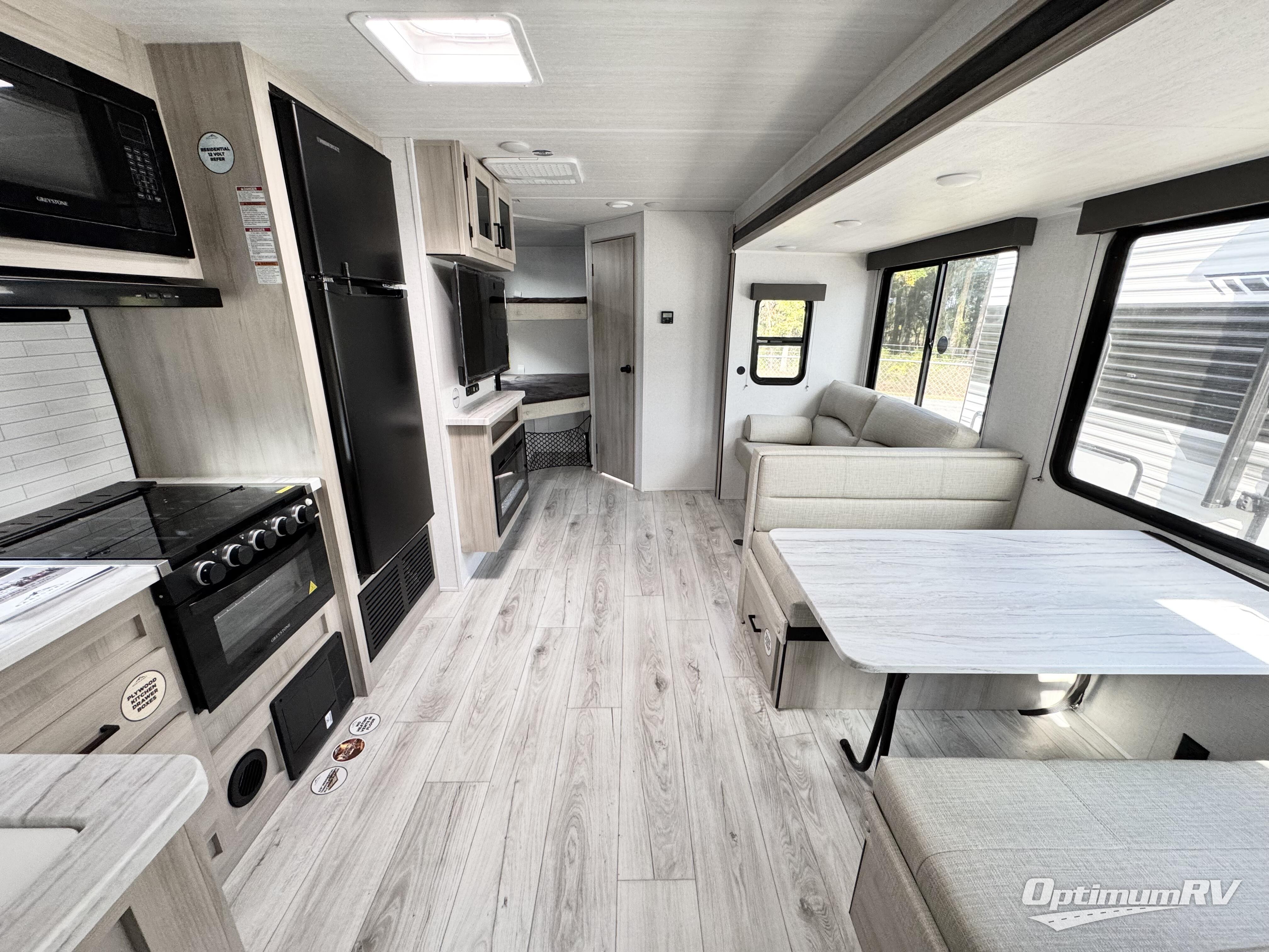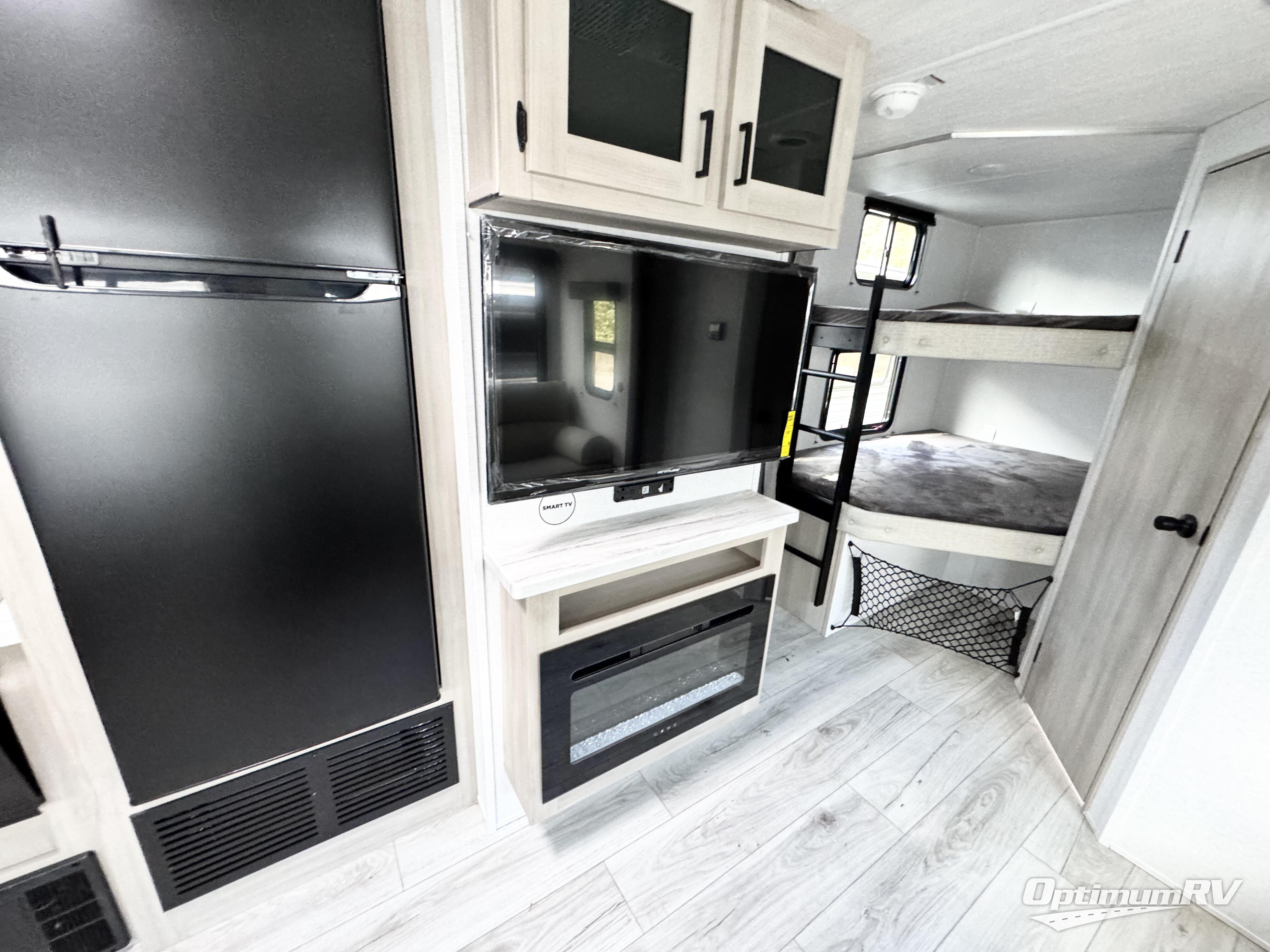 Pack up the whole gang since this unit features sleeping for eight to ten! As you enter you will find easy access to the rear corner bath including a 30" x 36" shower, toilet, and vanity with a sink, plus medicine cabinet just steps away. The slide creates an open and spacious feel for relaxing and dining inside. Here you will find a jiffy sofa and booth dinette with both featuring underneath storage. You will sleep like a king in the front private bedroom with a king bed and a space saving sliding door. Your family and or friends will love sleeping on the double-size bunks and furniture once easily setup for nighttime. This unit also features pass-through storage outside, more exterior storage beneath the double bed bunks, and an outside kitchen with a refrigerator and pull-out griddle.