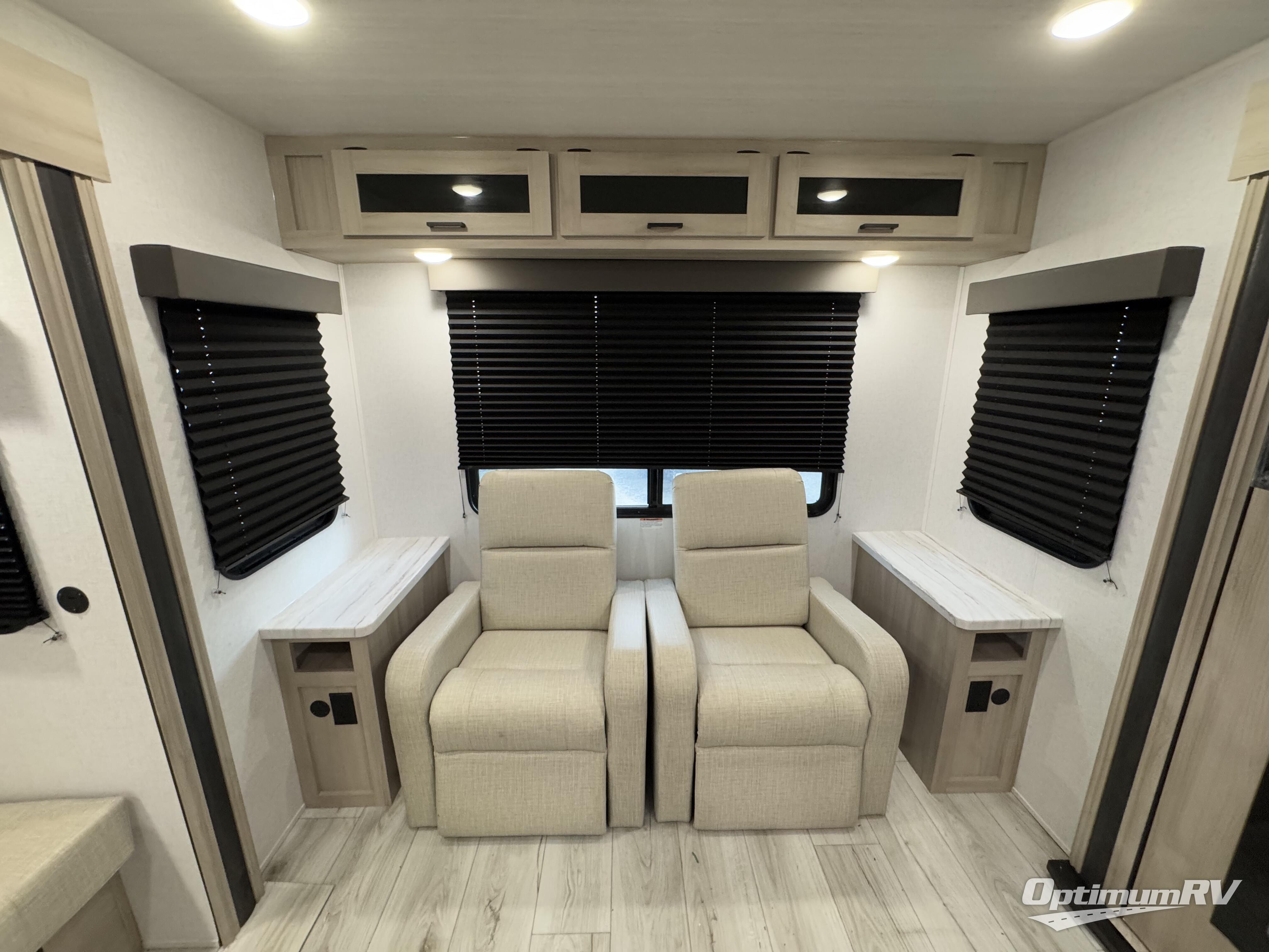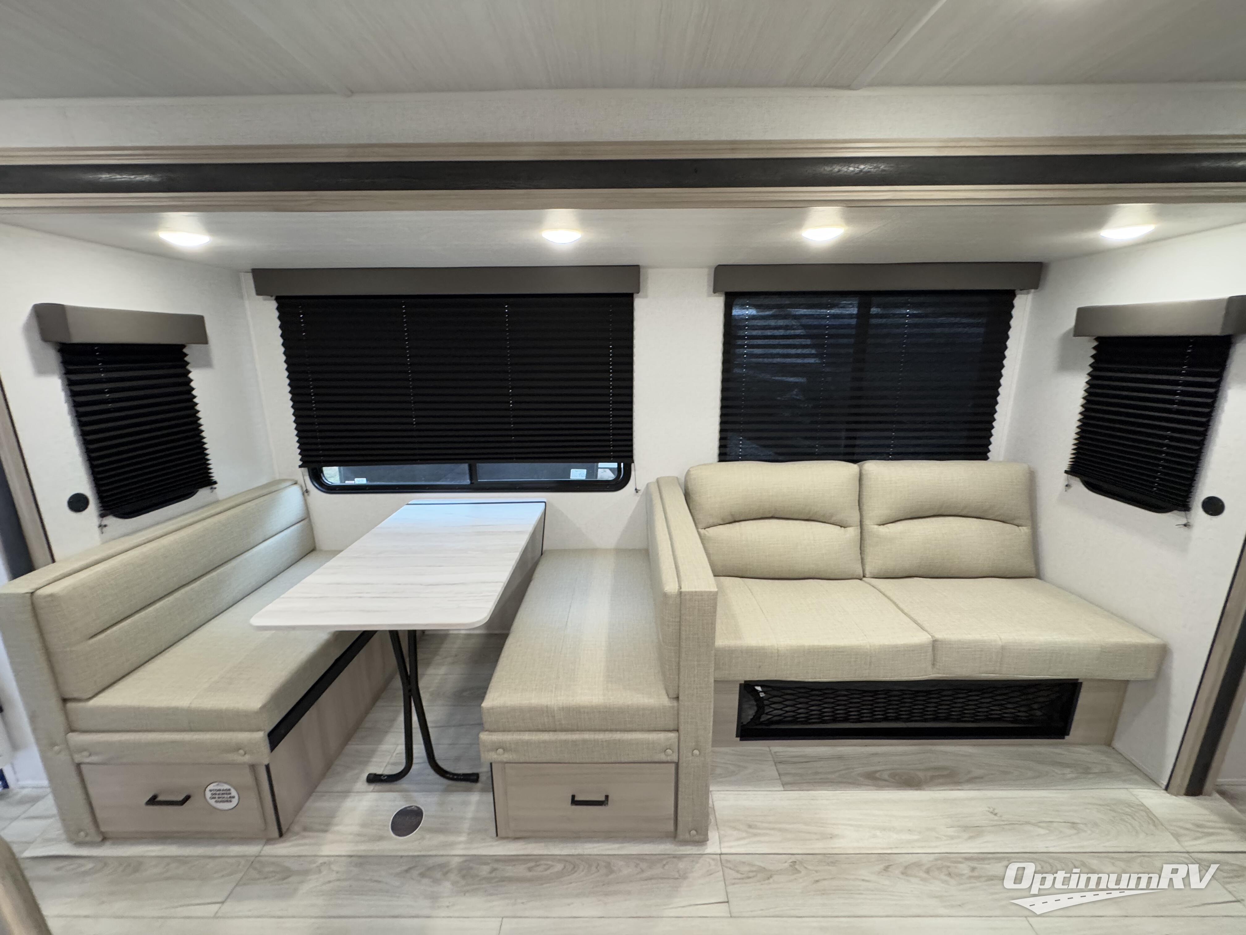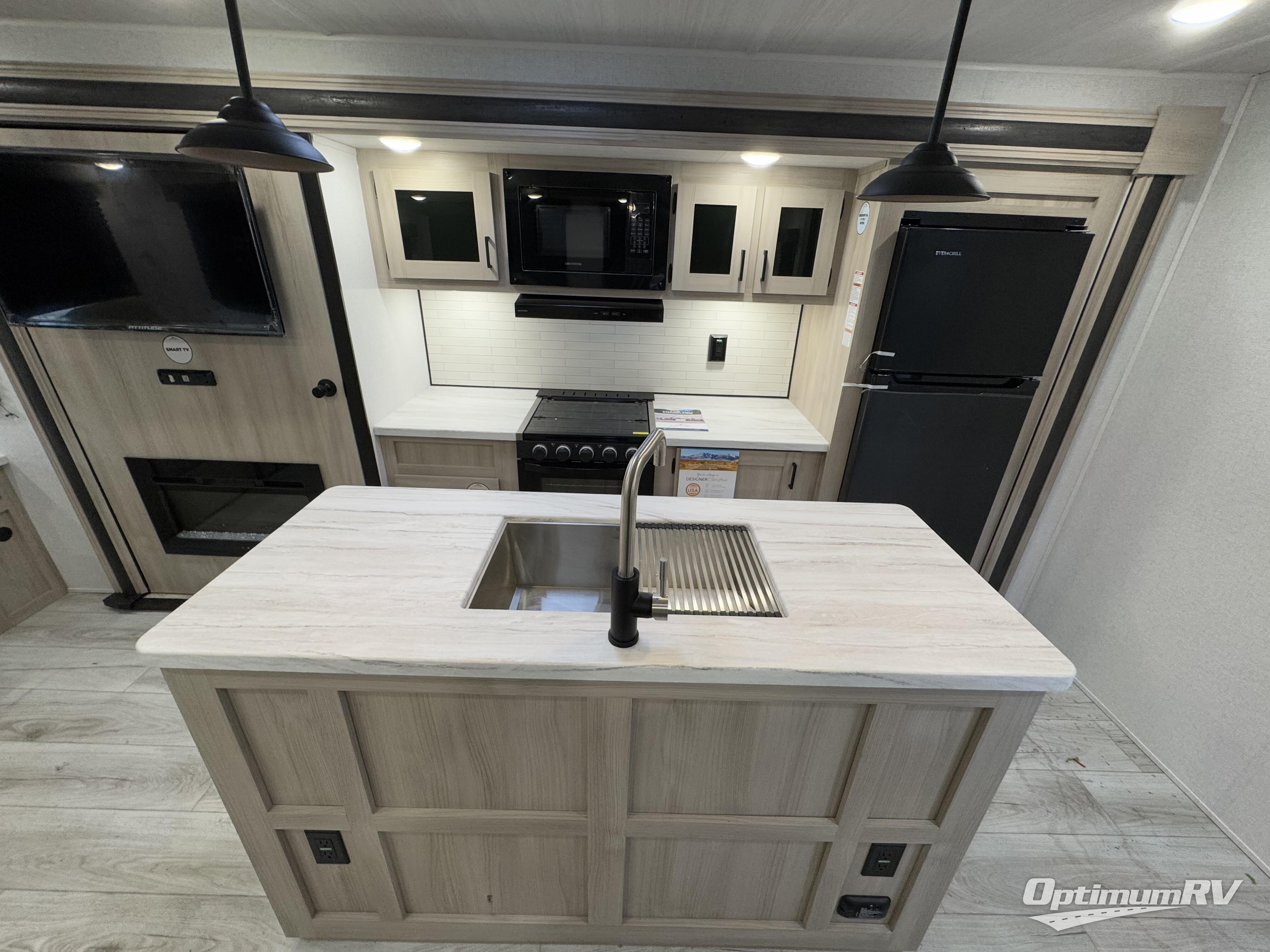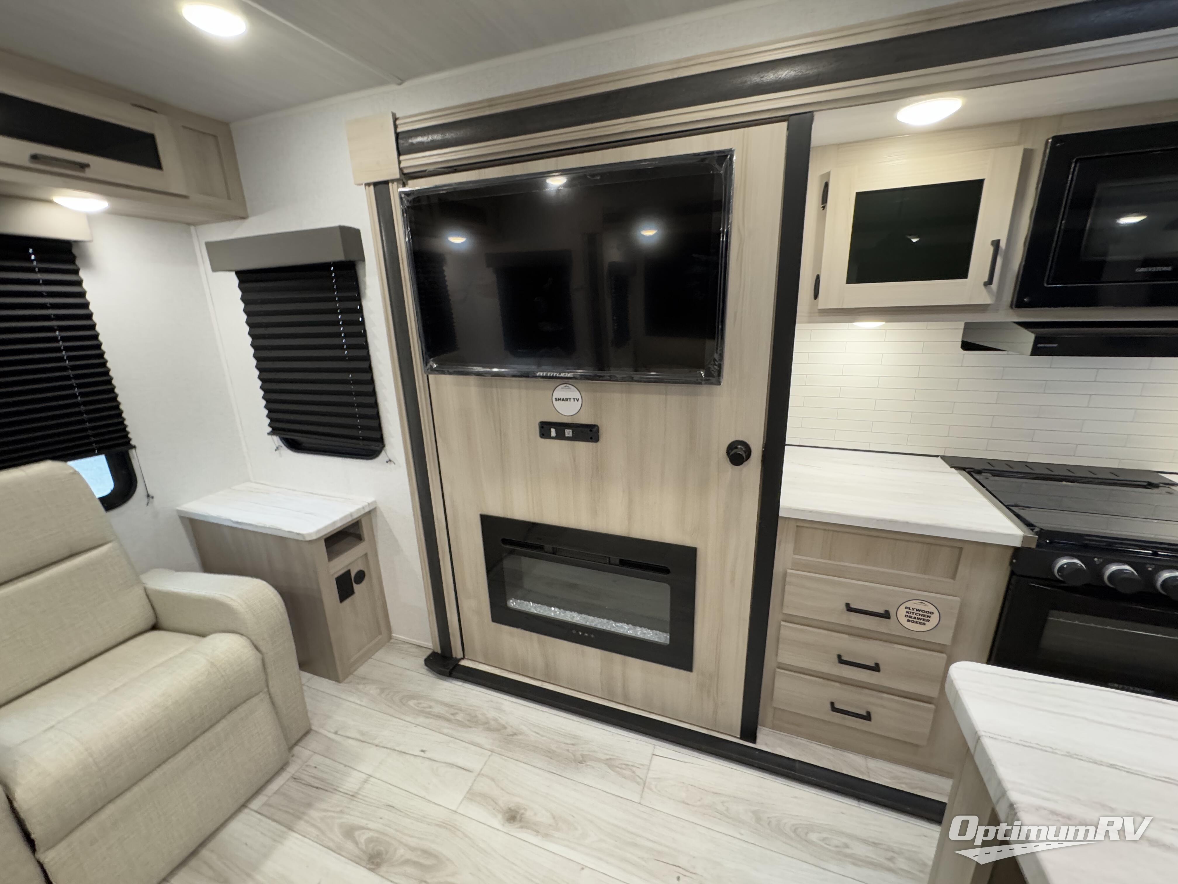 Camping in this double slide out travel trailer will be easier than ever! Once you arrive at your destination, set up the power awning, unload the pass-through storage, and head inside to make lunch in the full kitchen. There is a kitchen island for more prep space, along with a 10.7 cu. ft. 12V refrigerator, three burner range, and microwave oven. You'll find comfortable seating space on the booth dinette, jiffy sofa, and dual lounge chairs, and the fireplace is sure to make your space feel more like home. There is also hidden storage behind the fireplace for pantry items, board games, and more! Up front, a full bath and front private bedroom will let you freshen up before a great night's rest on the king bed!