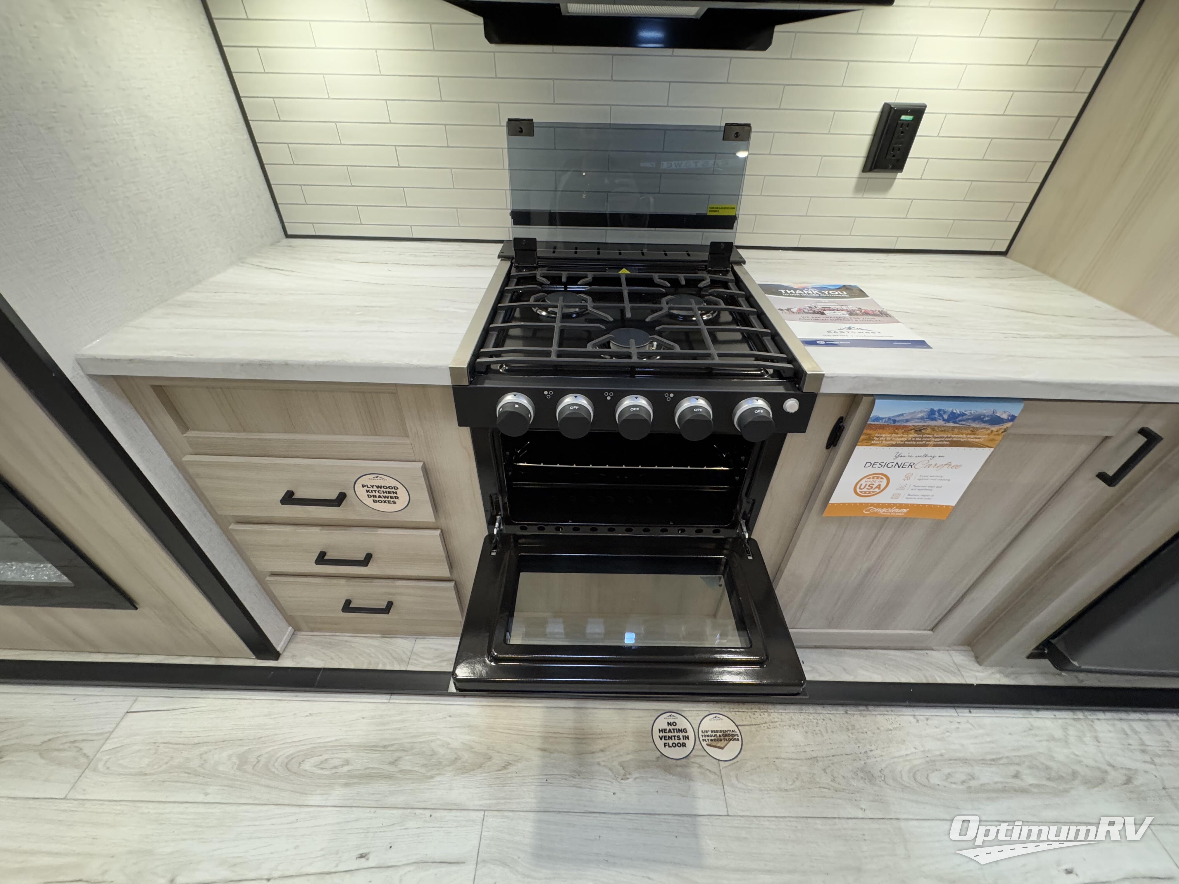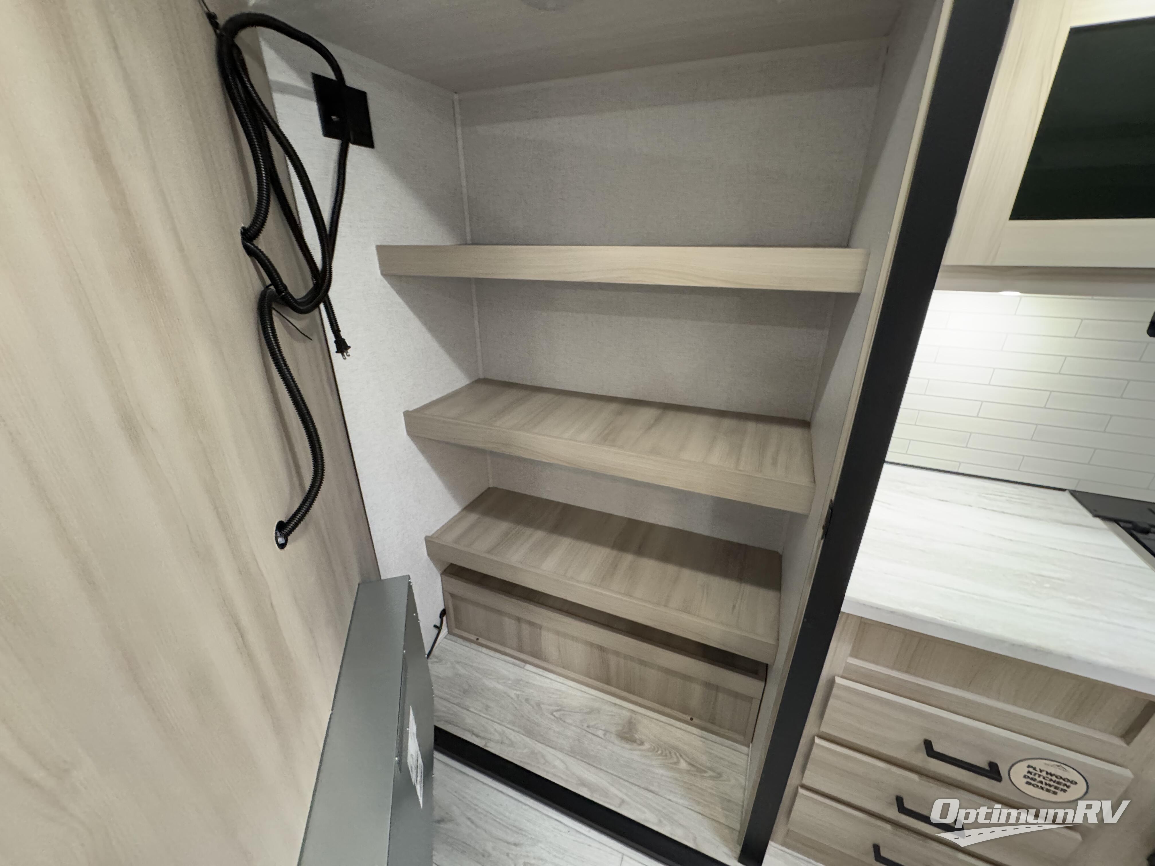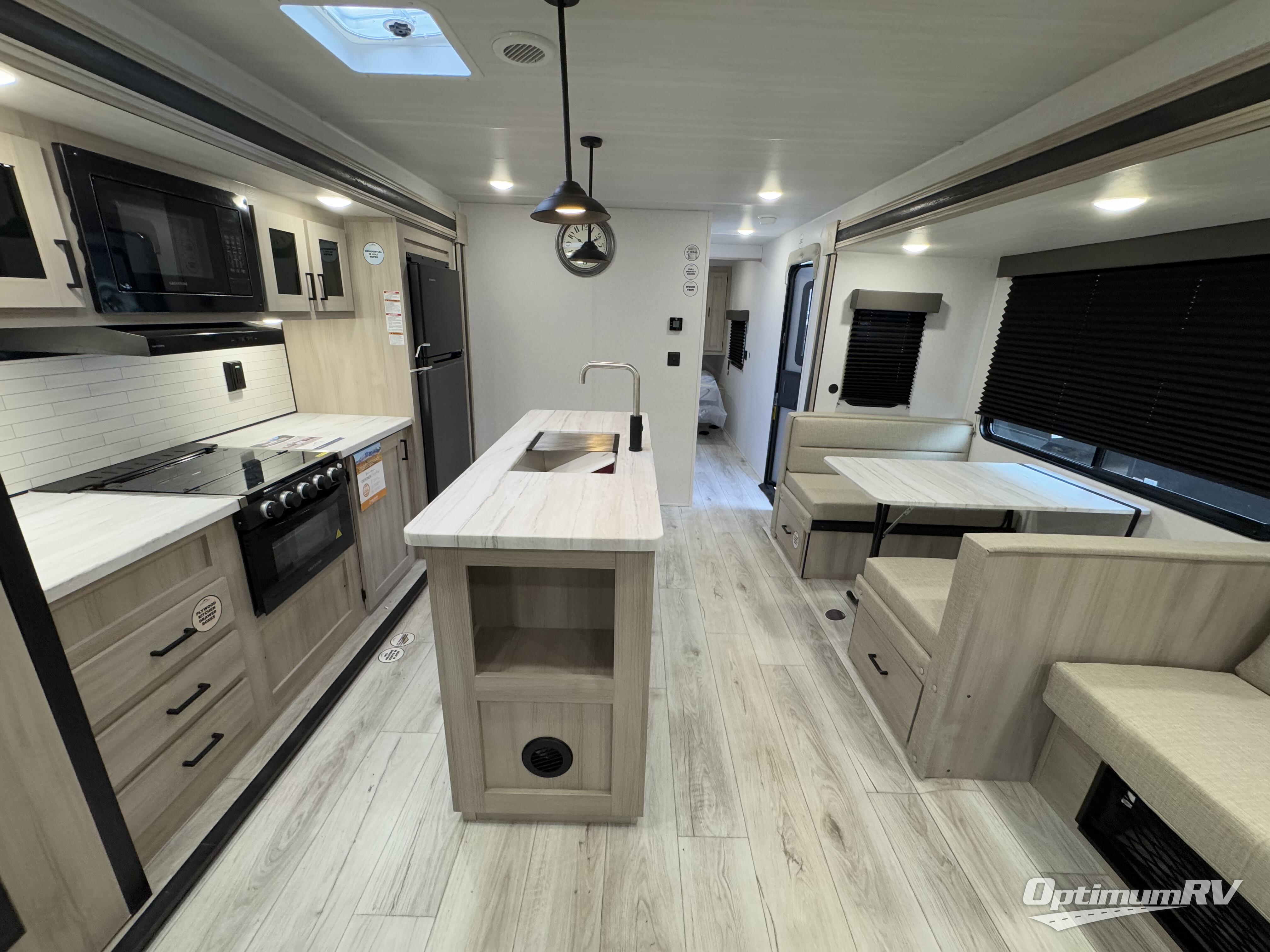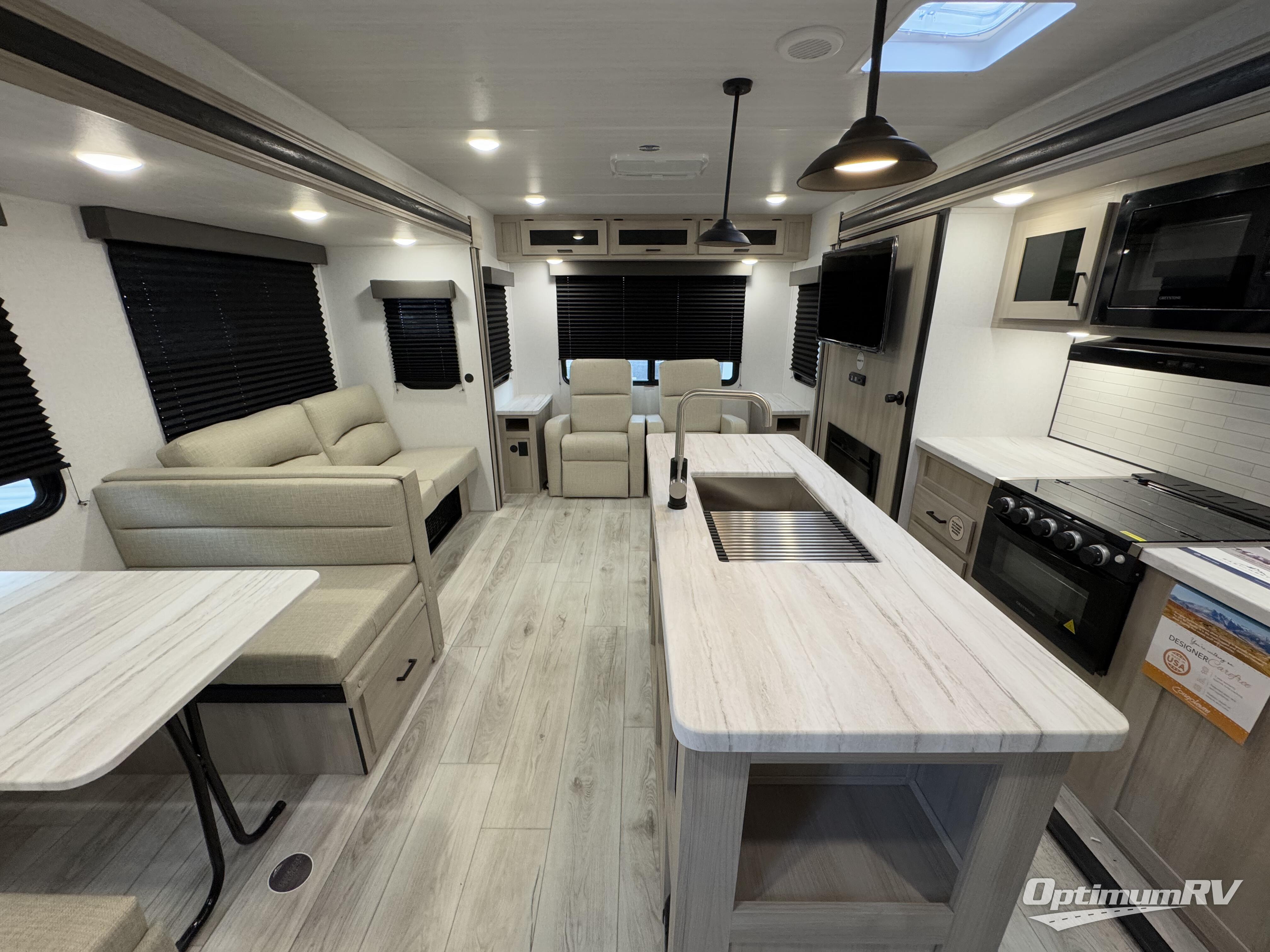 Camping in this double slide out travel trailer will be easier than ever! Once you arrive at your destination, set up the power awning, unload the pass-through storage, and head inside to make lunch in the full kitchen. There is a kitchen island for more prep space, along with a 10.7 cu. ft. 12V refrigerator, three burner range, and microwave oven. You'll find comfortable seating space on the booth dinette, jiffy sofa, and dual lounge chairs, and the fireplace is sure to make your space feel more like home. There is also hidden storage behind the fireplace for pantry items, board games, and more! Up front, a full bath and front private bedroom will let you freshen up before a great night's rest on the king bed!