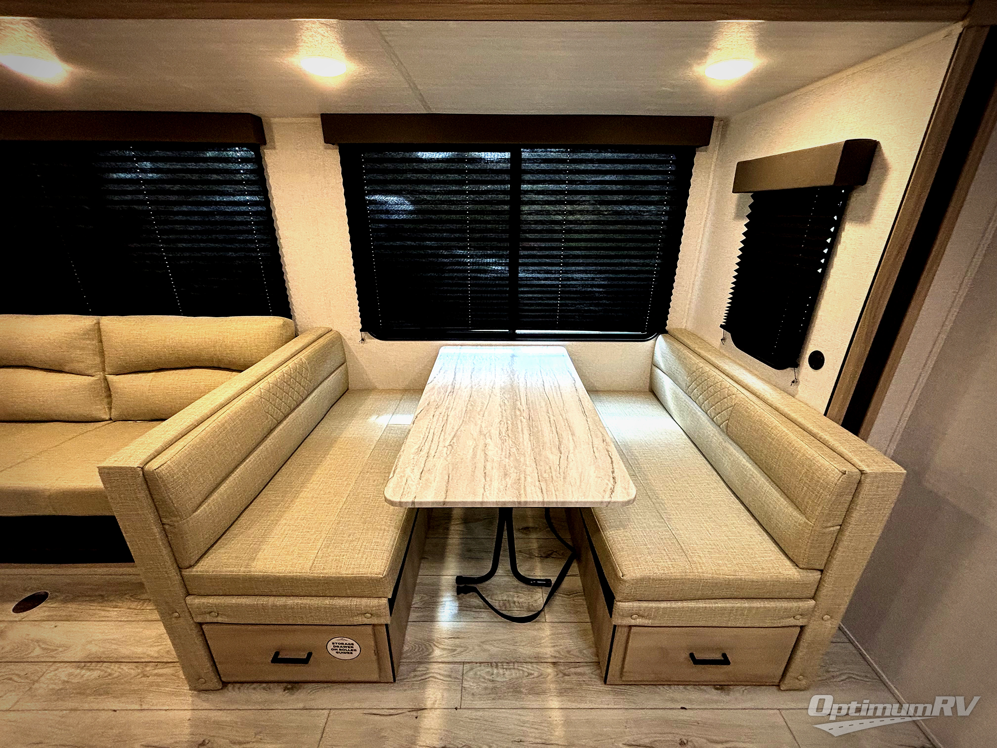 Head to the RV park for a long-weekend or week-long break from your everyday routine with this trailer at your favorite campsite. After setting up the two slide outs and the 15' power awning, you can relax inside on the jack knife sofa, dine at the oversized booth dinette or whip up a meal in the L-shaped kitchen. Everyone will enjoy the fireplace no matter what you are doing. The walk-through bathroom is super convenient, and the front bedroom allows you to live like royalty in privacy. The rear bunkhouse also offers privacy and includes three bunk beds and a sofa, plus storage. Your kids or guests will love having their own room. And the exterior offers an optional outdoor kitchen, an oversized pass-through storage for your larger gear like fishing poles, outdoor tables and bags of charcoal, plus there are two spray ports to easily rinse off dirty bikes, shoes and such.