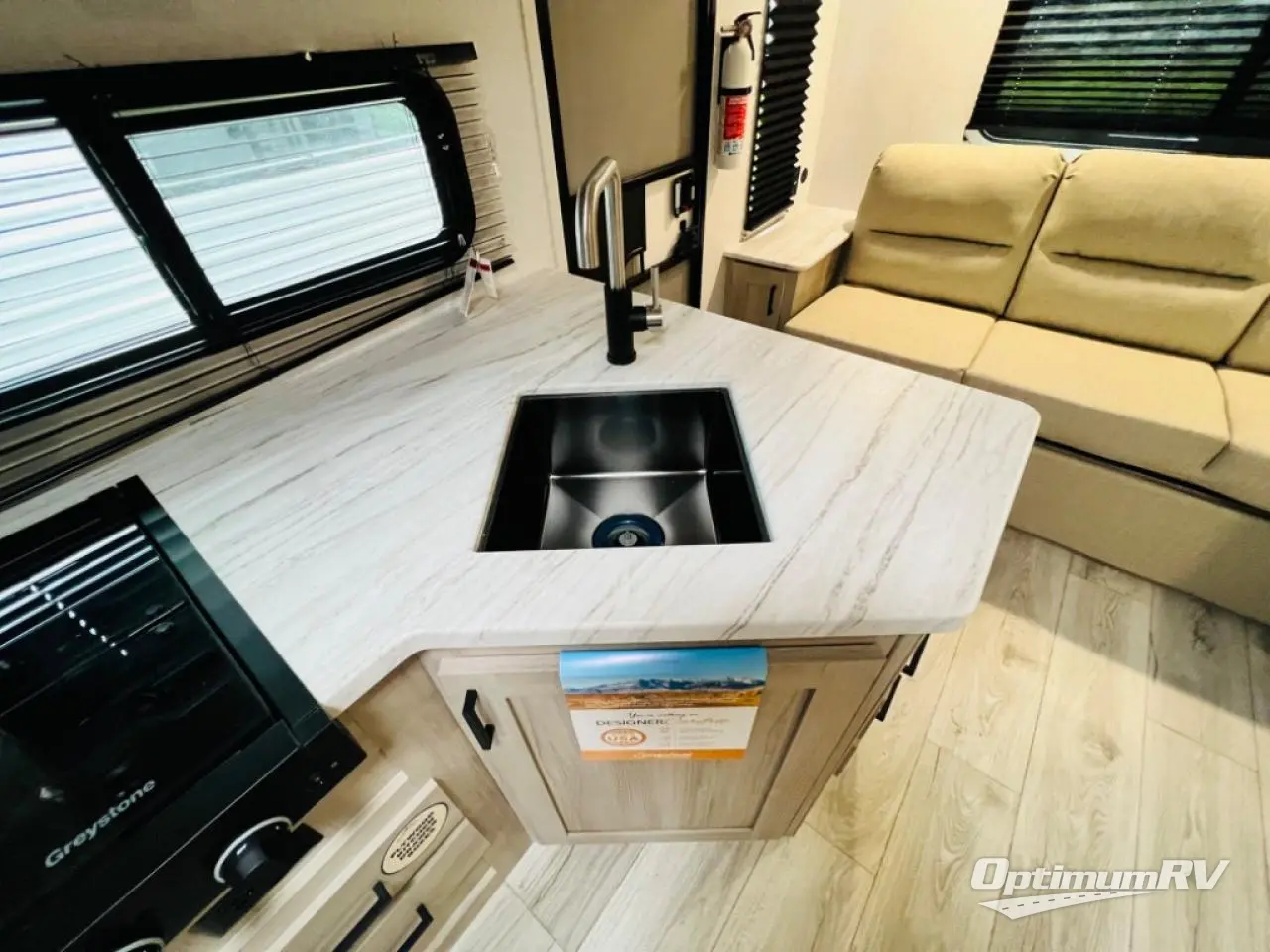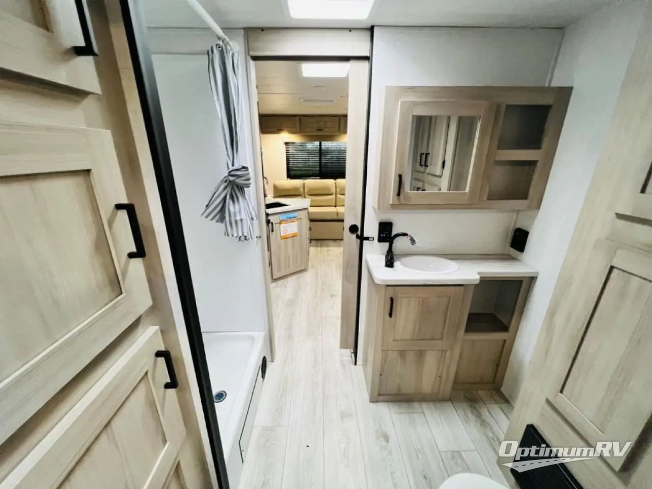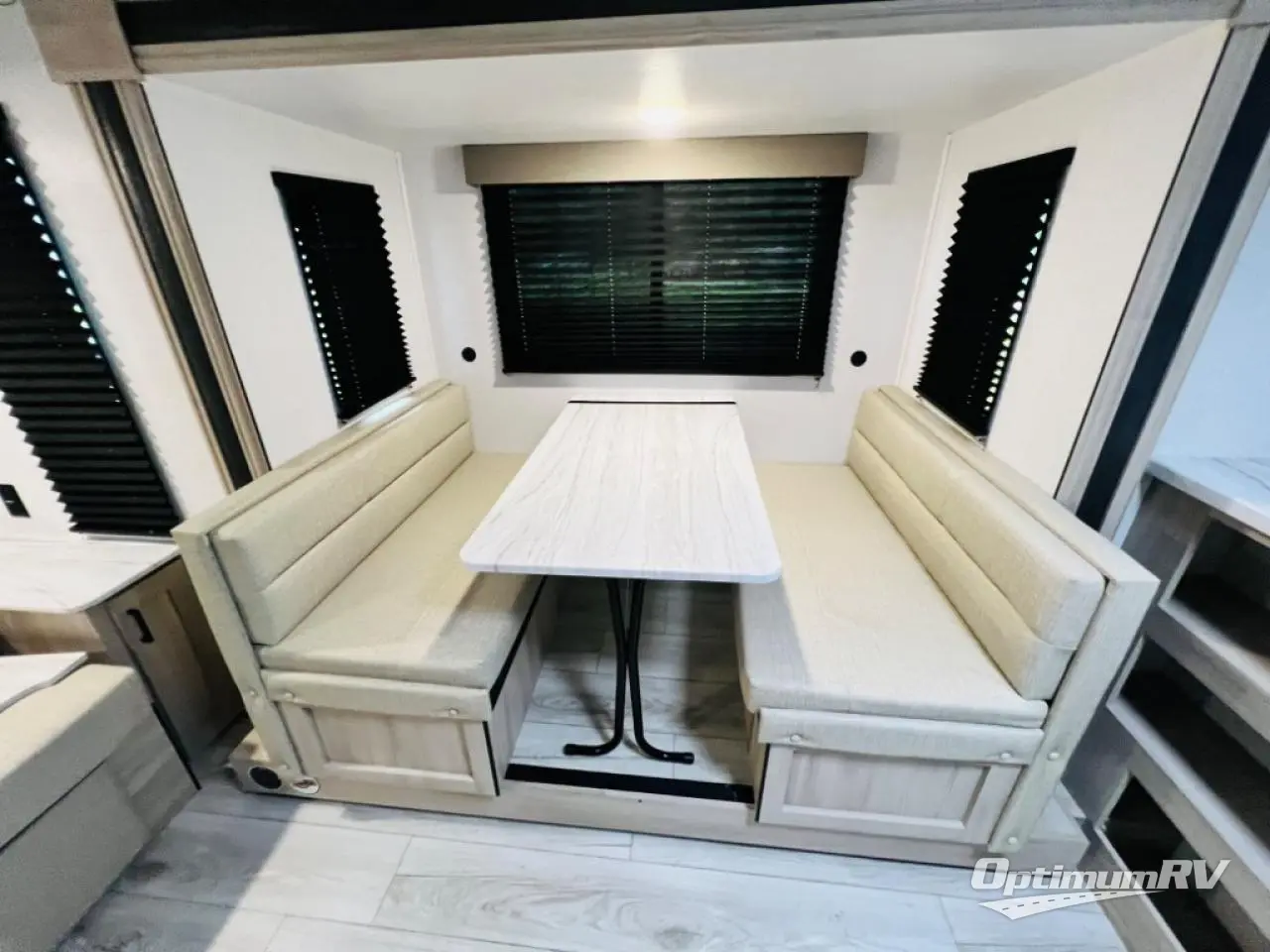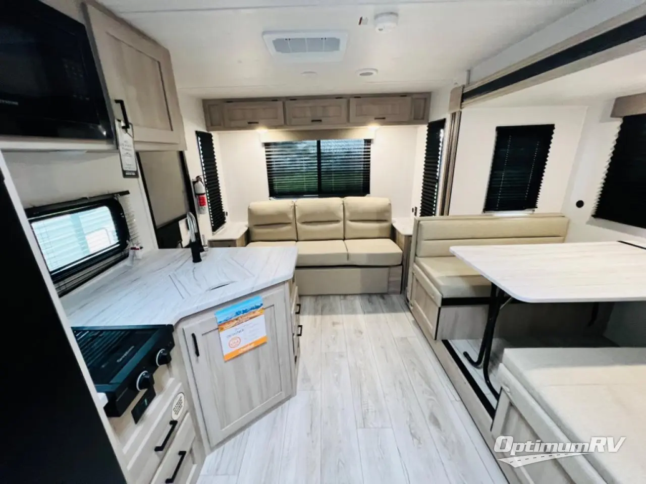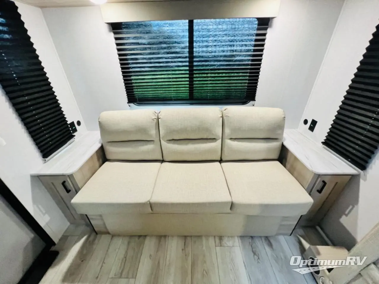 A perfect Della Terra LE model for six! There is plenty of seating inside with a booth dinette slide and a jackknife sofa. The slide allows more interior space, and there is ample storage beneath both, as well as in overhead cabinets throughout. A spacious kitchen features an angled counter with a large sink, plus a two burner stove with a glass top to create more counterspace when you are not cooking. A walk-through bath offers a spacious area to get cleaned up featuring a walk-in shower on one side and a toilet with vanity and sink on the other side. Space saving sliding doors make it easily accessible. In front, you'll find a private king bed with dual nightstands and wardrobes, plus storage beneath the bed and in overhead cabinets as well. There is a hookup for the TV here as well as another in the living room at the entertainment center so you have the option to enjoy movies. A front pass-through storage space provides plenty of room to stow away fishing poles, outdoor games, rugs and outdoor equipment, and so much more!