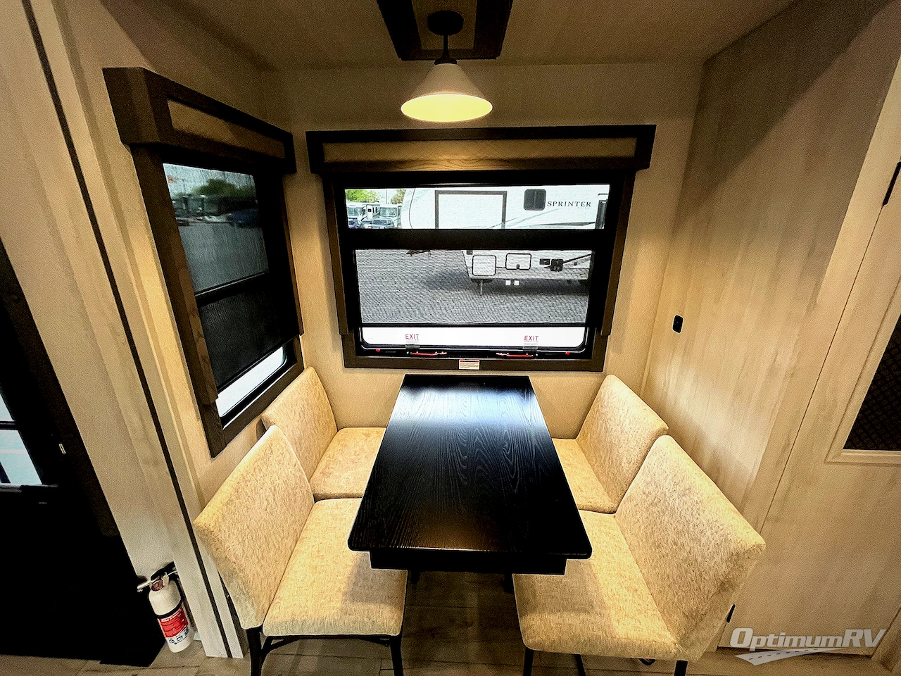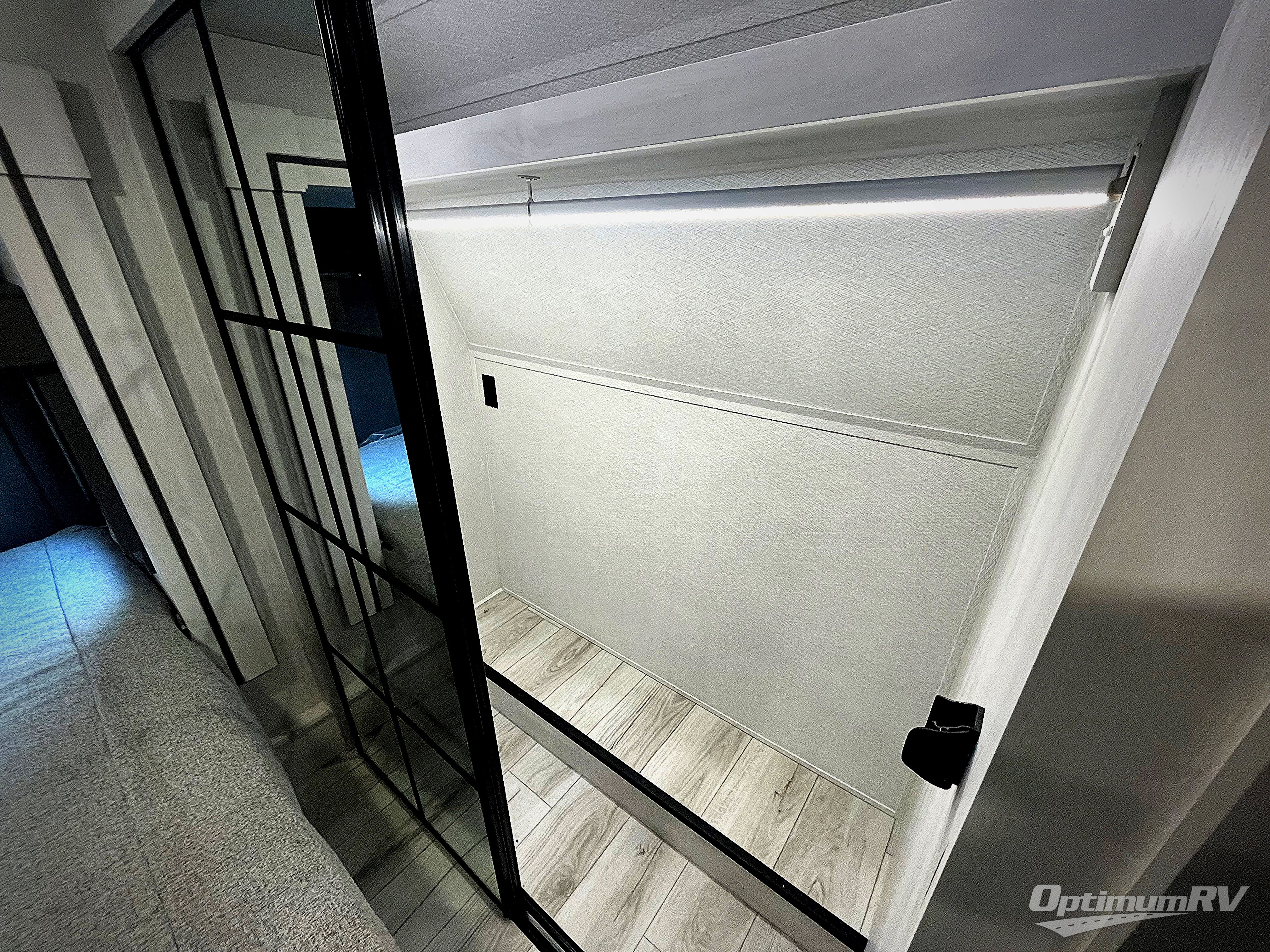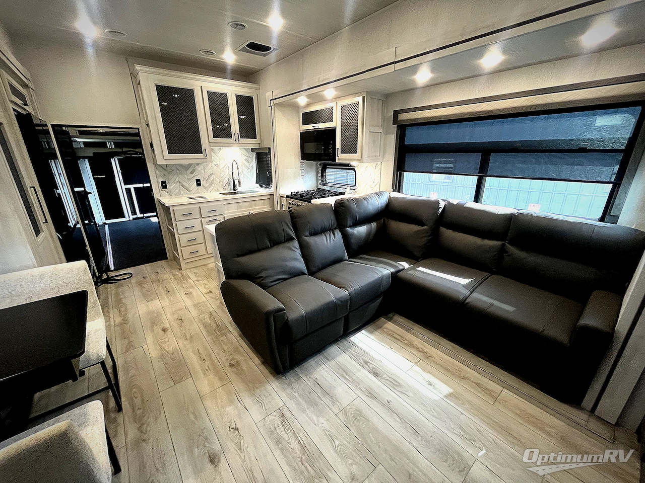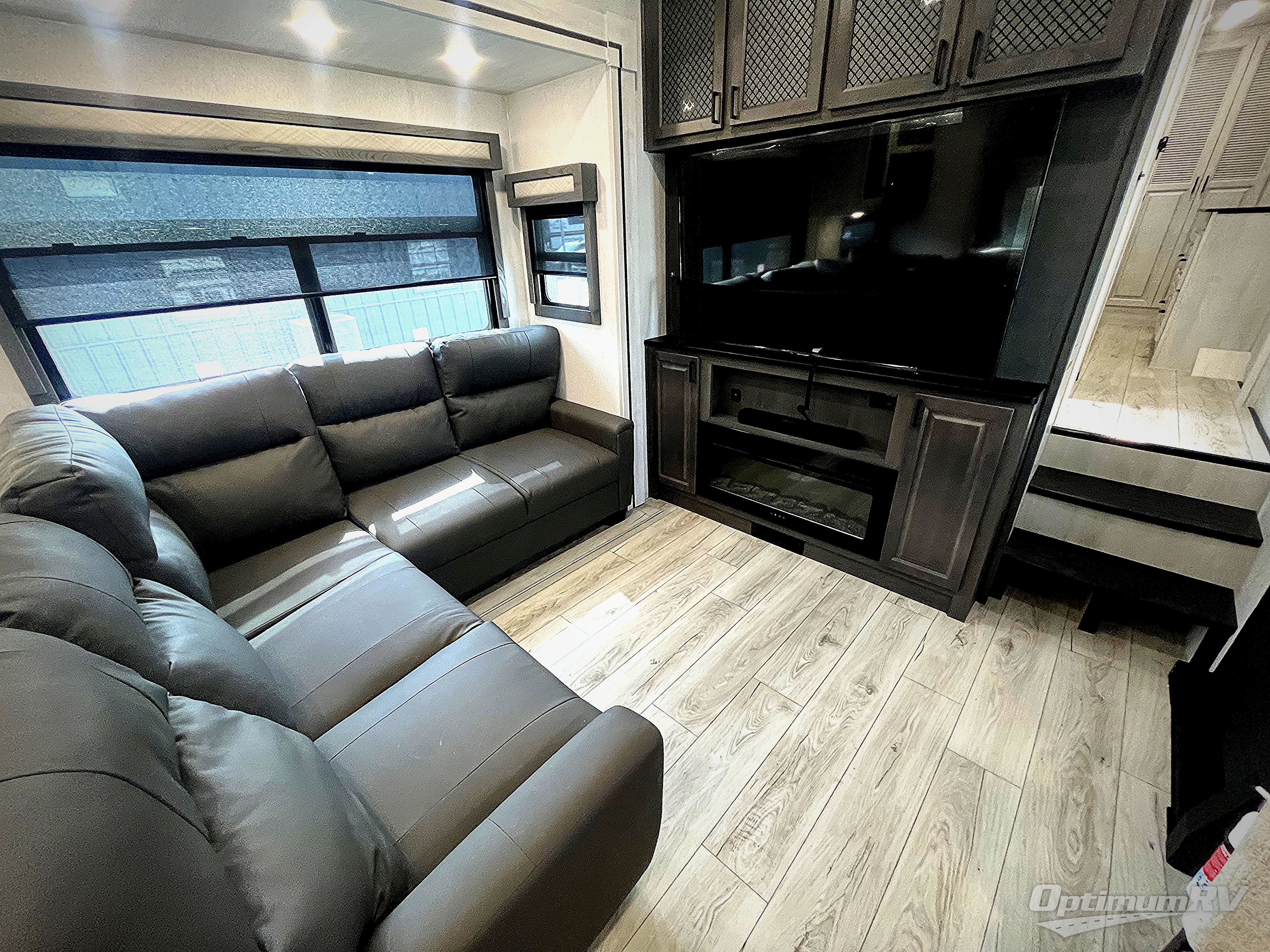 A toy hauler for all family members! The front bedroom features a plush king bed with storage underneath and shelves beside the bed, plus, a sliding dresser top, hidden storage, and a spacious closet. The full bathroom boasts a linen closet and a spacious 38” x 42” shower, ideal for freshening up after a hot day. The living room is a haven of entertainment, equipped with an entertainment center featuring a fireplace and EZ out sofa, perfect for cozy nights in. Moving to the kitchen, you will find a four-burner cooktop, 16 cu. refrigerator, 30” convection microwave, overhead cabinets, pantry, shelves, a free-standing dinette and a bar top prep, perfect to give you an at-home experience. The garage is the ultimate adventure zone, featuring a 28 x 27 bunk mat above, a washer and dryer prep below, a dual Happijac sofa, a queen bed above and in-floor storage, perfect for toys, gear, or just relaxing with friends! Step outside and enjoy the patio kit/ramp door, two entry/two exit doors, and ample shade from the 8’, 10’ 9”, and 16” awnings. With its unique blend of comfort, style, and adventure-ready features, this toy hauler is the perfect vehicle for anyone looking to hit the open road and make unforgettable memories.