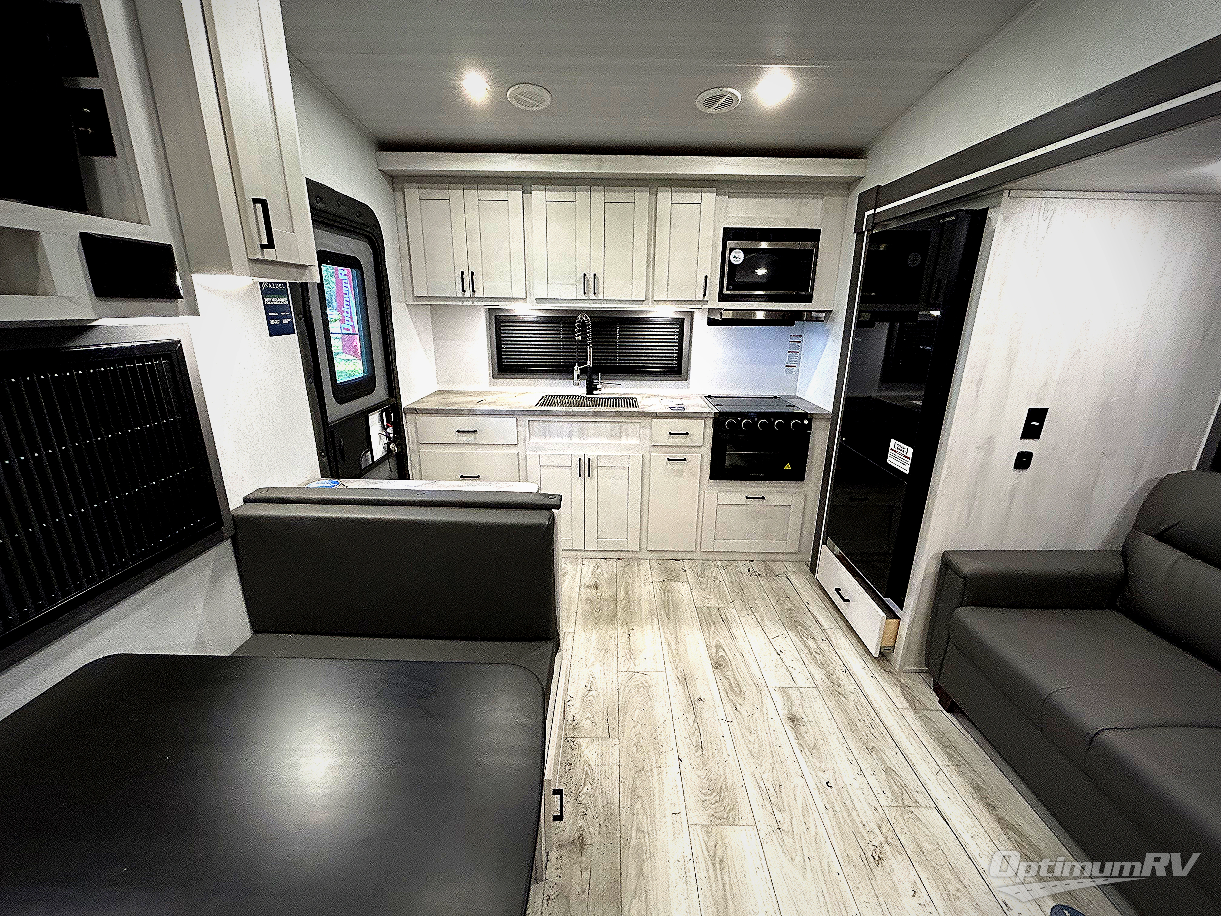 This fifth wheel is perfect for a couple who wishes to escape the hustle and bustle of everyday life! The front private bedroom has a king bed with storage underneath to store extra blankets and a TV prep area for extra entertainment. Freshen up each morning in the full bathroom with the 30" x 36" shower with a skylight for added natural lighting. The rear kitchen has everything you need to prepare your best home cooked meals and a 10 cu. ft. refrigerator to keep your perishables fresh. The booth dinette offers a comfortable place to enjoy your meals, play games, and even transform into an extra sleeping space. Across from the 78" theater seating is a 50" TV at the entertainment center above the dinette. You also have a shoe storage area and overhead cabinets throughout to keep your items out of the way!