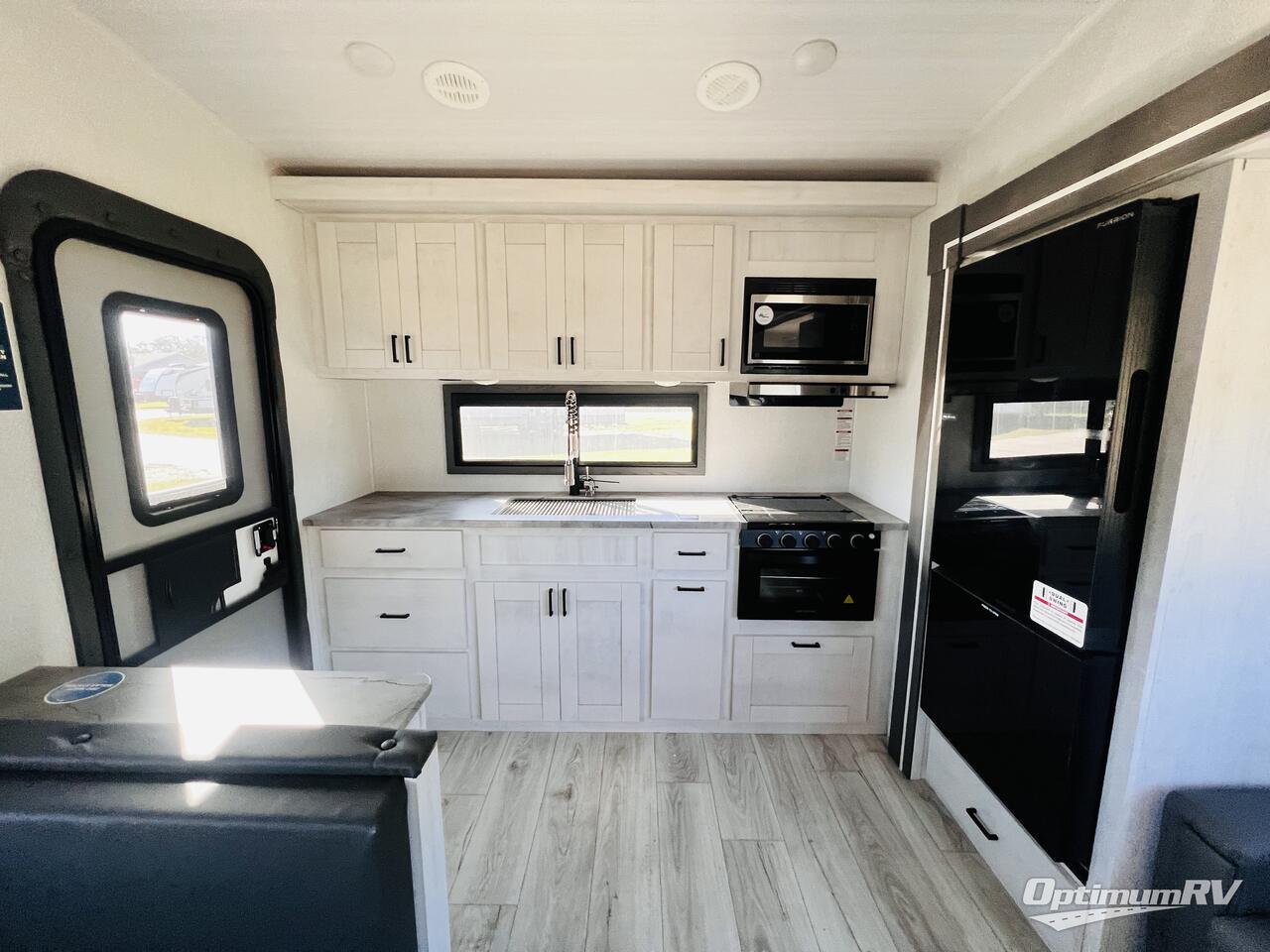 This fifth wheel is perfect for a couple who wishes to escape the hustle and bustle of everyday life! The front private bedroom has a king bed with storage underneath to store extra blankets and a TV prep area for extra entertainment. Freshen up each morning in the full bathroom with the 30" x 36" shower with a skylight for added natural lighting. The rear kitchen has everything you need to prepare your best home cooked meals and a 10 cu. ft. refrigerator to keep your perishables fresh. The booth dinette offers a comfortable place to enjoy your meals, play games, and even transform into an extra sleeping space. Across from the 78" theater seating is a 50" TV at the entertainment center above the dinette. You also have a shoe storage area and overhead cabinets throughout to keep your items out of the way!