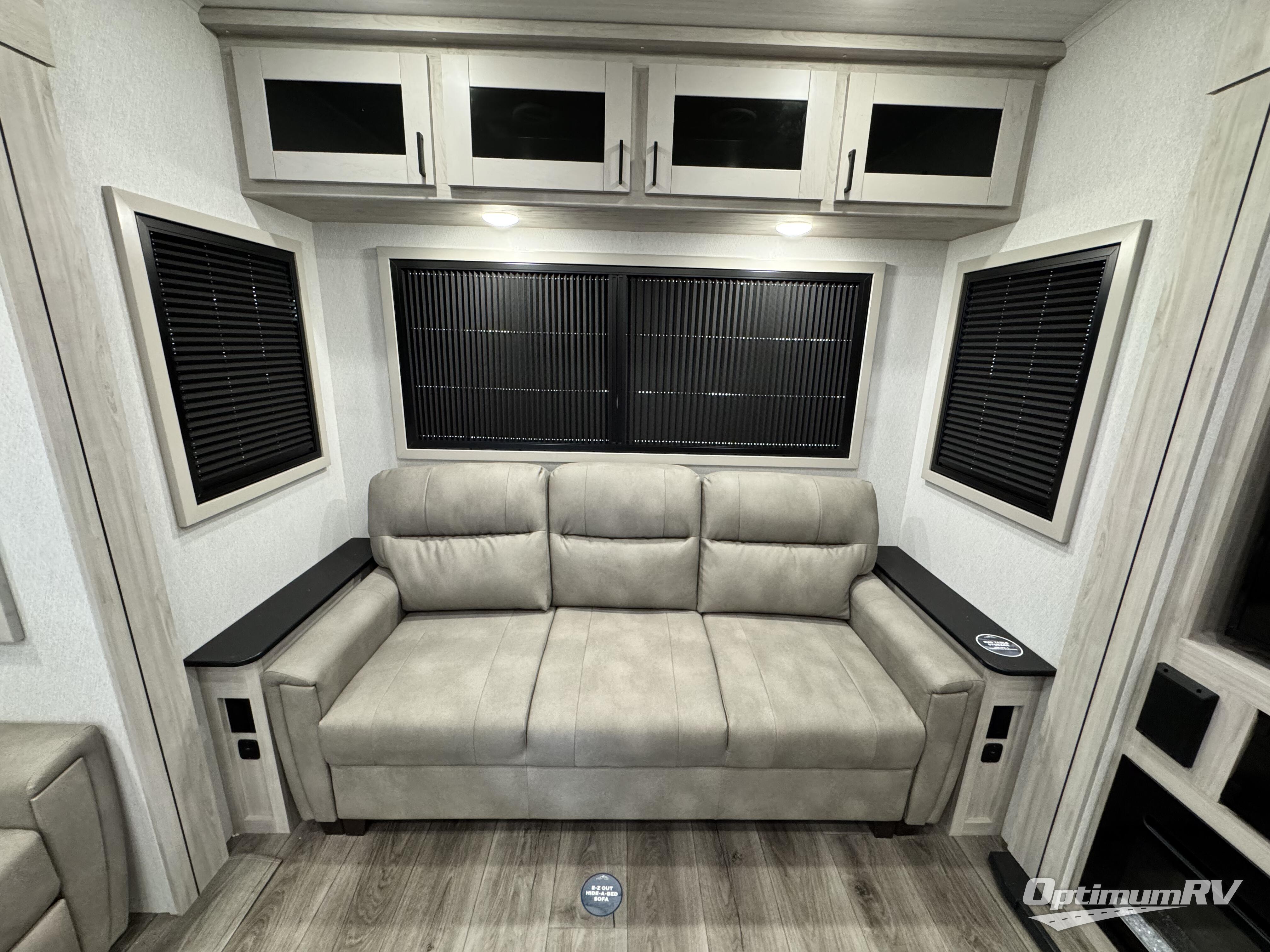 Take this Tandara fifth wheel out to the campsite and experience luxury while you camp! You will have a front private bedroom that is quite impressive with its full-width wardrobe, king bed slide with bedside shelves, under-bed storage, and a dresser with a TV prep area. The kitchen island is easy to gather around while you're cooking dinner or enjoying a late-night snack, and the hide-a-bed sofa will be comfortable for lounging or sleeping. As you spend time outside under the two electric awnings, you can grab some extra charcoal or camping chairs from the oversized pass-through storage.