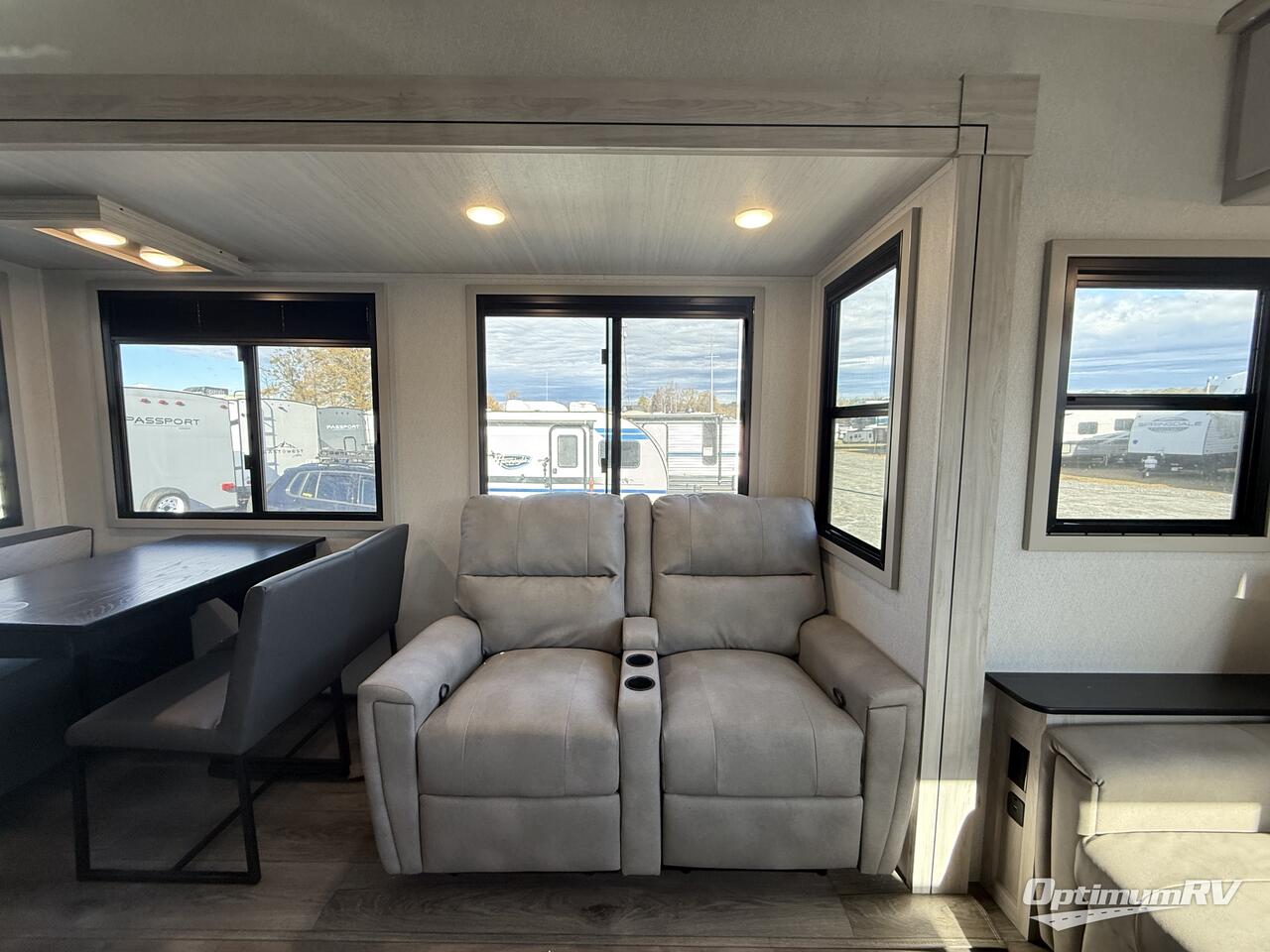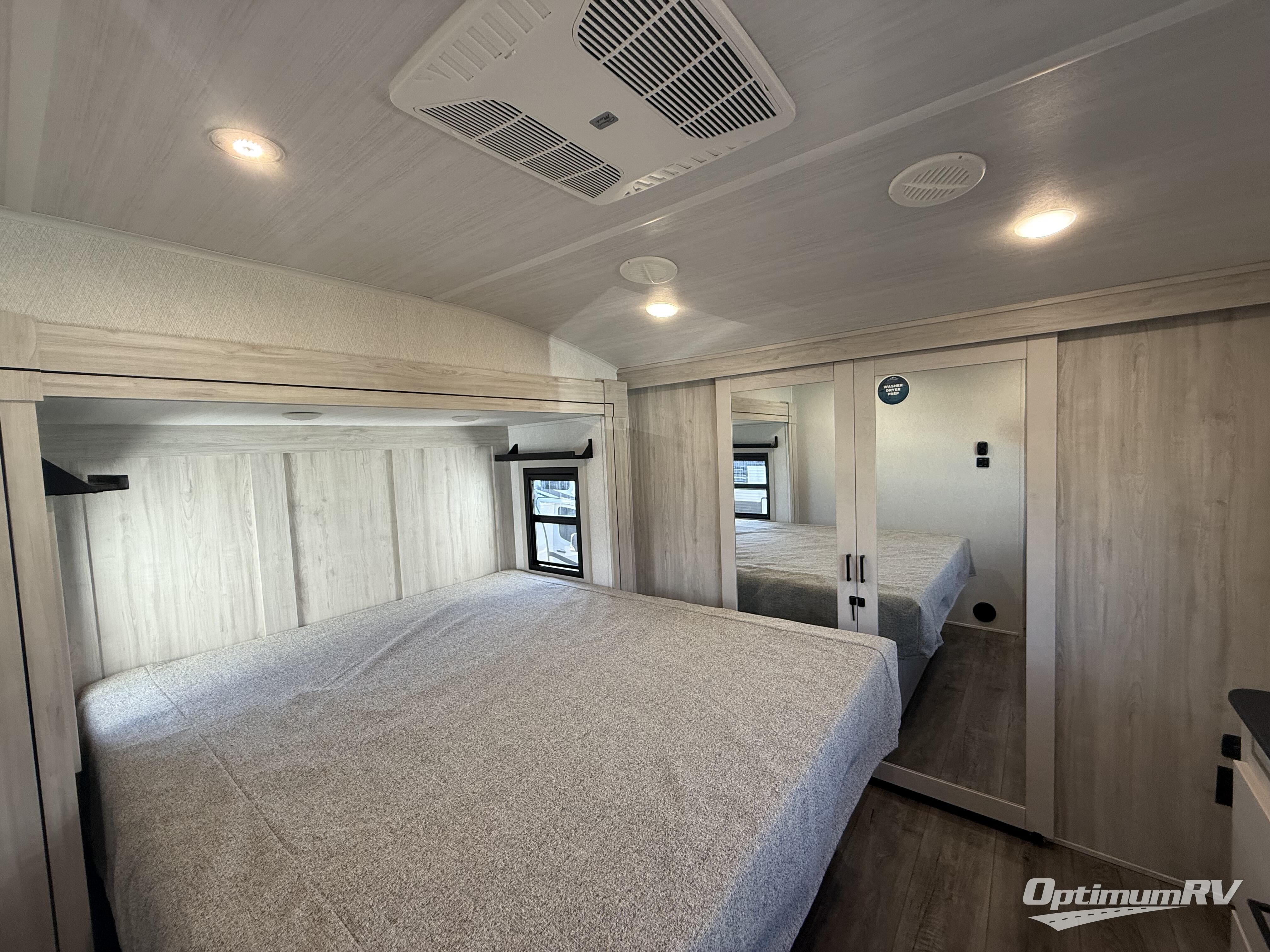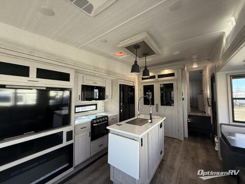 Take this Tandara fifth wheel out to the campsite and experience luxury while you camp! You will have a front private bedroom that is quite impressive with its full-width wardrobe, king bed slide with bedside shelves, under-bed storage, and a dresser with a TV prep area. The kitchen island is easy to gather around while you're cooking dinner or enjoying a late-night snack, and the hide-a-bed sofa will be comfortable for lounging or sleeping. As you spend time outside under the two electric awnings, you can grab some extra charcoal or camping chairs from the oversized pass-through storage.
