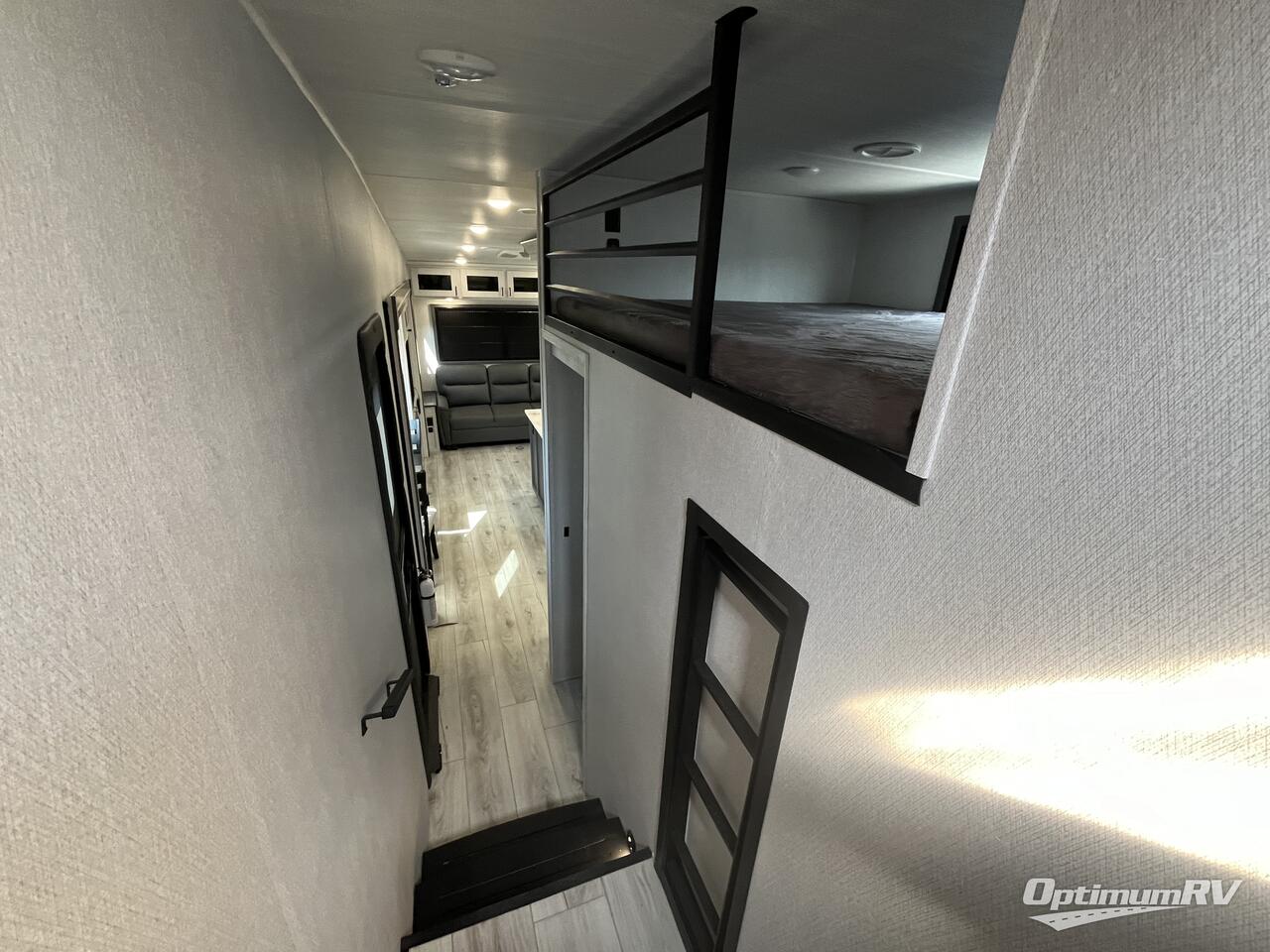 There is so much to fall in love with on this Tandara fifth wheel! From the front master suite with a full-width wardrobe and king bed slide to the spacious living area with opposing slides, theater seating, and a hide-a-bed sofa, there is quite a lot of comfort and convenience. The central bunkhouse comes with a fold-down bunk, hide-a-bed sofa, desk, and closet so that your kids or your guests can have some added space to work or play, and the loft above the bunkhouse adds room for more campers to sleep. Everyone will benefit from the 50" LED TV and fireplace, and the 16 cu. ft. 12V refrigerator is going to provide you with plenty of space to store your fresh fruits and veggies.
