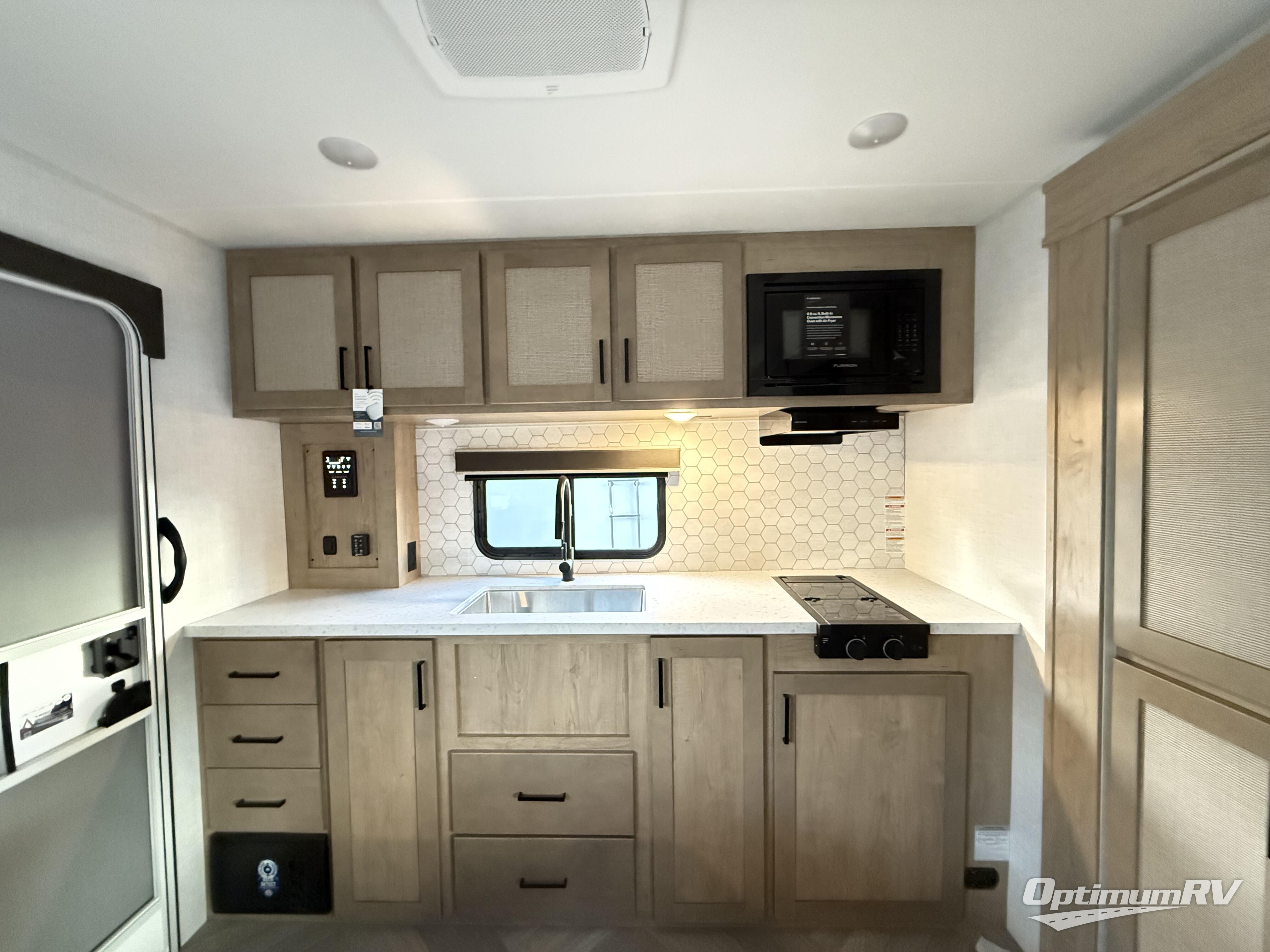 Are you looking for a travel trailer with plenty of interior space and lots of conveniences? Look no further than this E-Series unit! You can sleep three to four comfortably between the true residential queen bed in the front bedroom and the legless dinette, plus there is a walk-through bath that everyone can access easily. You'll also find the second entry door located in the master bedroom, along with dual nightstands and dual wardrobes to keep clothes wrinkle-free. After a day outdoors, you will love relaxing on the theater seating that is directly across from the HDTV to make it a movie night, and the legless dinette provides a place to dine, play games, and let a guest or two sleep over. And we haven't even mention the rear kitchen with tons of counter space, an air fryer convection microwave, a two burner cooktop, and a 10 cu. ft. 12V refrigerator!