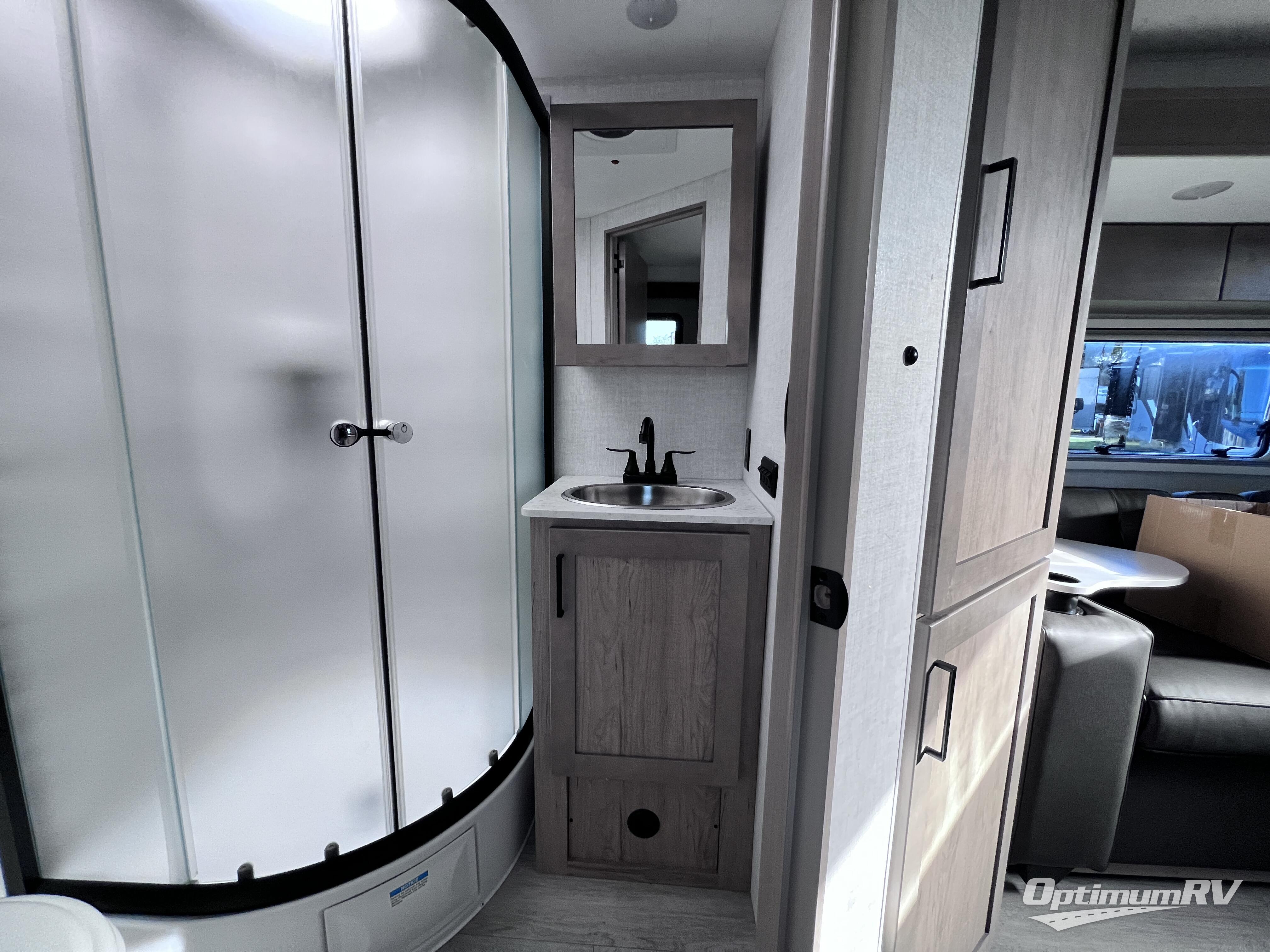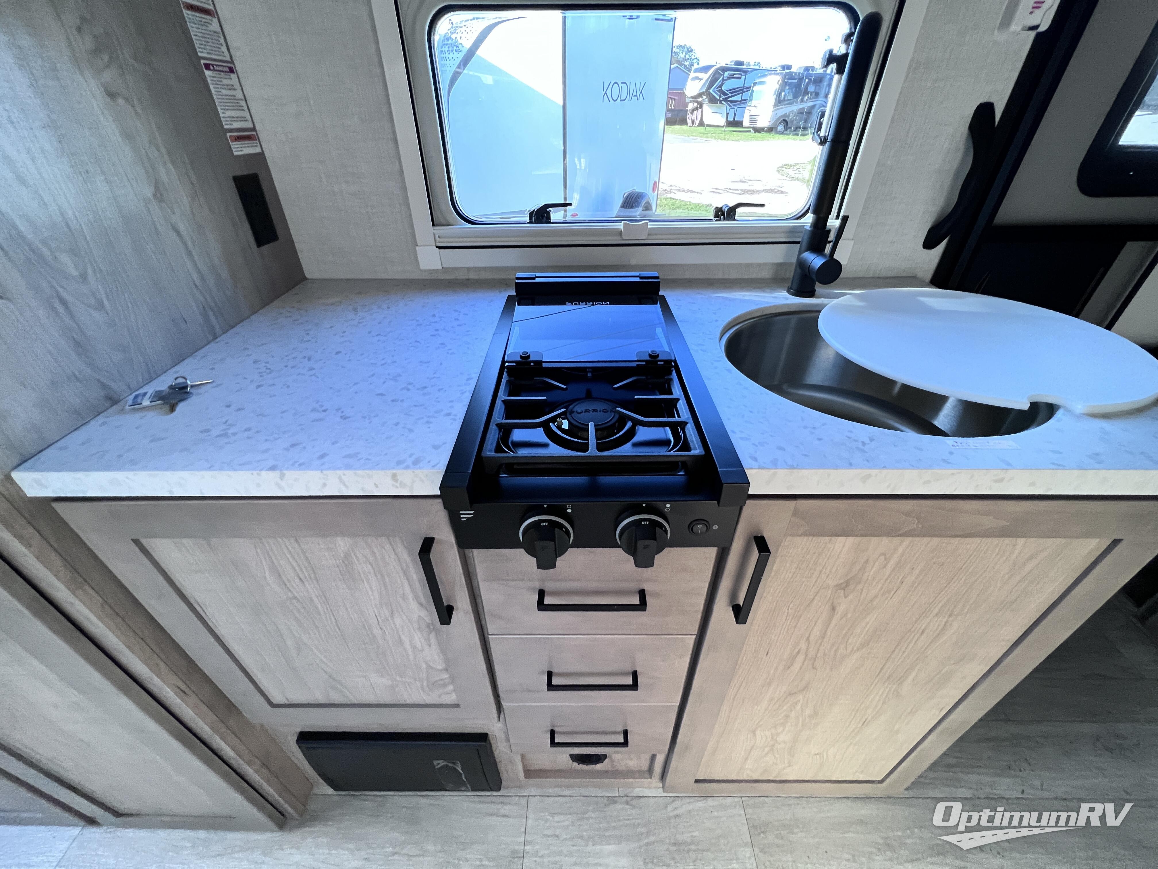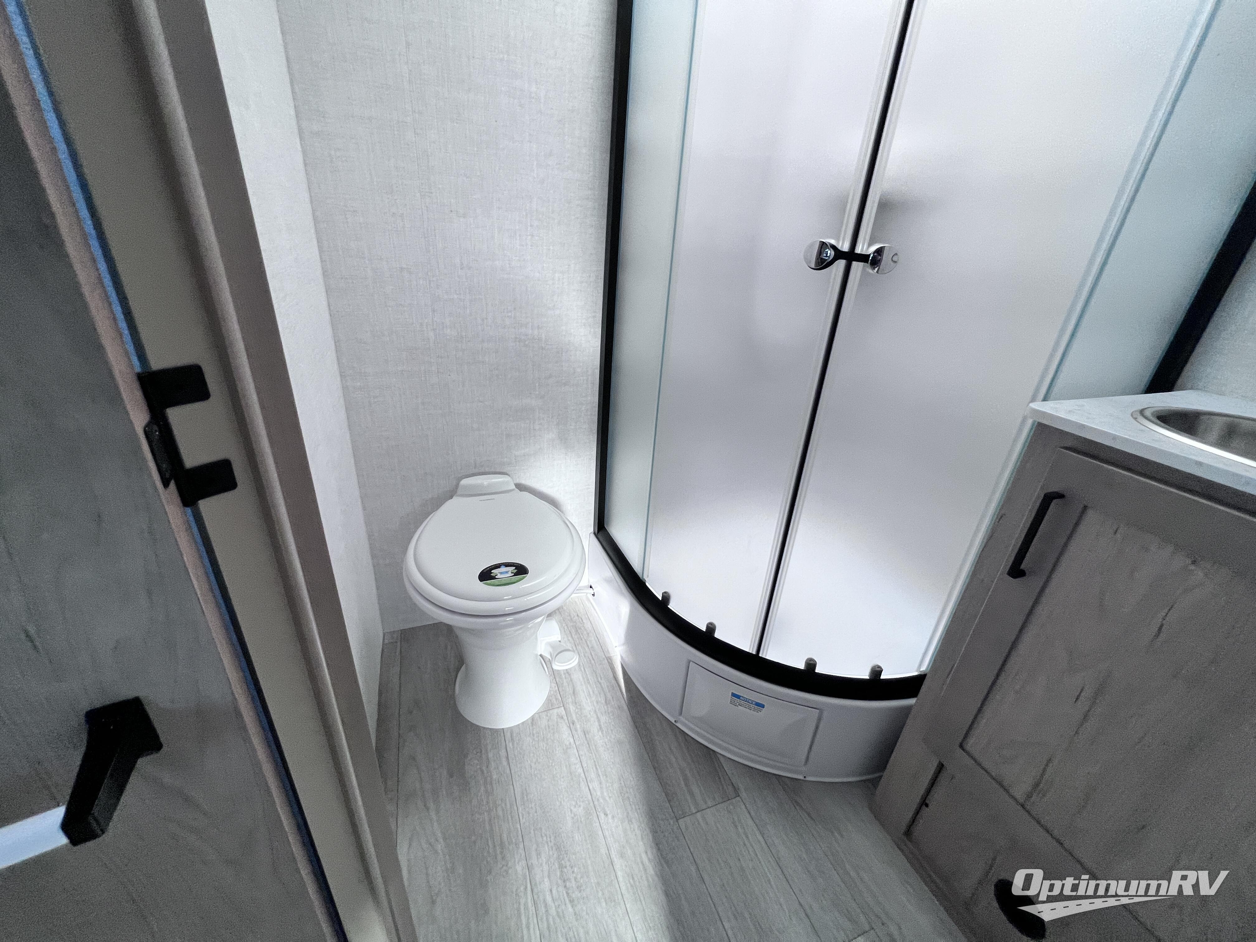 Head to your favorite campgrounds in this travel trailer! It features a front queen bed to lay your head on at night with nightstands and wardrobes on either side, plus an additional wardrobe and another hidden wardrobe behind the 12V HDTV/AV system on hinge. Prepare your best home cooked meals with the two burner cooktop and enjoy them at the jackknife sofa slide with a removable table. Behind the sofa are dual storage cubbies to keep your items out of the way too. With two pantries, you can bring all of your favorite snacks. You also have a rear corner bathroom with a 32" radius shower to rinse the sand out of your hair after a fun day at the beach!
