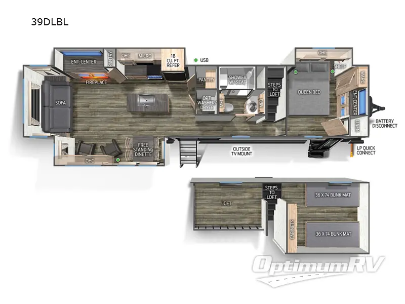 This Black Label destination trailer is an excellent and accommodating trailer that will make you feel right at home as soon as you enter through one of the two entry doors. The front private bedroom has a queen bed slide and lots of storage with the two wardrobes and linen closet. There is also an entertainment center where you can add your own TV thanks to the TV mount, and the bedroom even has the second exterior entry door so that you can come and go as you please. Above the bedroom is where the huge loft is located. When you take the stairs up to the loft, you'll find two 36" x 74" bunk mats, a nightstand, storage cabinets, and a large open area with a railing. The main living area has a free-standing dinette with chairs, two lounge chairs, a sofa, plus a fireplace to make this space feel more like home!