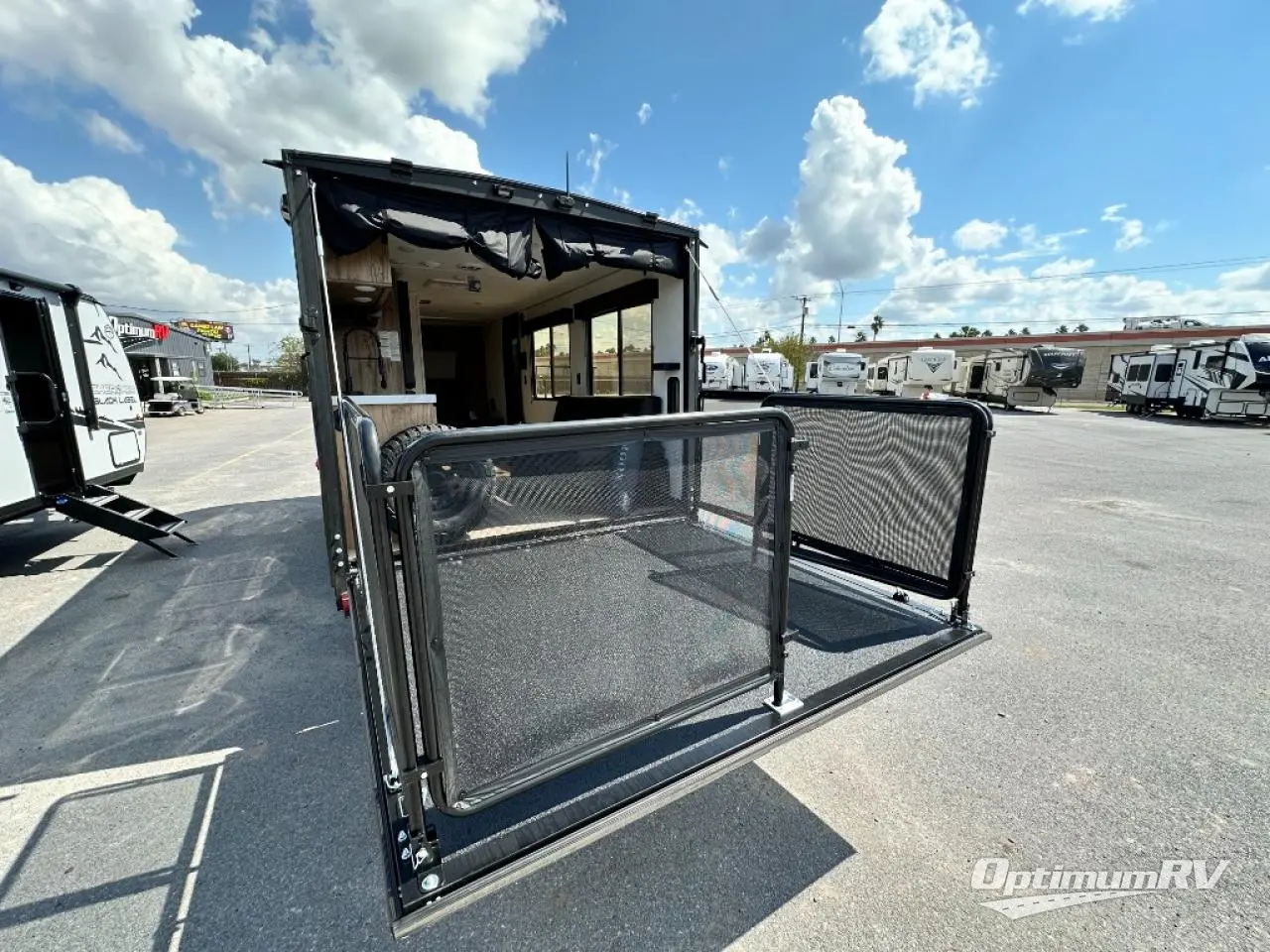 You will undoubtedly love this Cherokee Grey Wolf toy hauler! Because of its ability to have up to 15' 2" of cargo space, you can easily load up the ramp door and head out to your outdoor toy land, and you can bring much more than just your toys since this trailer also comes with exterior storage, a bedside wardrobe, overhead cabinets, an 10-cubic foot refrigerator, and a kitchen pantry. The full bathroom is another feature that is going to allow you to experience a true getaway since you won't need to find public facilities to use while you're gone, and the USB charging stations will allow you to charge your phone inside while you're outside playing.