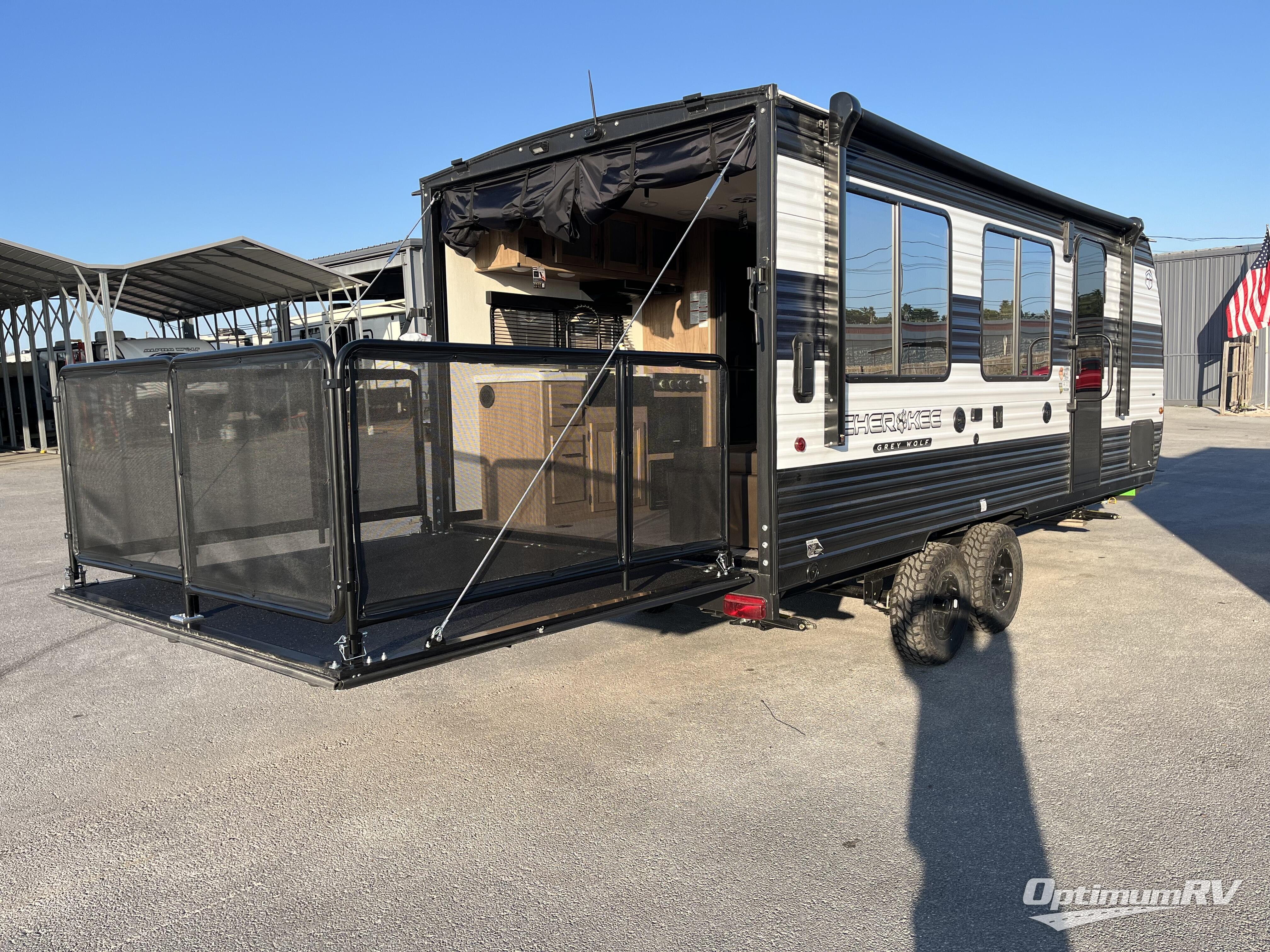 Whether it's a journey that will take you to new locations or a tried-and-true getaway to that favorite and memorable destination, the Forest River Cherokee Grey Wolf travel trailers and toy haulers are going to make the trip worth it every single time! You can travel in confidence with the premium wheel package, seamless roofing membrane with heat reflectivity, Power Gear frame technology with space-saver rail design, and Cherokee back-up camera system. The Cherokee Grey Wolf's interior is highly attractive with its stainless steel kitchen suite package and premium bedding ensemble and comforter. You will also find a black waste tank flush-out kit, an outside shower with hot and cold water, an armored underbelly tank enclosure, and an RV grill quick connect.