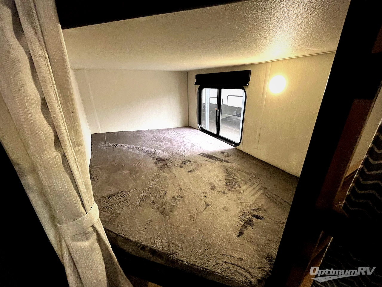 If you've been searching for a travel trailer with a larger sleeping capacity to camp with friends, this is the one! There are double-size bunks in the rear corner, and the full bath with its own exterior entry door is in the other rear corner for easy nighttime use. Up front, an RV king bed in the private bedroom is sure to bring a great night's rest, and you'll find dual bedside wardrobes to keep your clothes picked up off of the floor. In the morning, everyone can meet in the main living room that includes a large slide out, U-shaped dinette, sofa, and a fireplace with a hidden pantry behind it for smart storage solutions. There is also a TV mount here for the option to bring along your television. An outside mini kitchen will allow you to get some fresh air as you make dinner, but there's also a full interior kitchen if the weather isn't cooperating. Additional outdoor features include a rear storage rack, an outside TV mount, and a 9' power awning for some shade!