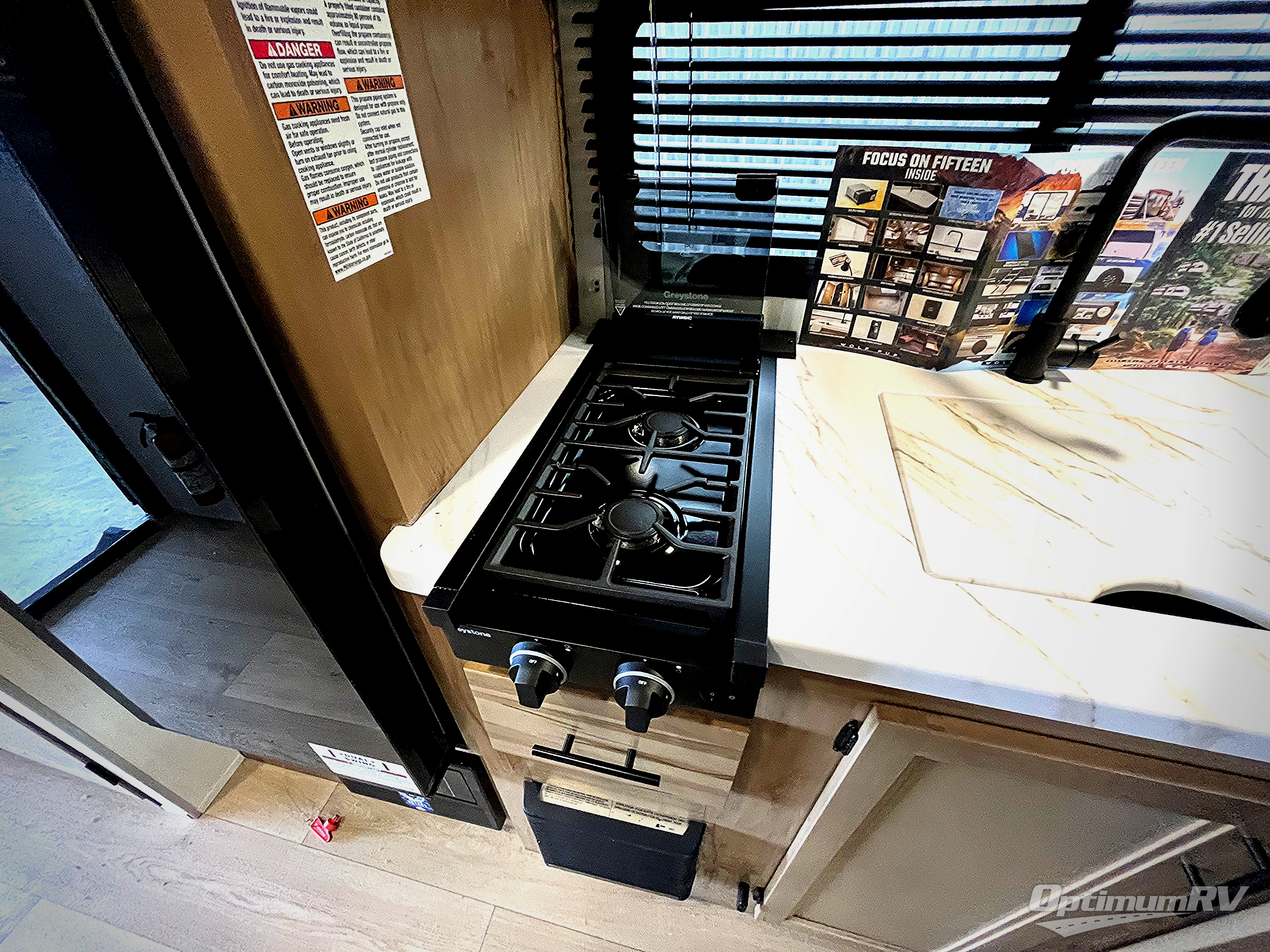 There are lots of features packed into this 19' travel trailer! The rear entry design creates a split bathroom for one person to use the private toilet while another freshens up in the private shower. You can prepare your best home cooked meals with the high output cooktop, the 12V high efficiency refrigerator, and a sink to make clean up easier, plus you can comfortably enjoy your meals at the booth dinette with a TV mount location. The front queen bed provides a comfortable place to lay your head at night. Store your outdoor gear in the outside storage area, rinse the mud off your feet with the outside shower, and watch the big game outdoors with the outside TV mount!