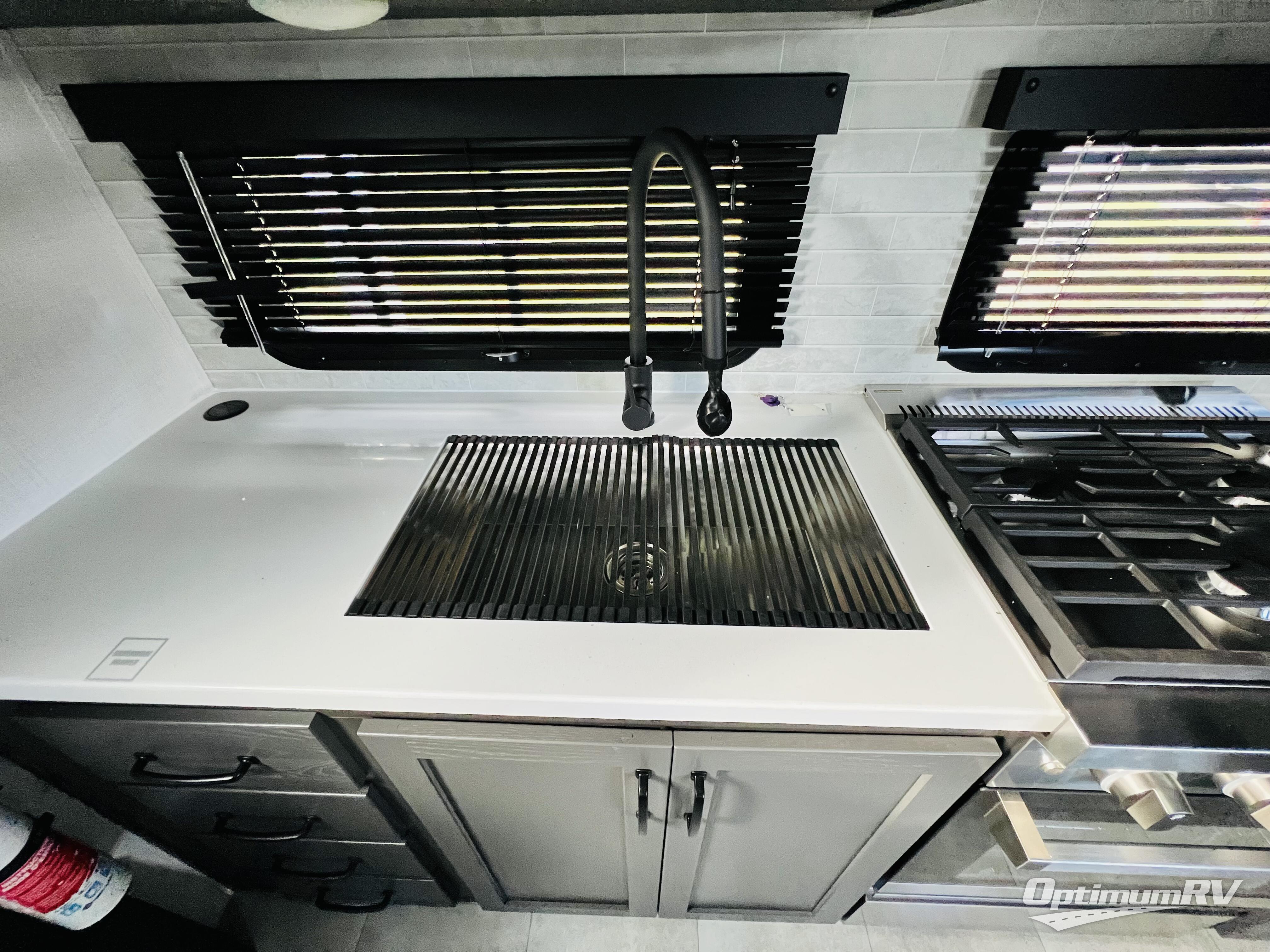 This rear kitchen fifth wheel is the perfect couple's trailer with space for an overnight guest on the booth dinette. There is a front private bedroom with a queen bed where you'll get a great night's rest, and in the morning you can relax on the theater seat with your coffee. The chef of your group will appreciate ample counter space to prep meals, and if the weather is nice, you might want to take your plate outdoors to eat under the 20' power awning.