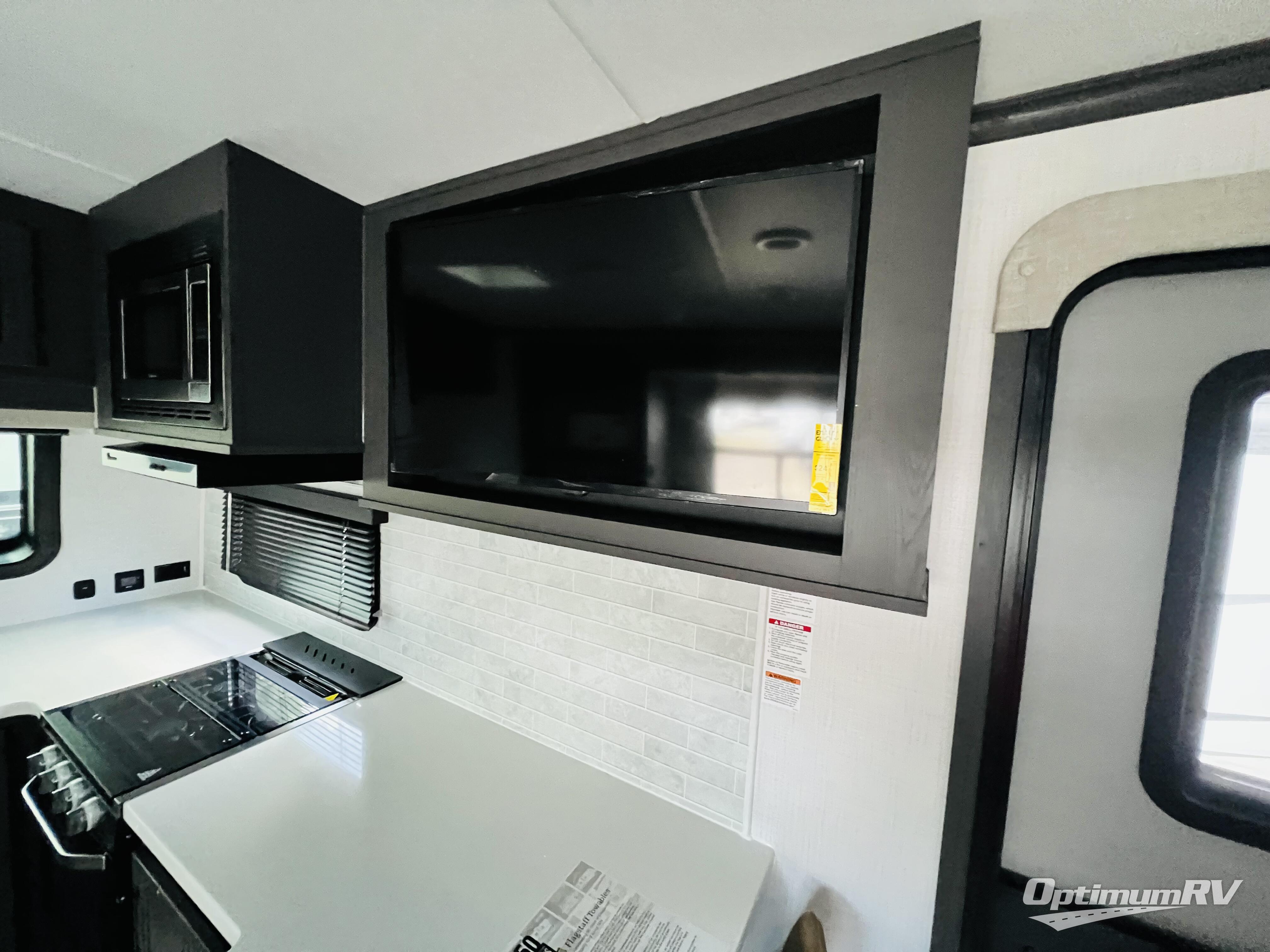 You will love how open this travel trailer will feel with the large front window that you can look out from the two-person bar top seating! The front kitchen has plenty of countertop space for you to prepare your best meals. Your nights will be spent in true relaxation with a 67" theater seating and king bed slide in the bedroom for a great night's rest. The full rear bathroom has a shower with a seat to take a nice, hot shower before bed, and a dual-sink vanity for two to get ready at once in the mornings!