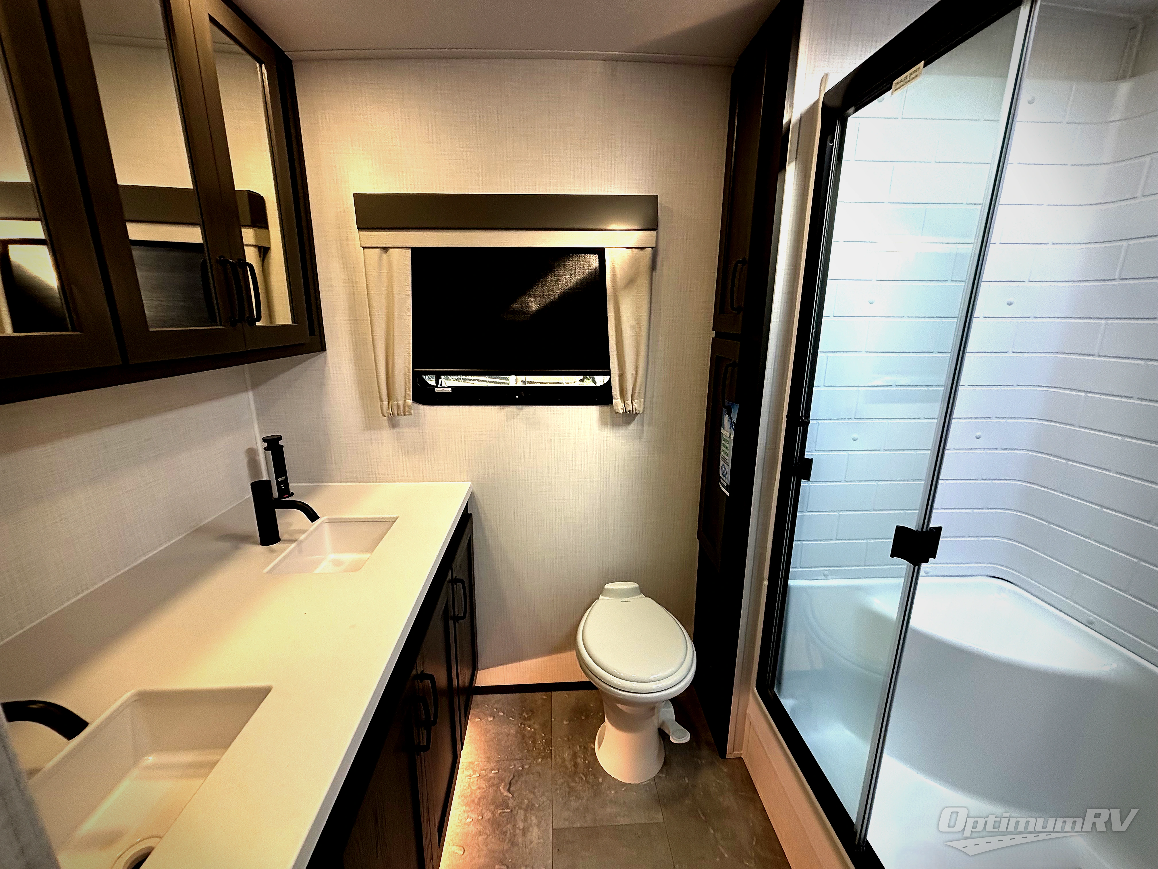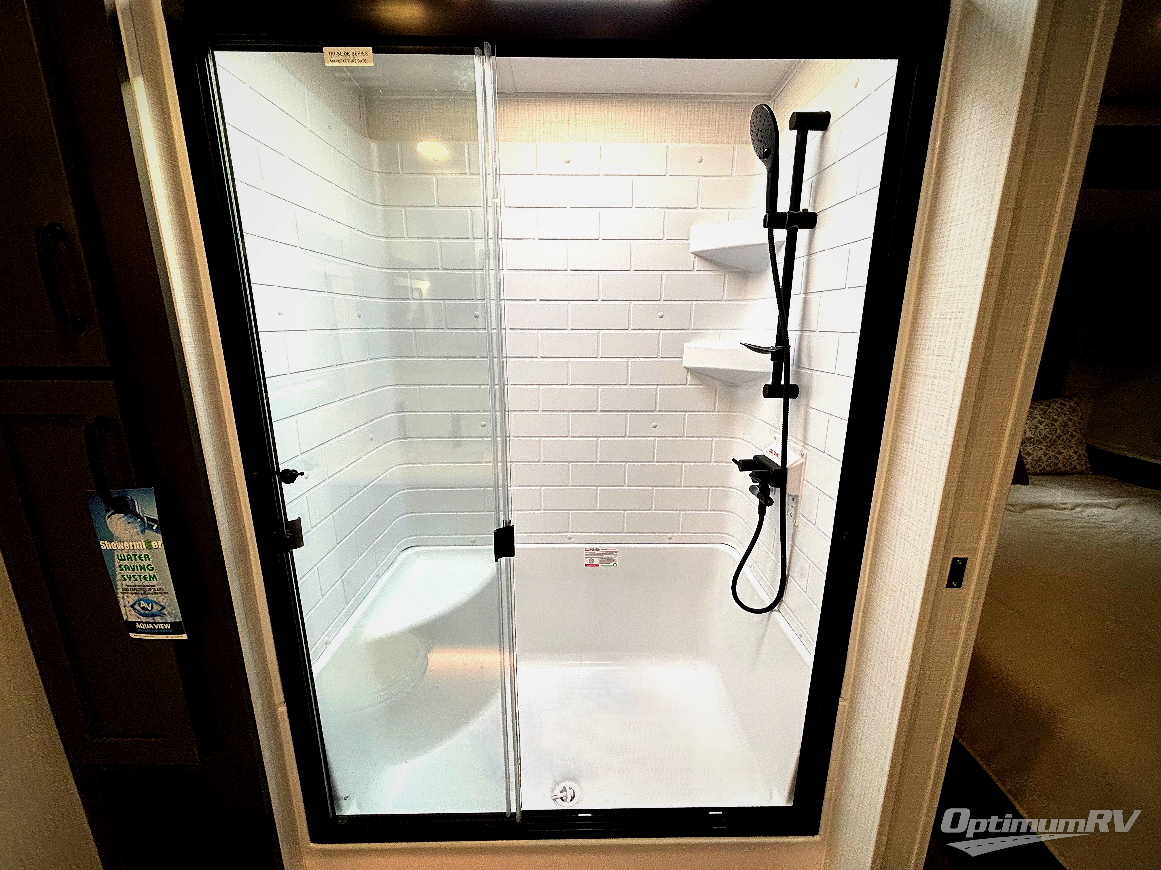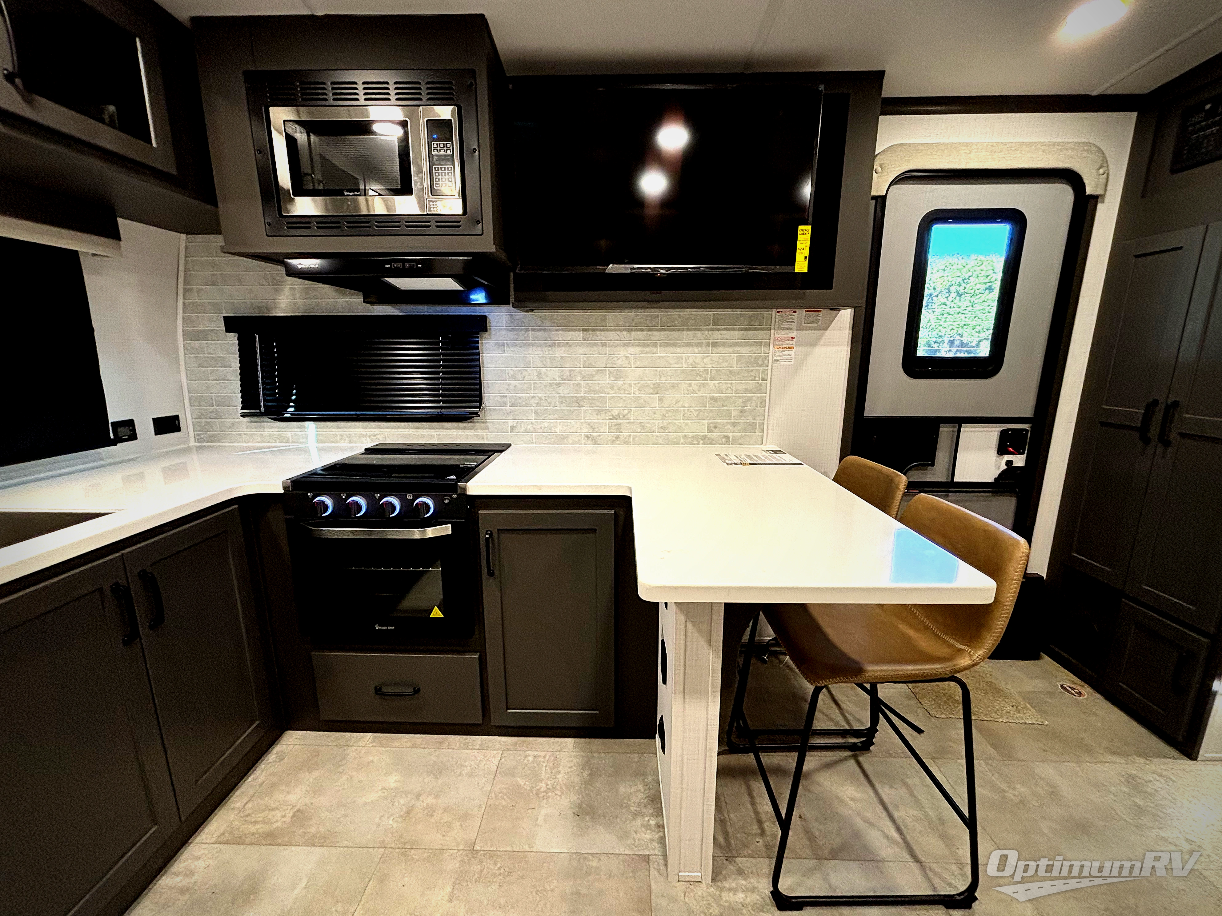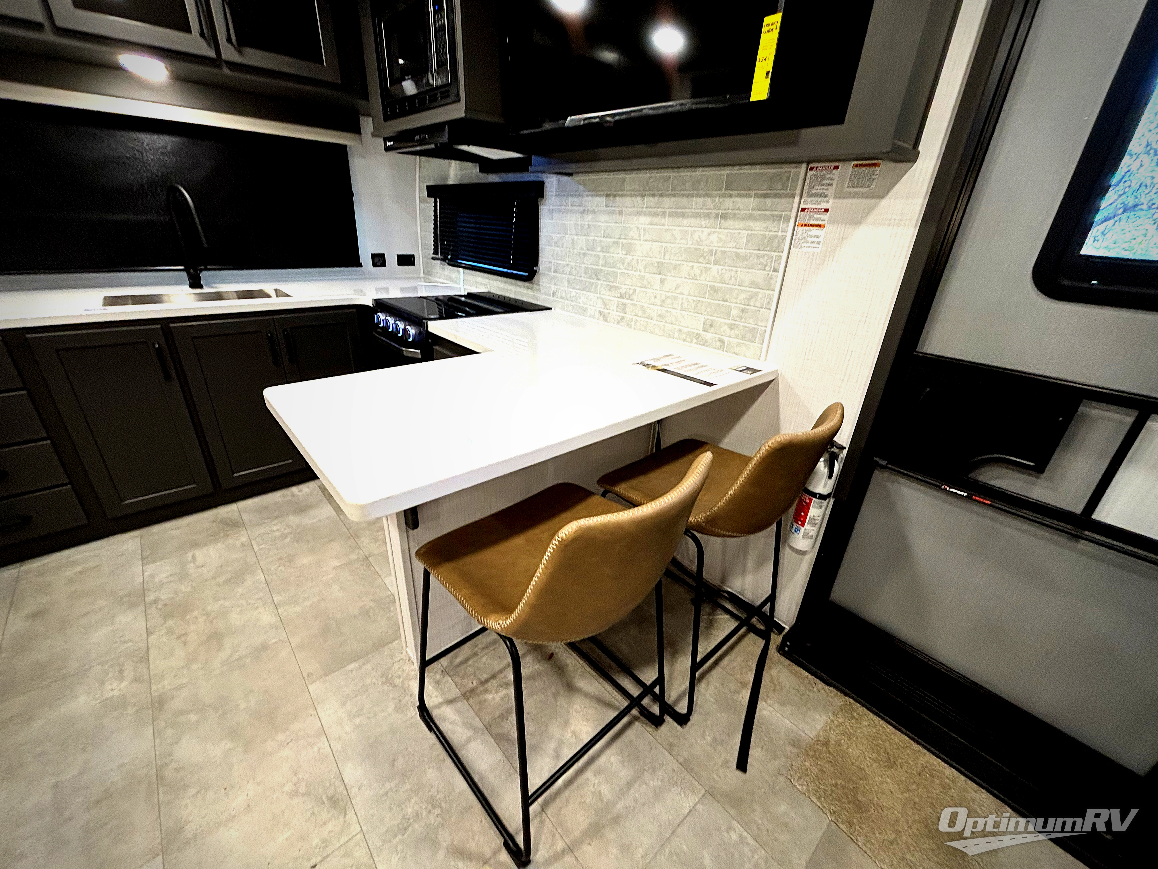 You will love how open this travel trailer will feel with the large front window that you can look out from the two-person bar top seating! The front kitchen has plenty of countertop space for you to prepare your best meals. Your nights will be spent in true relaxation with a 67" theater seating and king bed slide in the bedroom for a great night's rest. The full rear bathroom has a shower with a seat to take a nice, hot shower before bed, and a dual-sink vanity for two to get ready at once in the mornings!