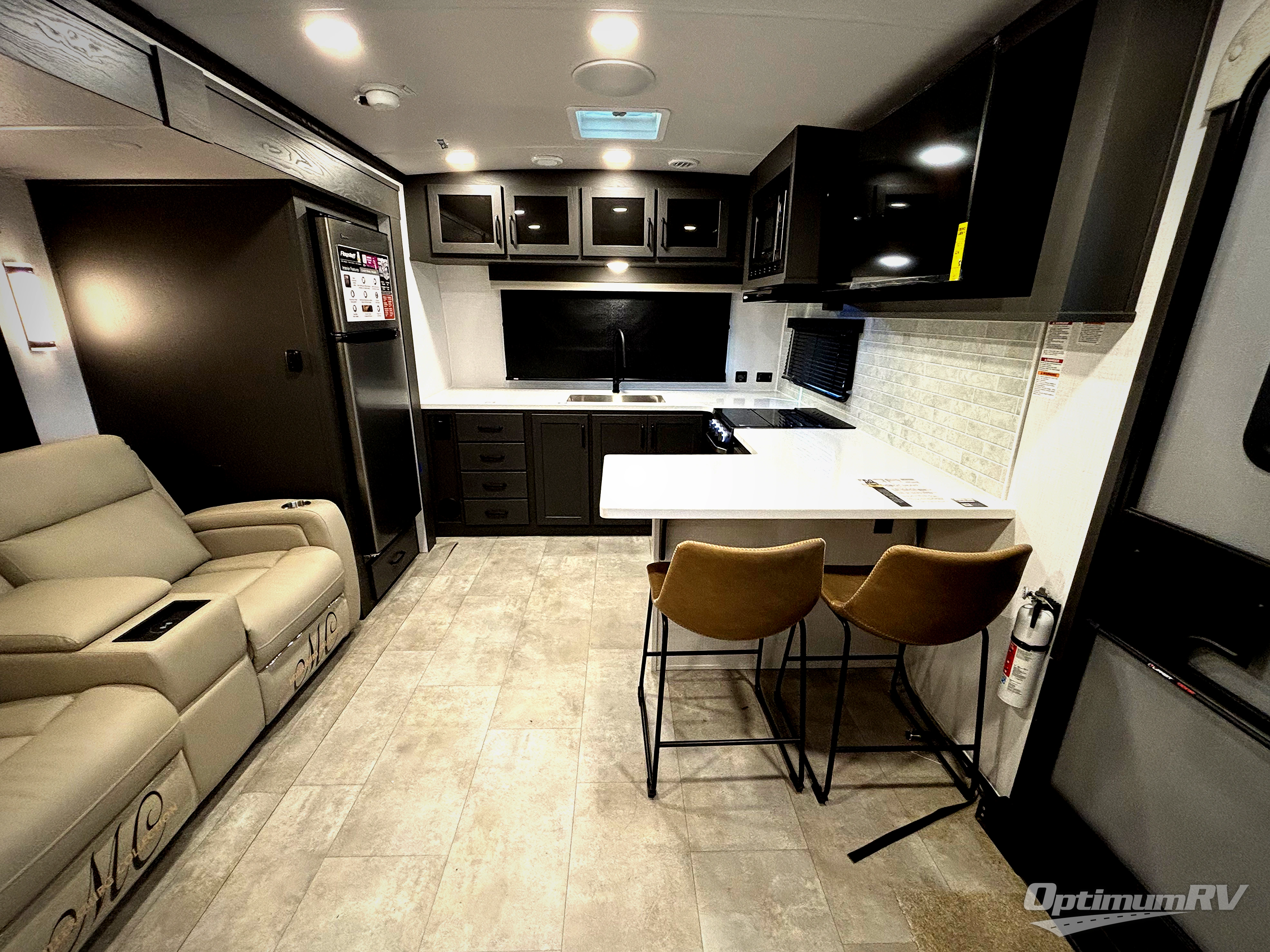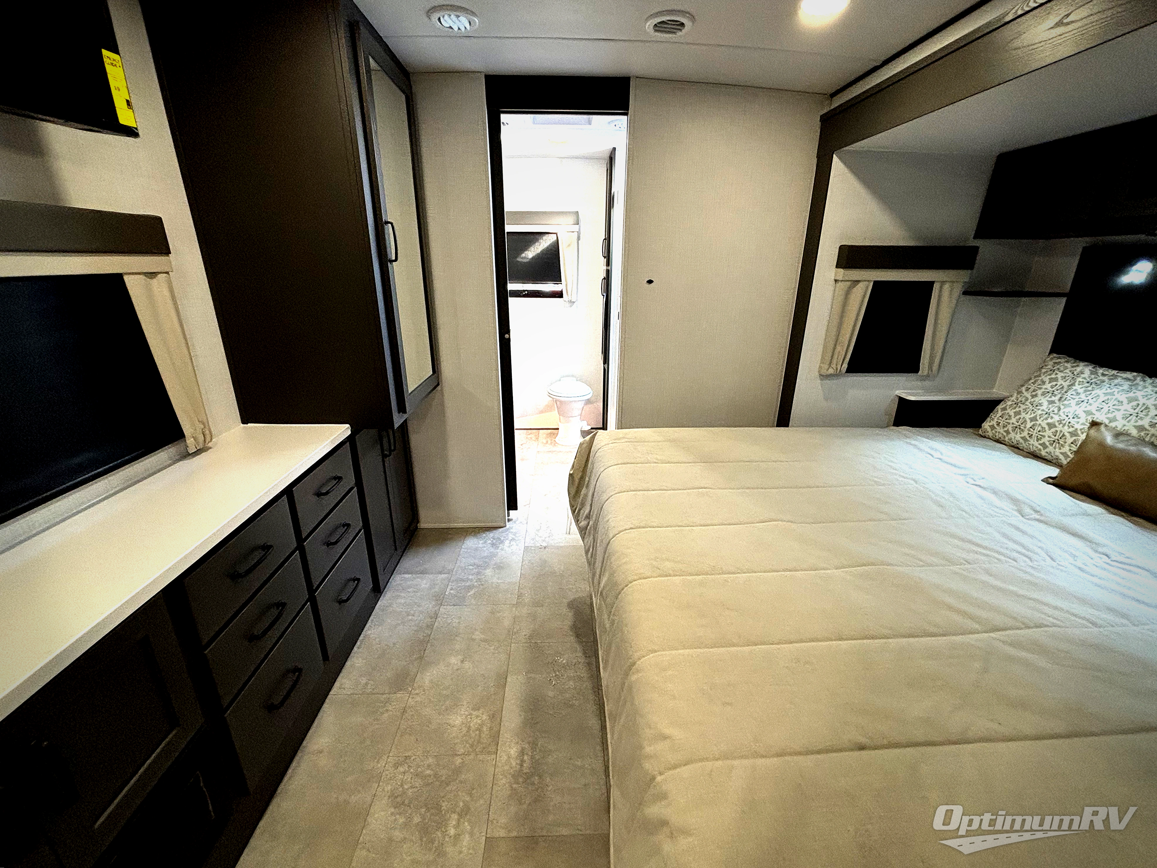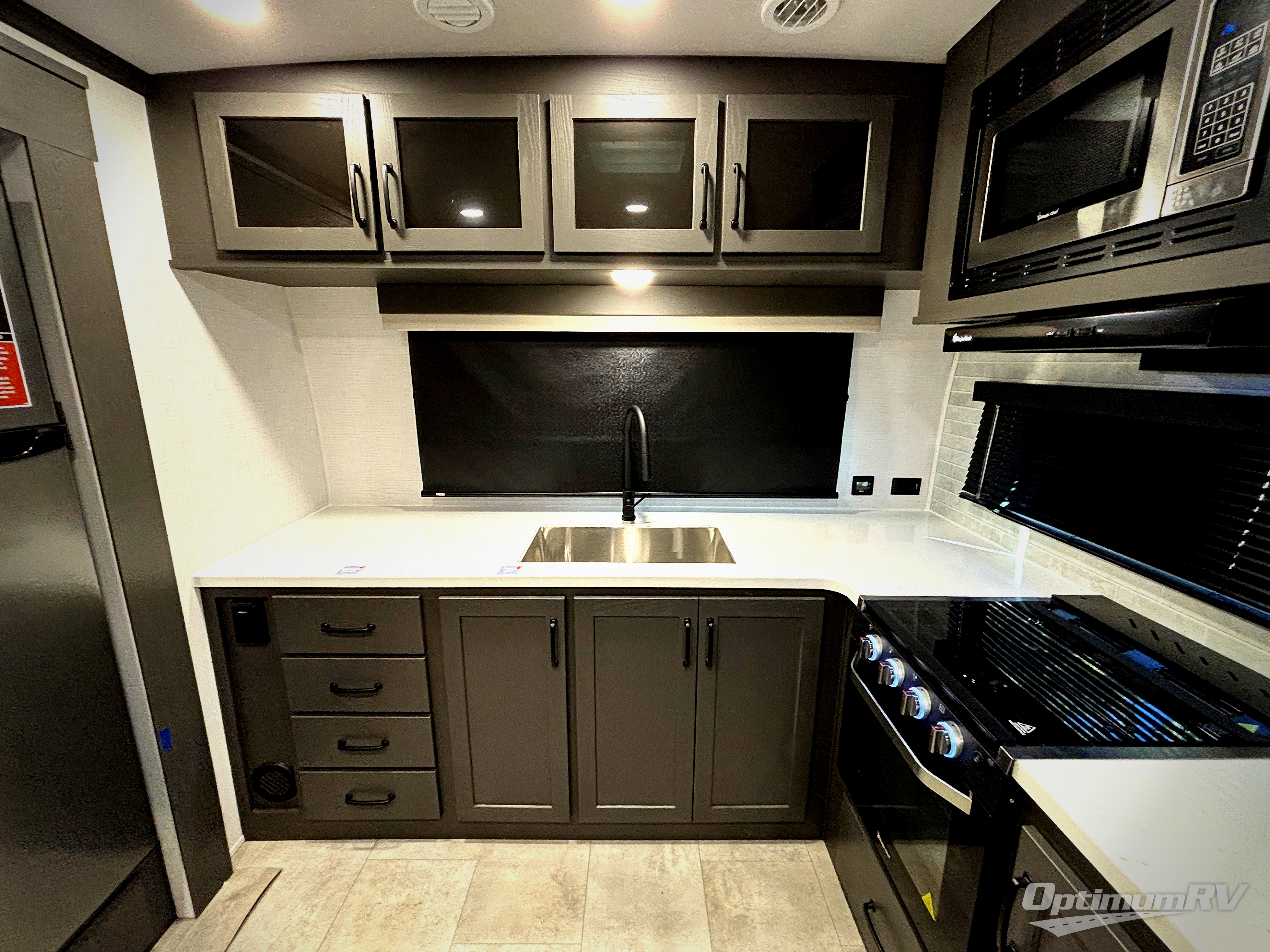 You will love how open this travel trailer will feel with the large front window that you can look out from the two-person bar top seating! The front kitchen has plenty of countertop space for you to prepare your best meals. Your nights will be spent in true relaxation with a 67" theater seating and king bed slide in the bedroom for a great night's rest. The full rear bathroom has a shower with a seat to take a nice, hot shower before bed, and a dual-sink vanity for two to get ready at once in the mornings!