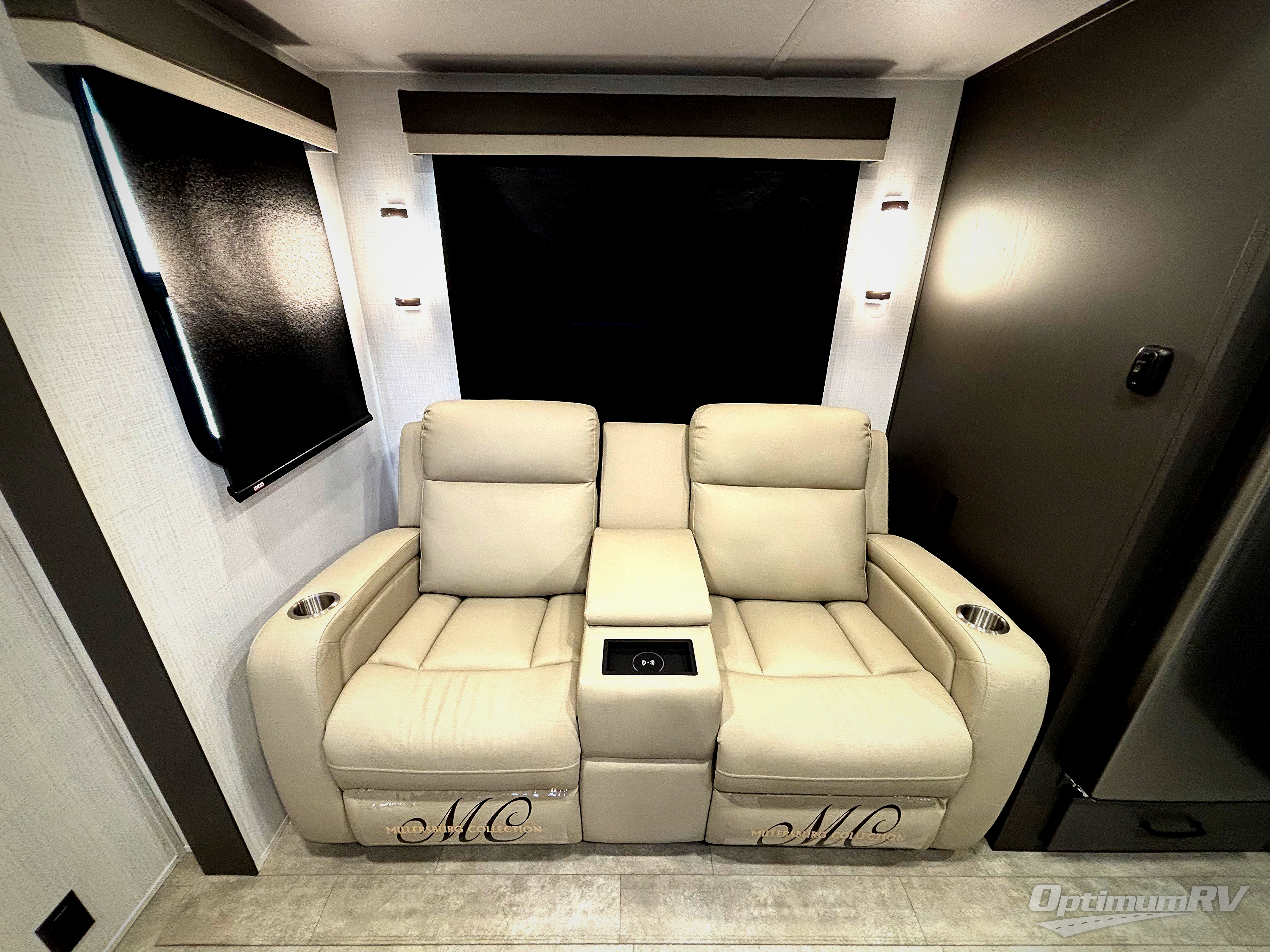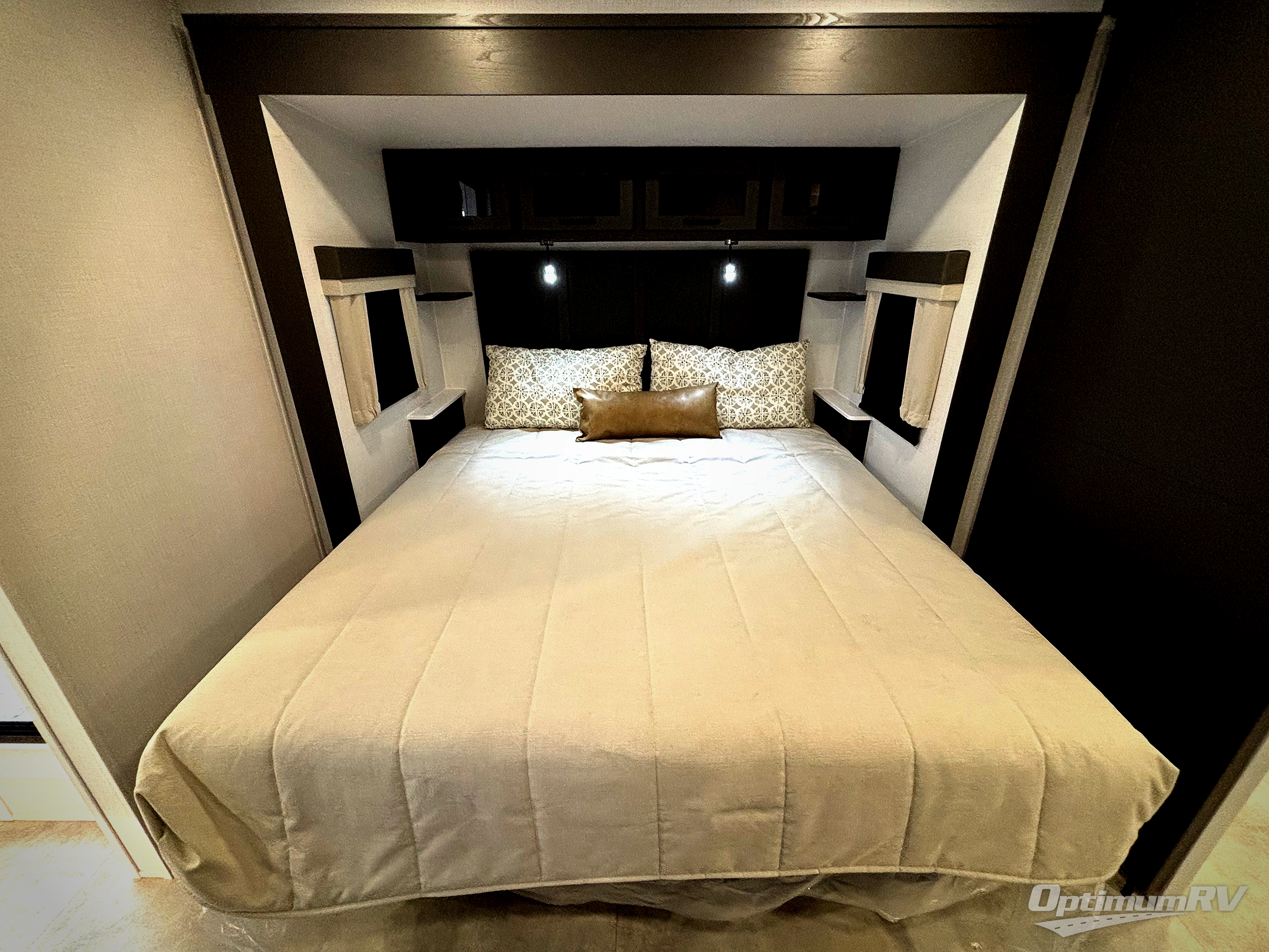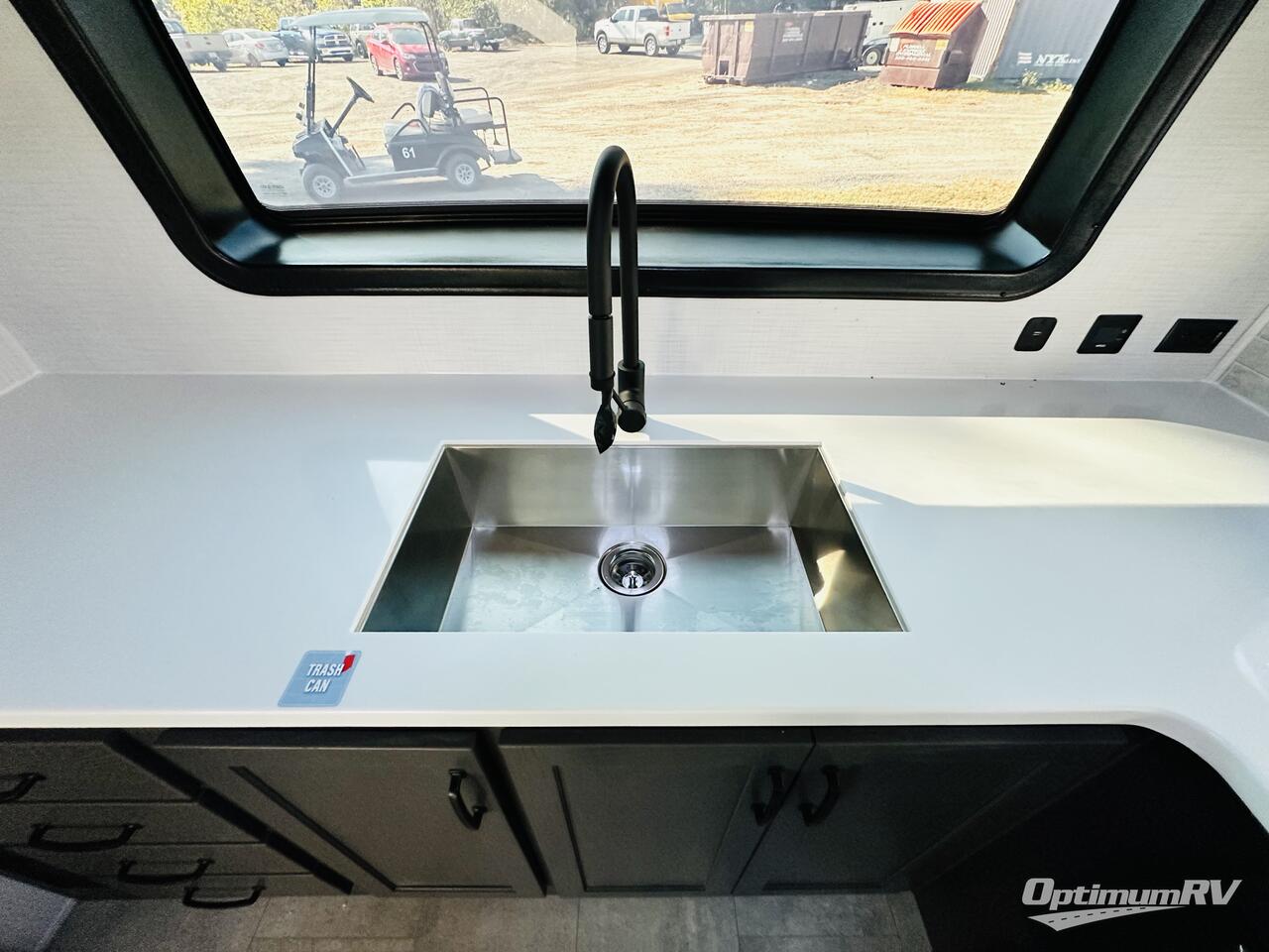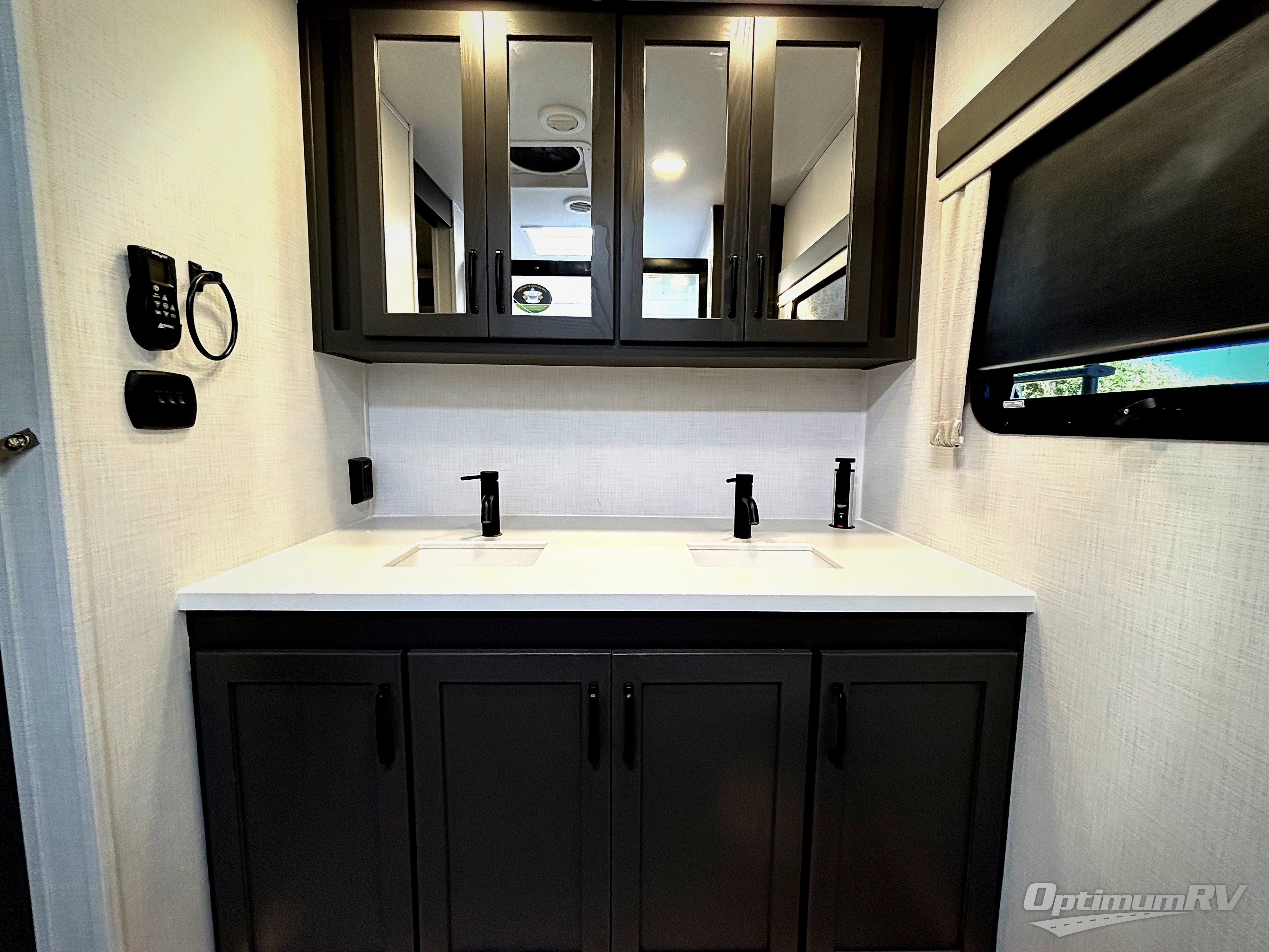 You will love how open this travel trailer will feel with the large front window that you can look out from the two-person bar top seating! The front kitchen has plenty of countertop space for you to prepare your best meals. Your nights will be spent in true relaxation with a 67" theater seating and king bed slide in the bedroom for a great night's rest. The full rear bathroom has a shower with a seat to take a nice, hot shower before bed, and a dual-sink vanity for two to get ready at once in the mornings!