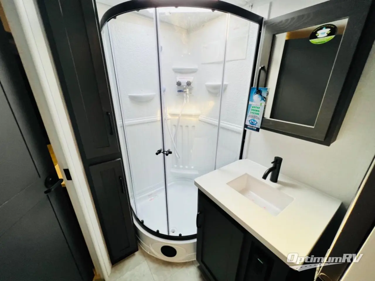 This is the perfect couples trailer with a spacious living and kitchen area and a rear bedroom which includes the second exterior entry/exit door! The bedroom also provides a slide out queen bed, a wardrobe and an optional TV, plus windows for great views and access to the double entry bathroom. The front kitchen gives the cook counter space and cabinetry for dishes and such, plus all the appliances needed to make warm meals and store leftovers. You can dine at the booth dinette, relax on the 67" theater seating and watch the Smart TV while enjoying the fireplace.