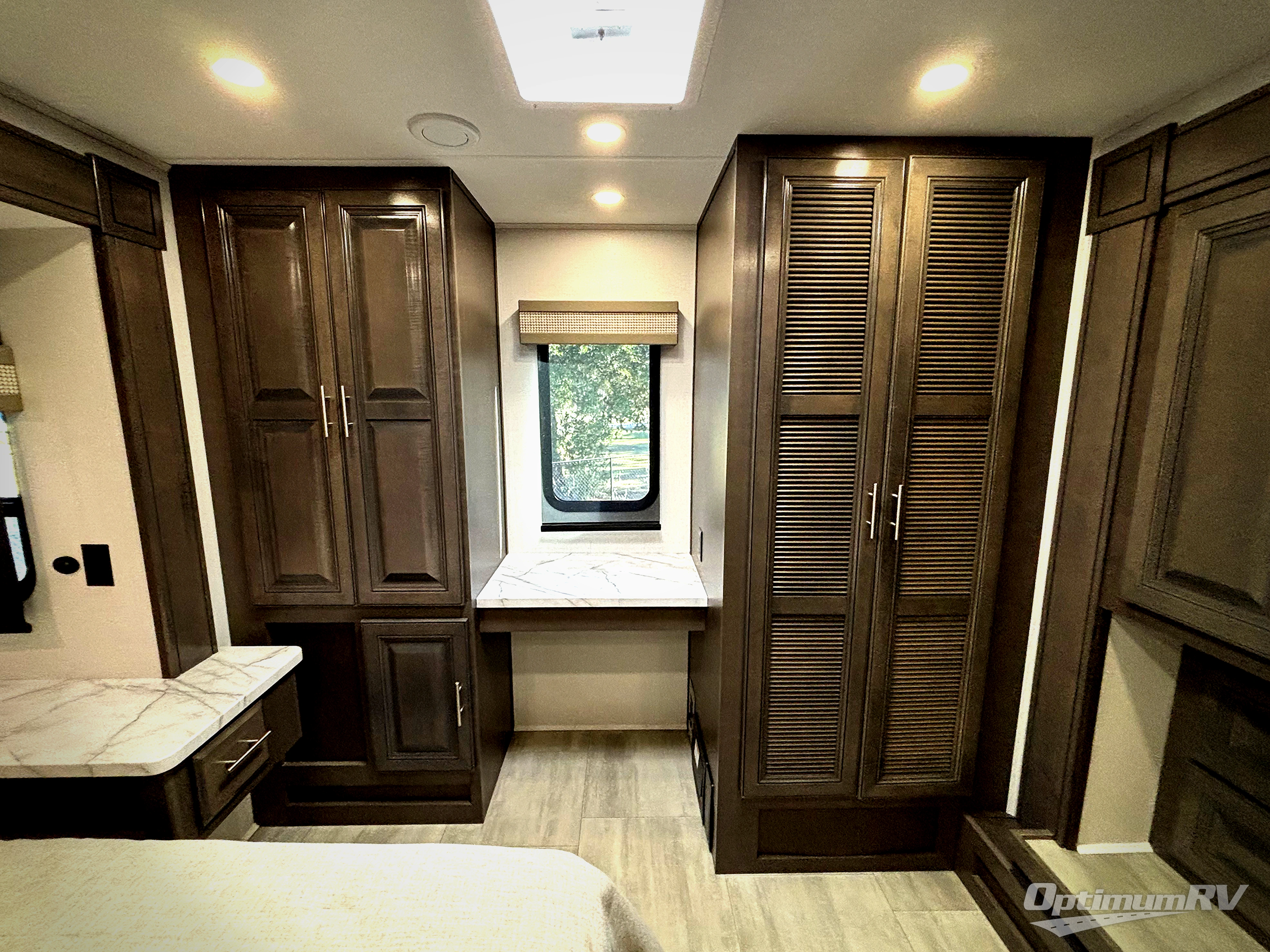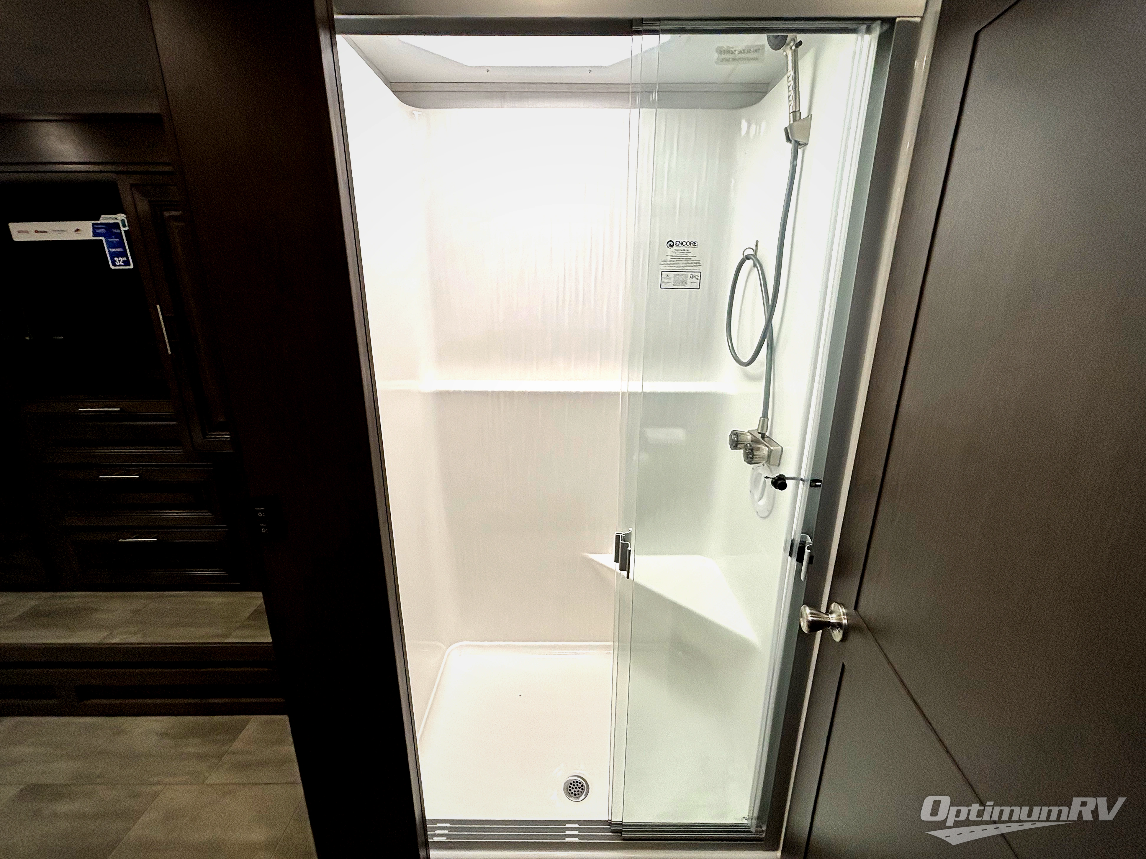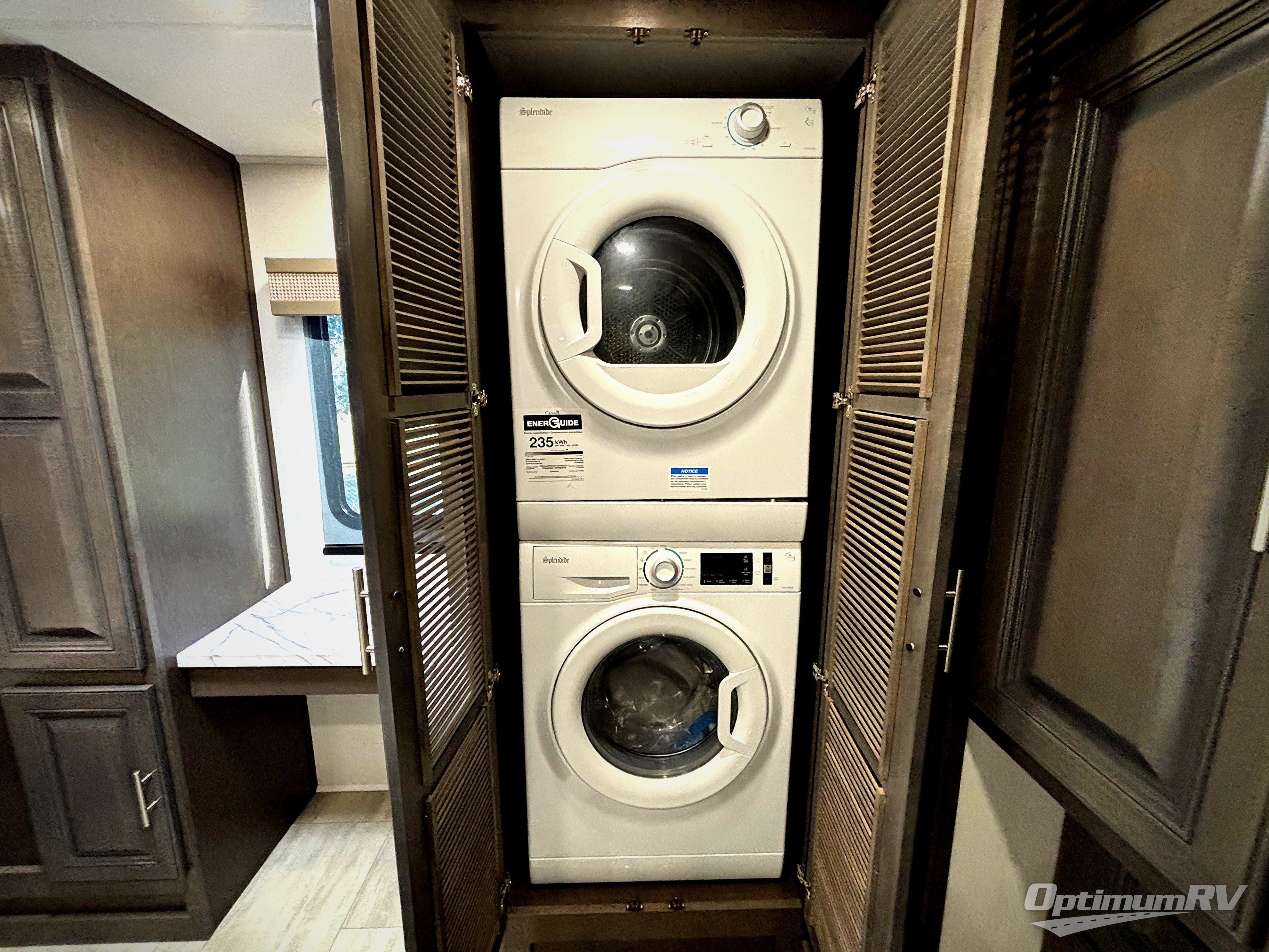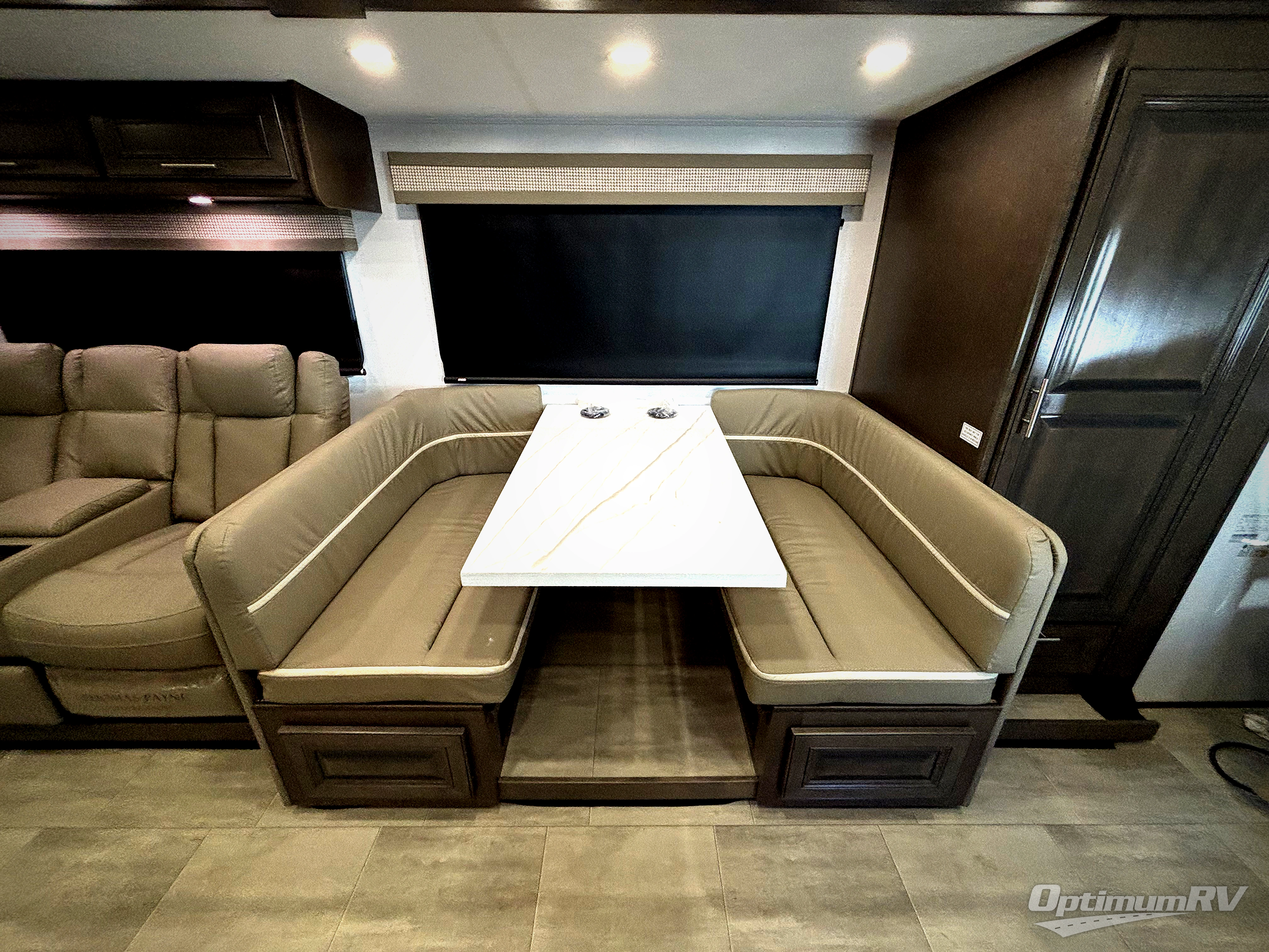 You won't believe all that the rear private bedroom has to offer in this motorhome! It features a 72" x 80" king bed slide with overhead cabinets, a dresser with a 32" TV and overhead cabinets, wardrobes on either side of the dresser, and a desk with wardrobes on either. And one of the wardrobes features an optional stacked washer and dryer for convenience! The split-style bathroom makes it easy for one person to freshen up in the shower with a seat while another uses the private toilet and sink. After a long day of traveling, you can relax on either the Thomas Payne theater seating with heat and massage across from the 5,000 BTU fireplace with a 40" LED TV above it or play a game and eat a meal at the Dream Dinette. There is also a power front overhead bunk for more sleeping space!